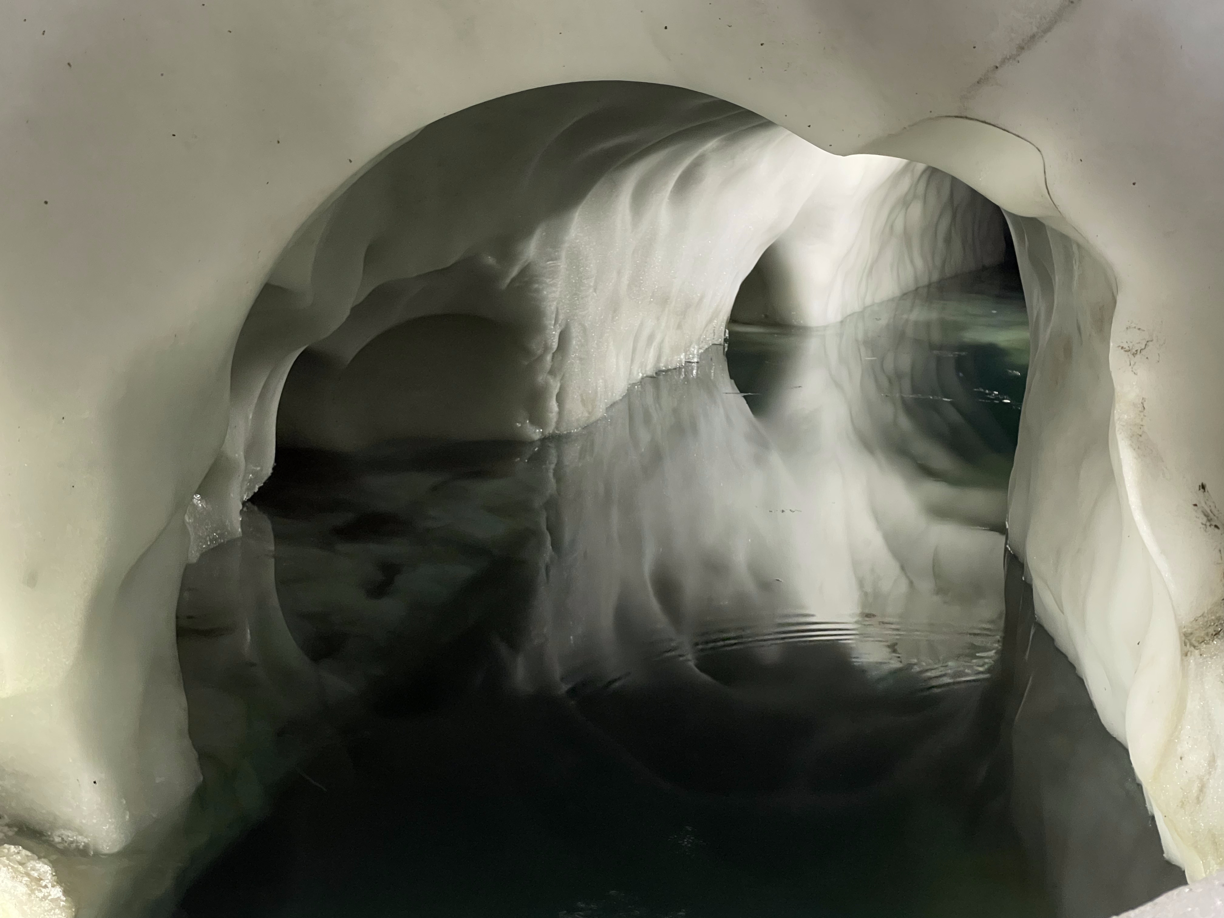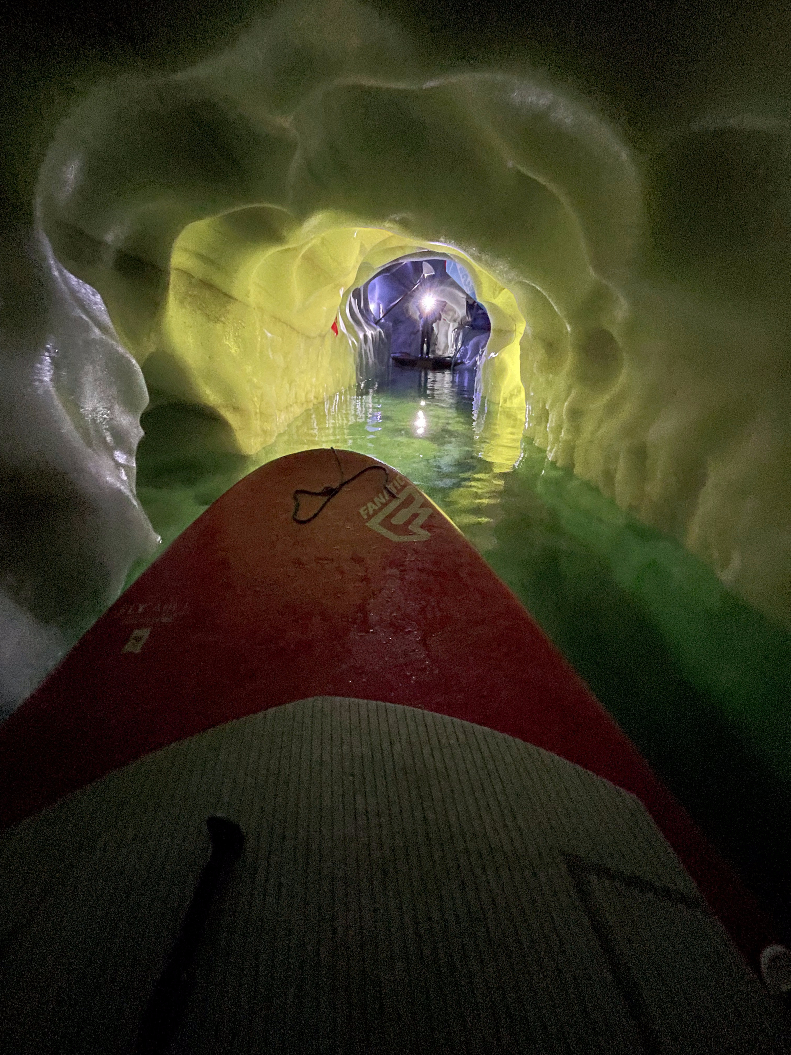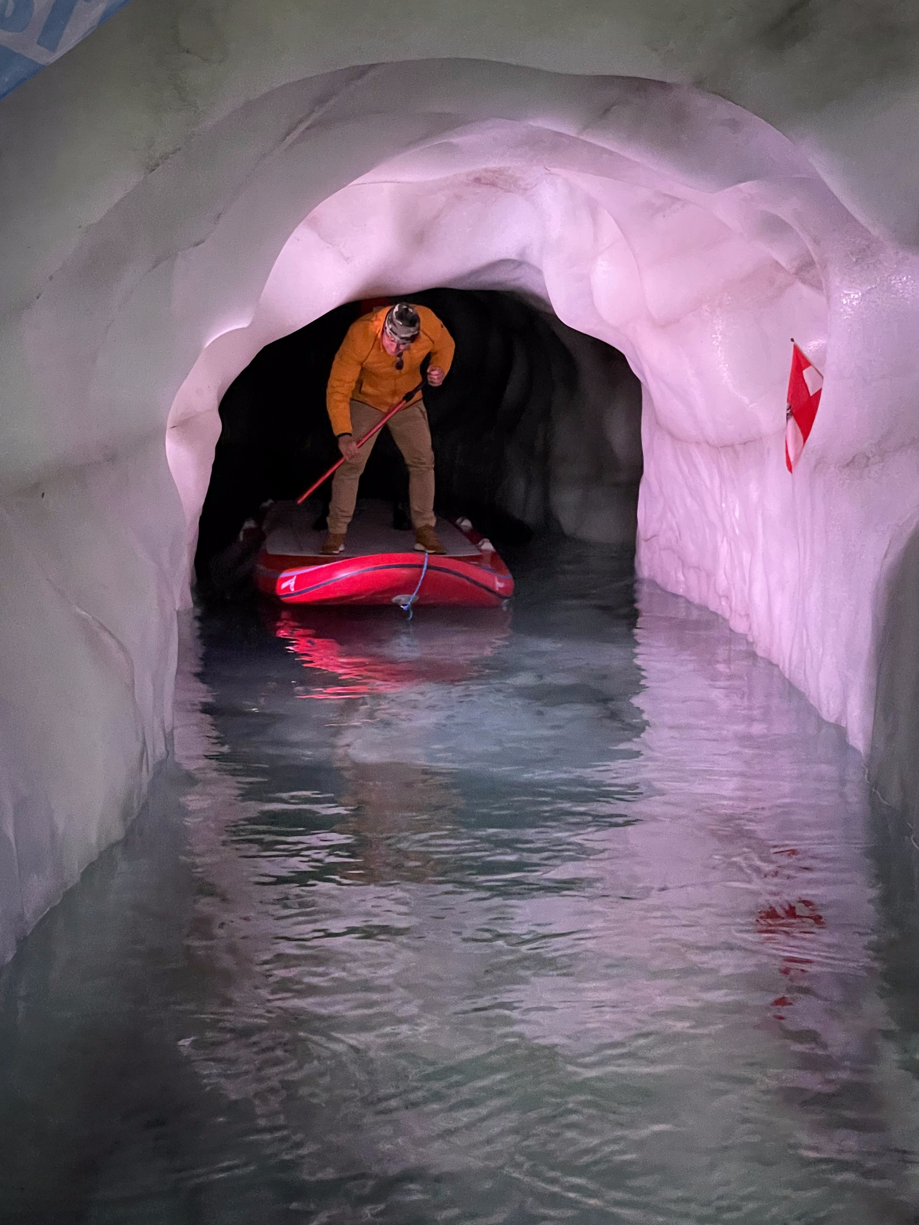 I had been to Eispalast before. It is an ice cave that tourists can visit, 30 meters under glacier, near the top of the Gefrorene Wand mountain in Hintertux, Austria. But when I saw they had an option for trying SUP boarding on the river or lake in the ice cave, I knew I had to go again.