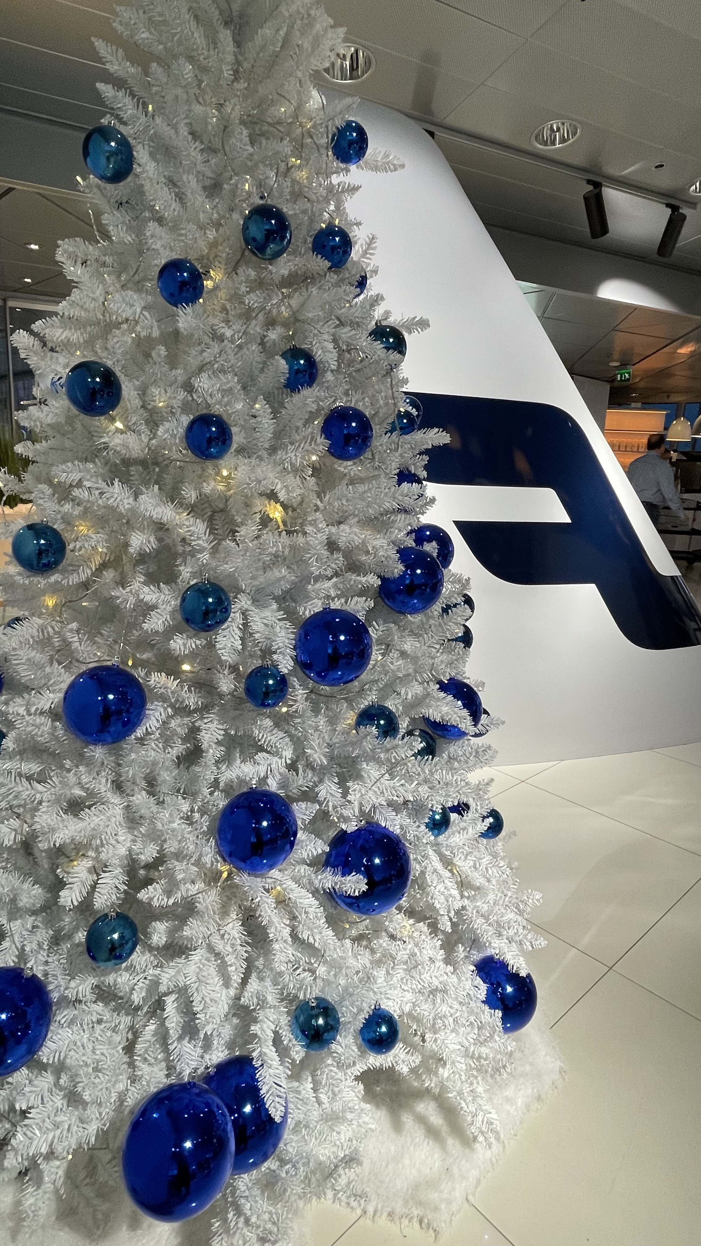 "It's possible that the blue balls hanging from the white Christmas tree in the Finnair lounge at the Helsinki-Vantaa airport are a nod to Finnair's color scheme, as blue is one of the airline's main colors. Additionally, blue and white are also the colors of the Finnish flag, so it could also be a reference to the country's national colors."