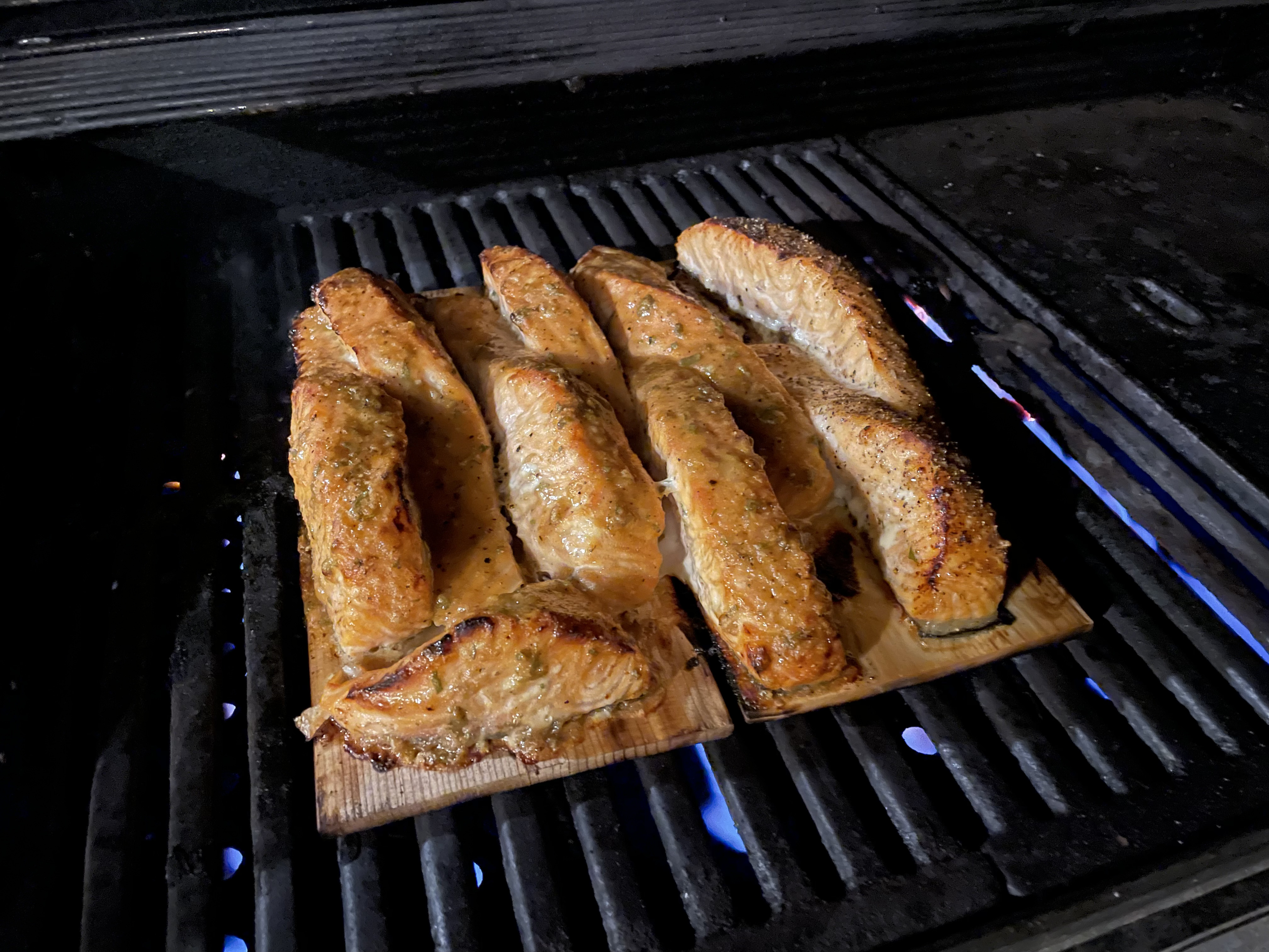 Time for some seafood in the menu, I guess. How about salmon, cooked on cedar planks soaked in rosemary and water, with a secret sauce on top?