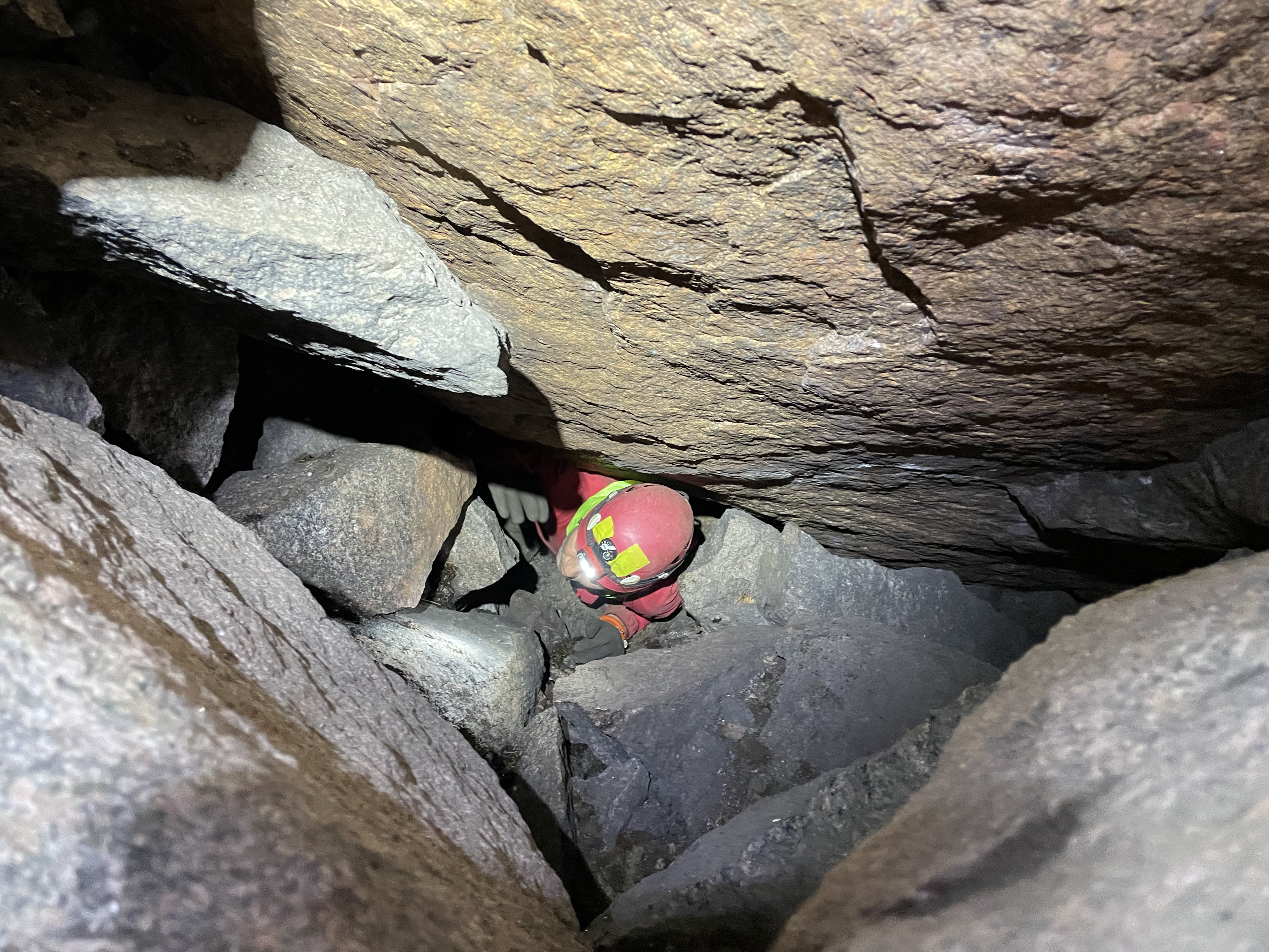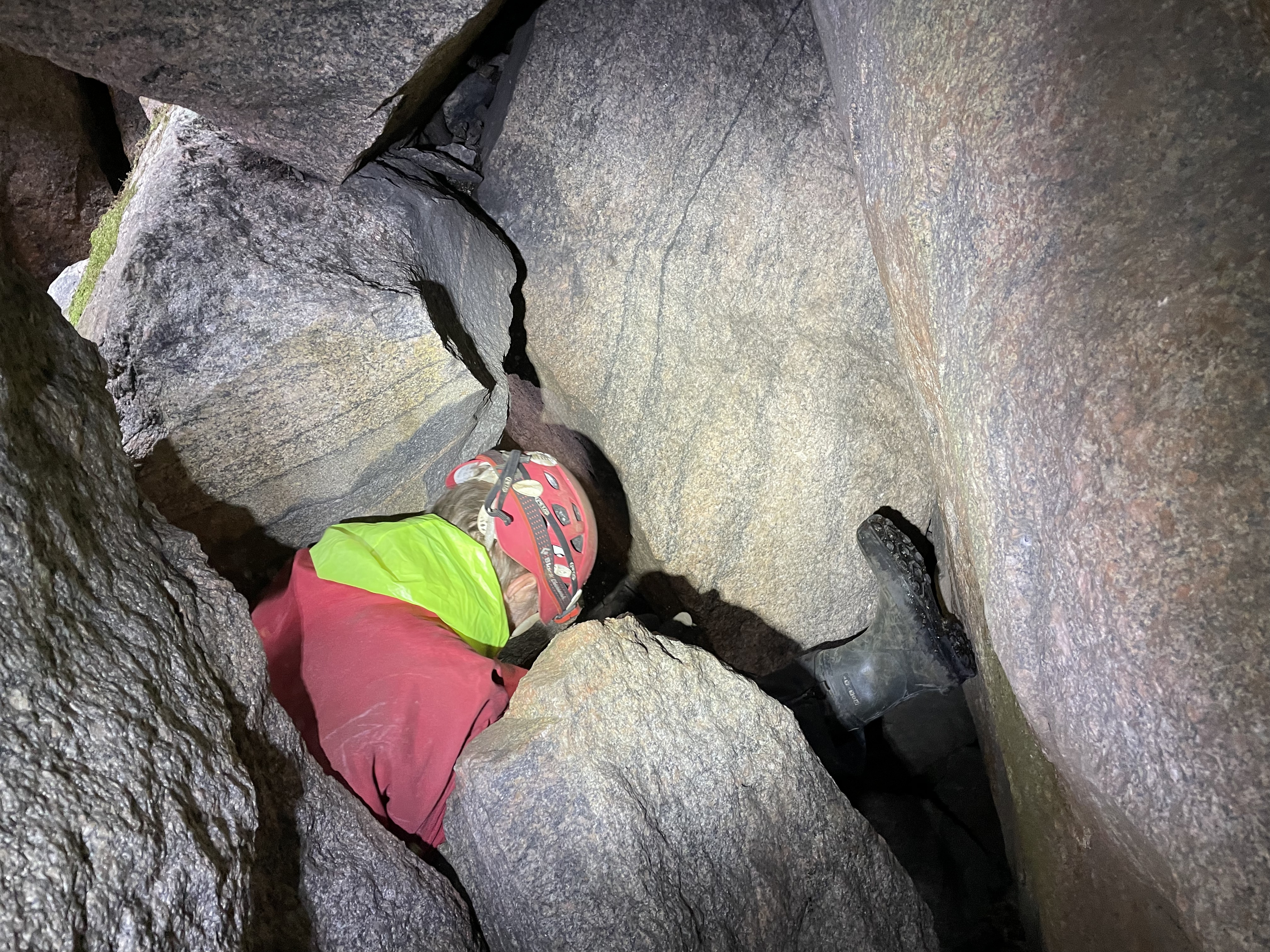 The ninth course is blocks... not legos but boulders. A block cave. Pile of boulders. Plenty of them. By a lake. The actually has its own in-cave boat parking, if you arrive by boat :-) By this time in the meal, we needed some stretching, and we certainly got that in the tight corners between the boulders.