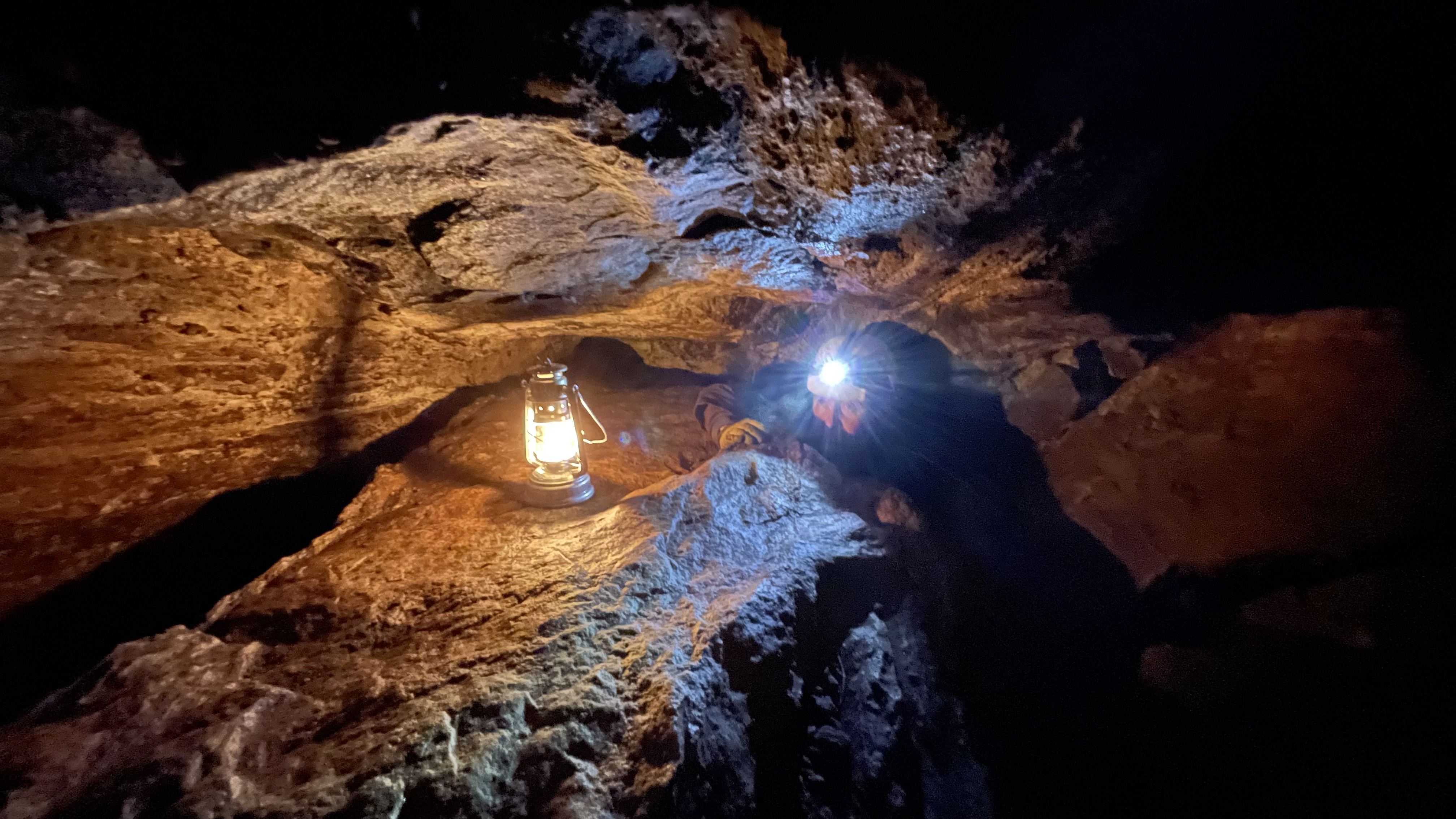 But we are hungry, so now it is time to get to the meat of it. How about a dark first course with some downtown city vibes? Turku's Luolavuoren luola (Cave of the Cave Mountain :-) ) delivers a respectable 45 meters of darkness. But this early in our buffet we need to keep it light, so a sprinkling of some fresh light seemed appropriate. An oil lamp and new color-changing Black Diamond headlamp did the trick: