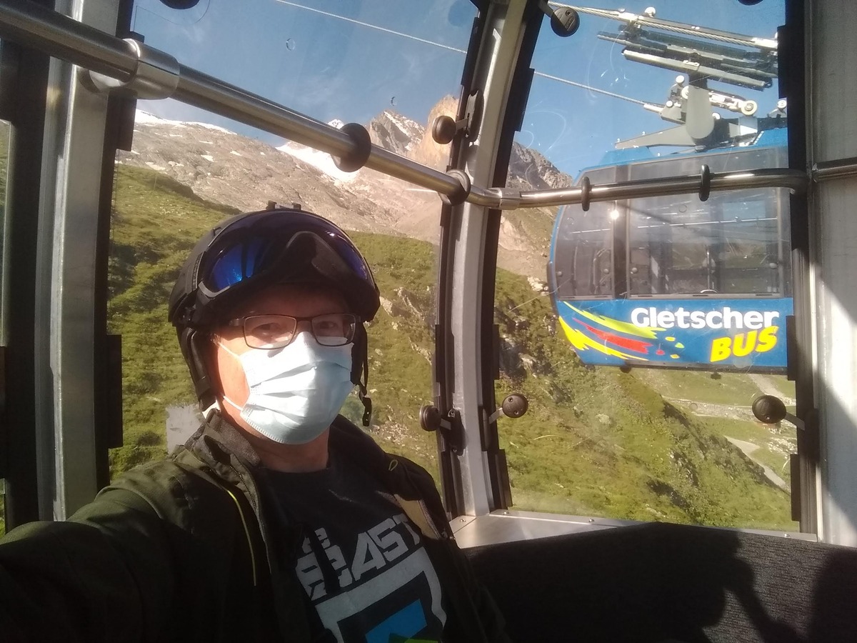 Summer 2020. This was the first flight after the pandemic. Even to the birthplace of the initial spreading of the disease: the Austrian alps. But no crowded after-ski this time... just masks, solitary skiing ... but how wonderful was that skiing! Hintertux is a long-time favorite and the skiing is just superb. Also pretty much the only place to ski in the summer in Europe, either here or in Zermatt.
