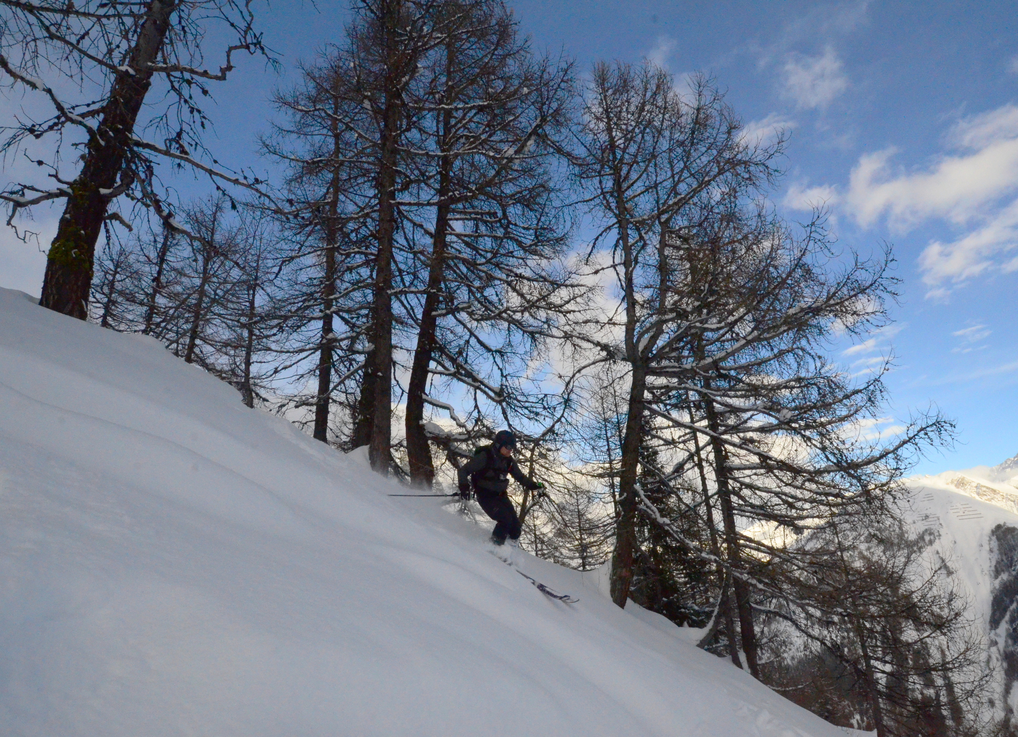 For some reason I always enjoy the backside at Courmayeur, e.g., the Zerotta lift. In the picture below I've skied the lift track under the Peindeint lift, with plenty of powder but absolutely no snow base under the powder. Bad for my skis, and tricky to ski at some points.