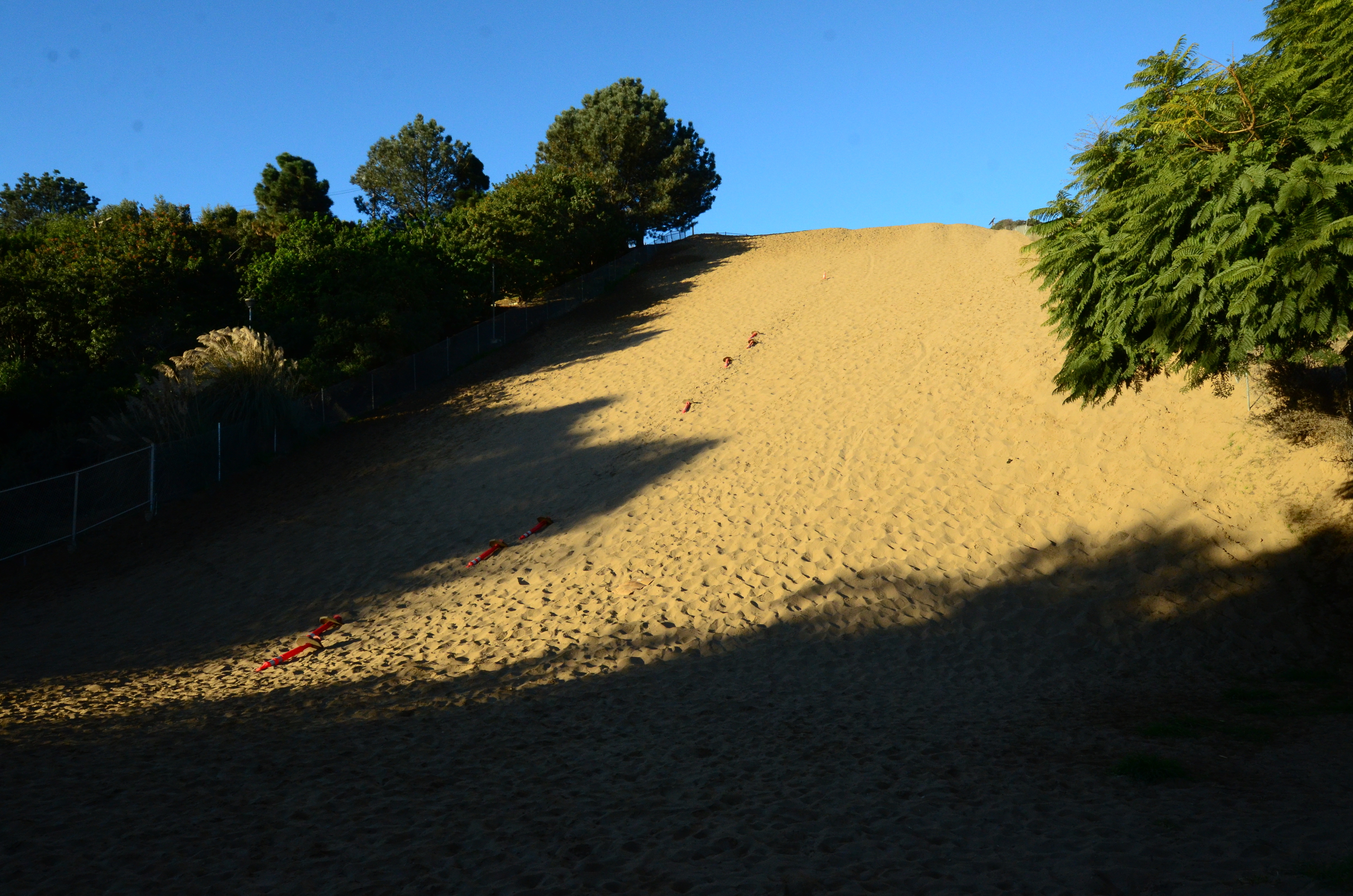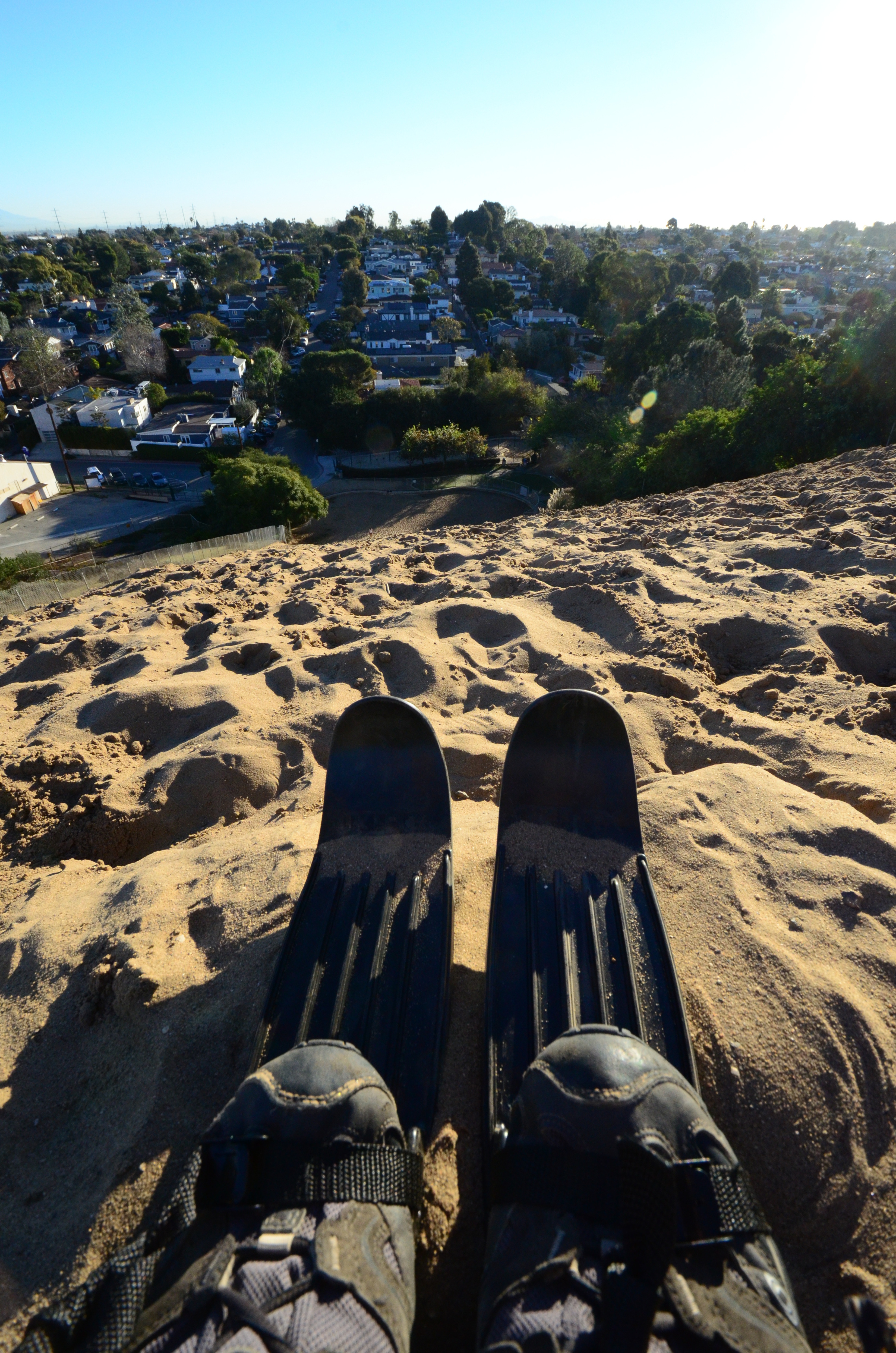 My work took me to Los Angeles. Very interesting work and even more interesting people to meet, but it also presented obstacles: no free time and no snow. But I sneaked out for an early morning outing, at the time normal people would be having breakfast or doing their morning jog. As for the lack of snow, well, how about sand? But for that I needed to find a dune. It turns out that Sand Dune Park near LAX hosts the sole remaining sand dune in the city. This 100-foot hill is an incredibly nice exercise spot; running up and down the dune is effective, and the setting is beautiful. And while the height of the dune is nominally 100 feet, on every step you will fall down a bit in the soft sand. A few runs back and forth will be a nice workout. Much better than any gym!