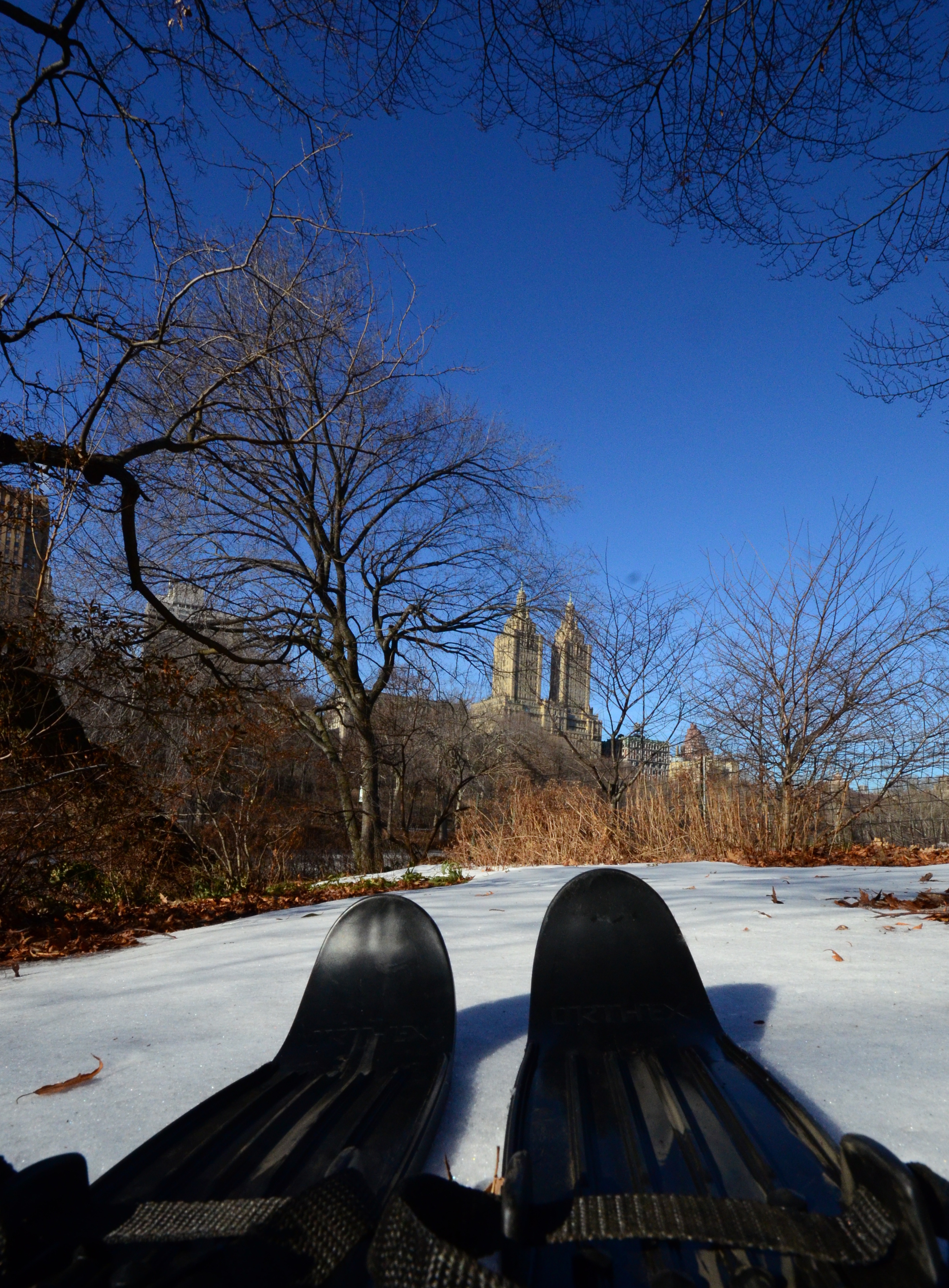 On my way back from LA my flights happened to put me in New York for the day. Between conference calls and lunch, I sneaked to Central Park with my Orthex miniskis. New York had been hit by cold weather a couple of days earlier, and there was still a little bit of snow left. I skied ten meters on slightly sloping snow-covered grass, and headed to my next flight.