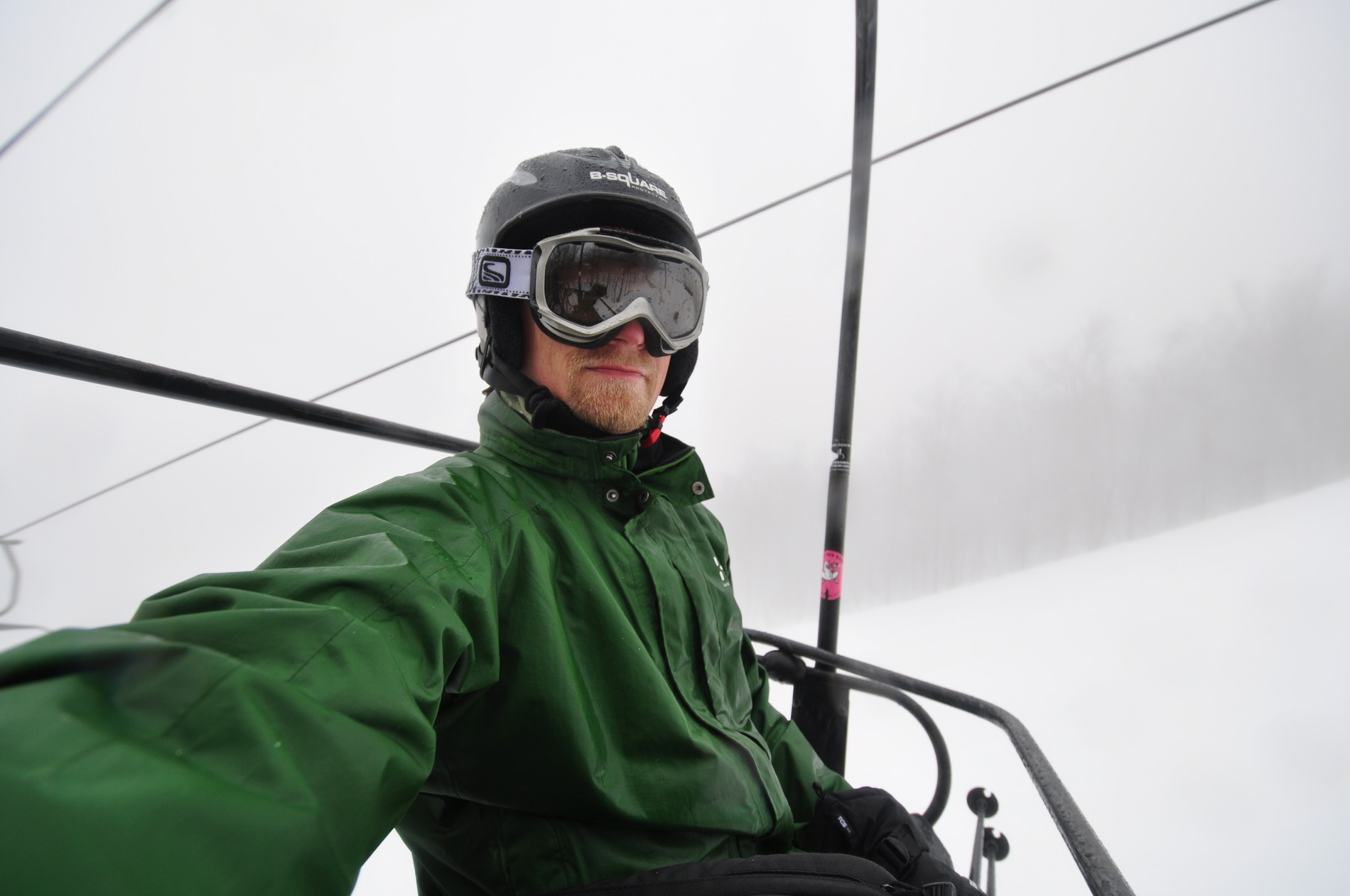 Me, soaking wet in Sunday River, METhe weather on the first night was cold, winter-like. On the first day we had spring-like conditions and a bit of fog in the upper areas at Mad River Glen. On the second day it was raining. Yes, water, even the top of the mountains. And pretty heavily. Luckily this did not prevent skiing, though a few places closed a bit earlier than expected. At one point I considering a detour to ski somewhere in Quebec as well, but if I had done that I would have arrived at Nashoba Valley too late, as they closed earlier than planned.