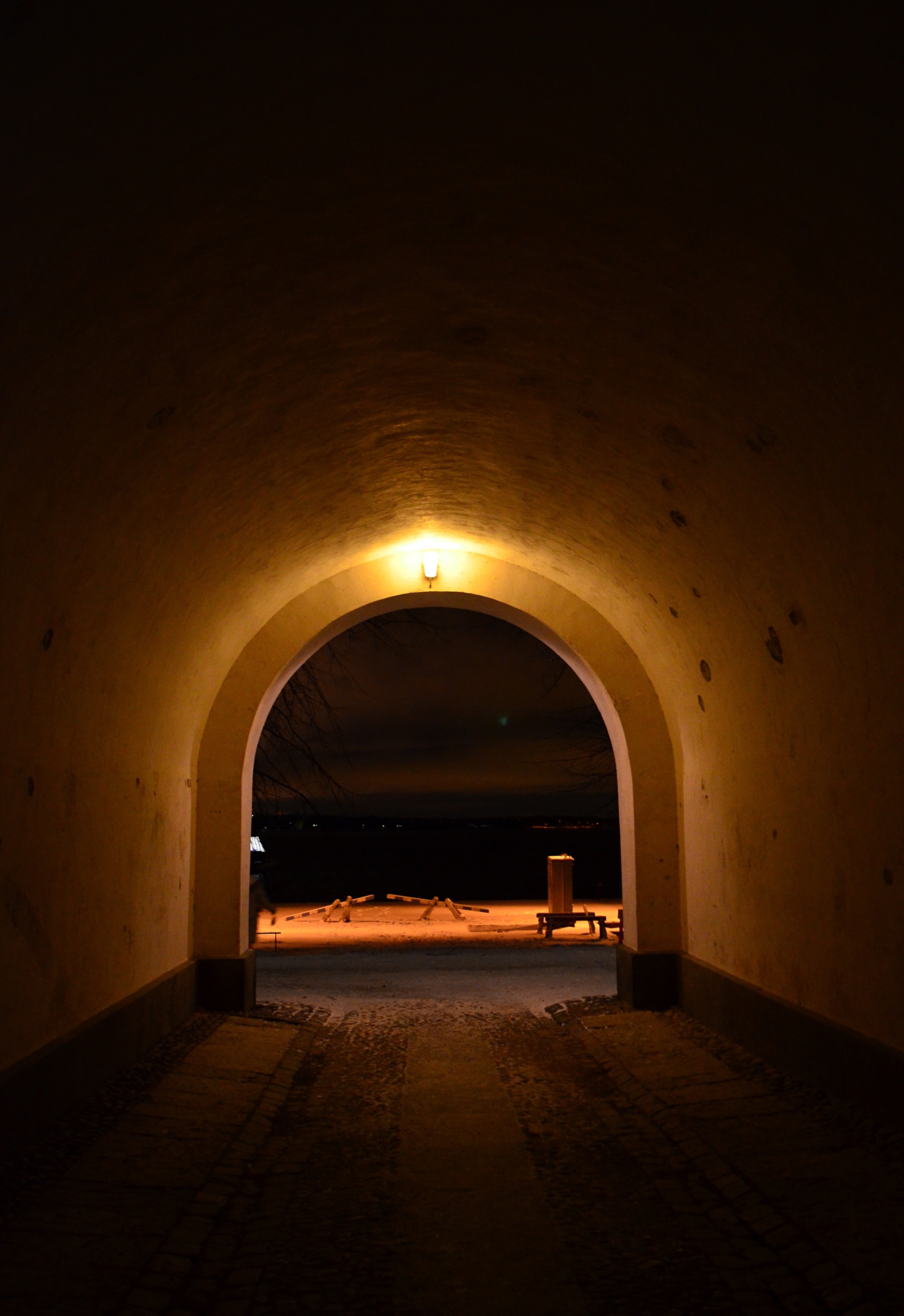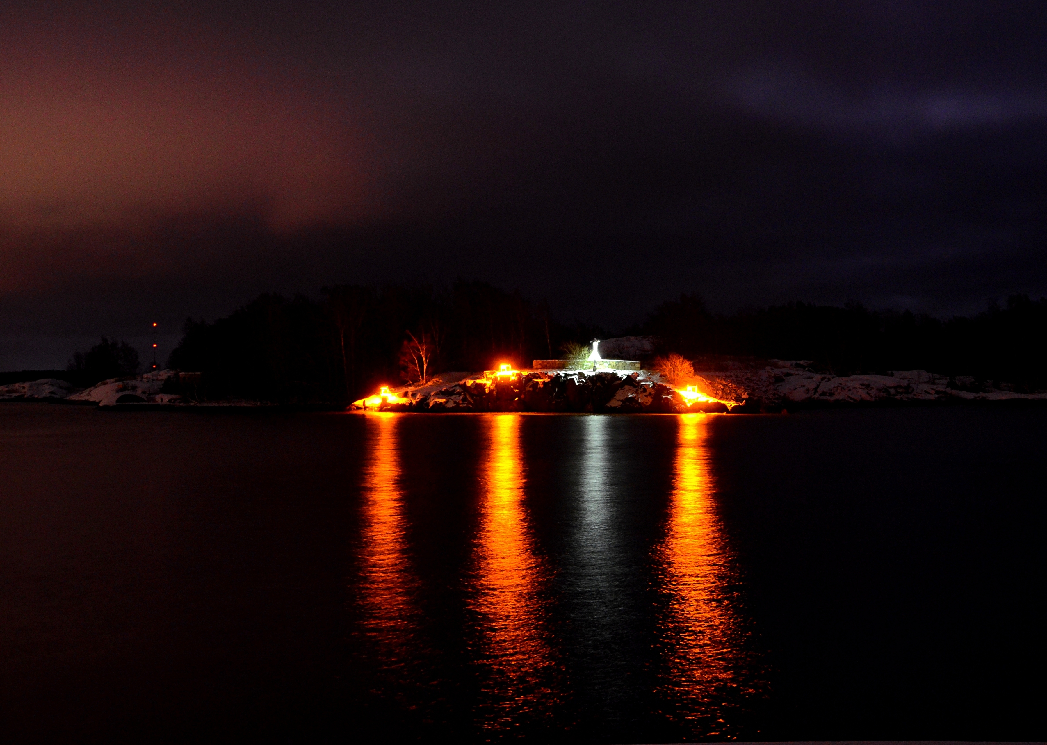 In the summer the islands are a green oasis full of tourists. In the winter... they are a dark, lonely and cold place. My kind of place. I see a few people near the harbour, but there is absolutely no one else on the big island that has the hills. Except a few lit castle windows. Probably one of the few people who live here. Or maybe a ghost of a dead soldier. Or a guard that is about come and stop me.