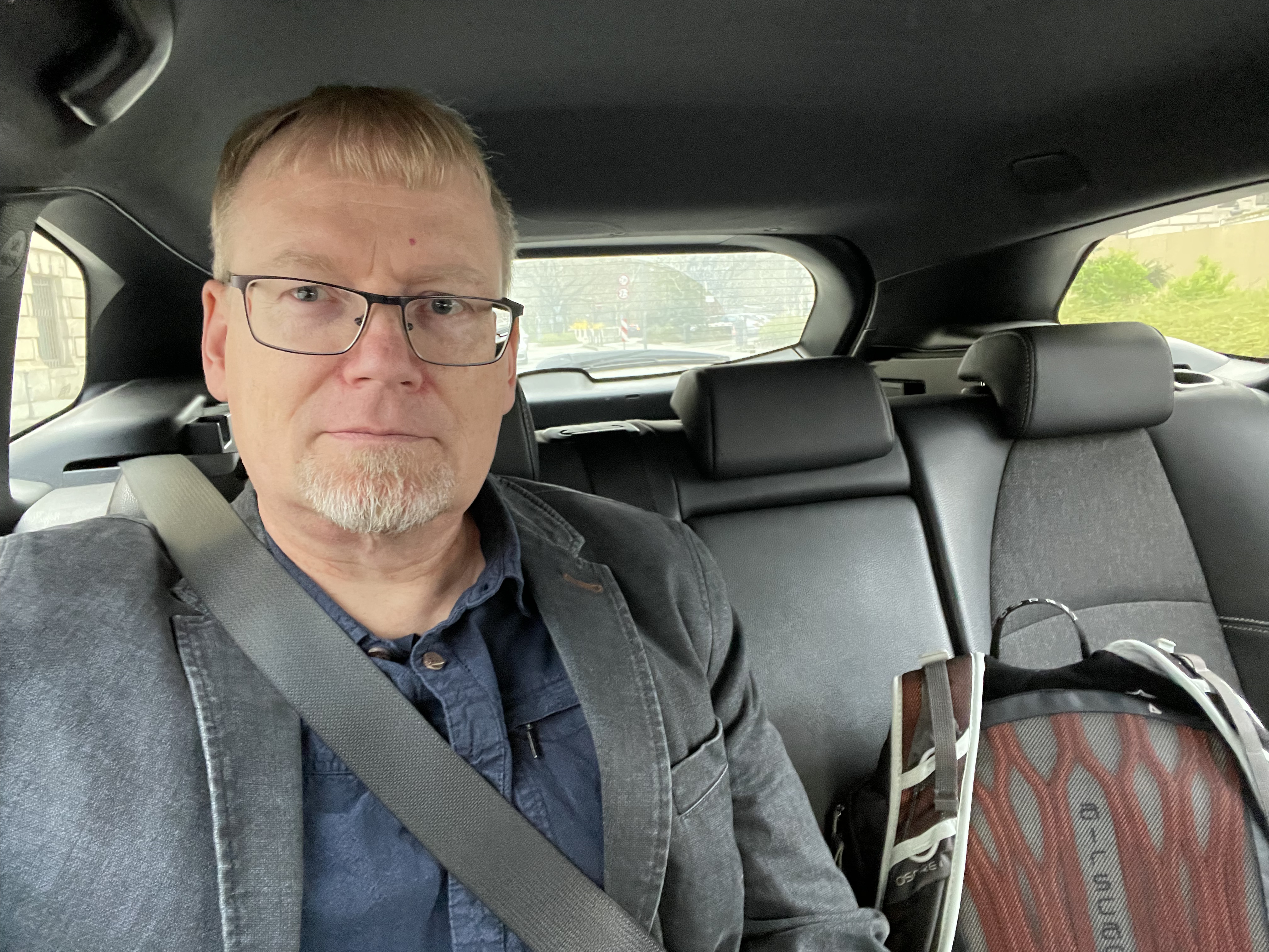 The author, in a taxi in business clothes .. but I did change before hitting cave: