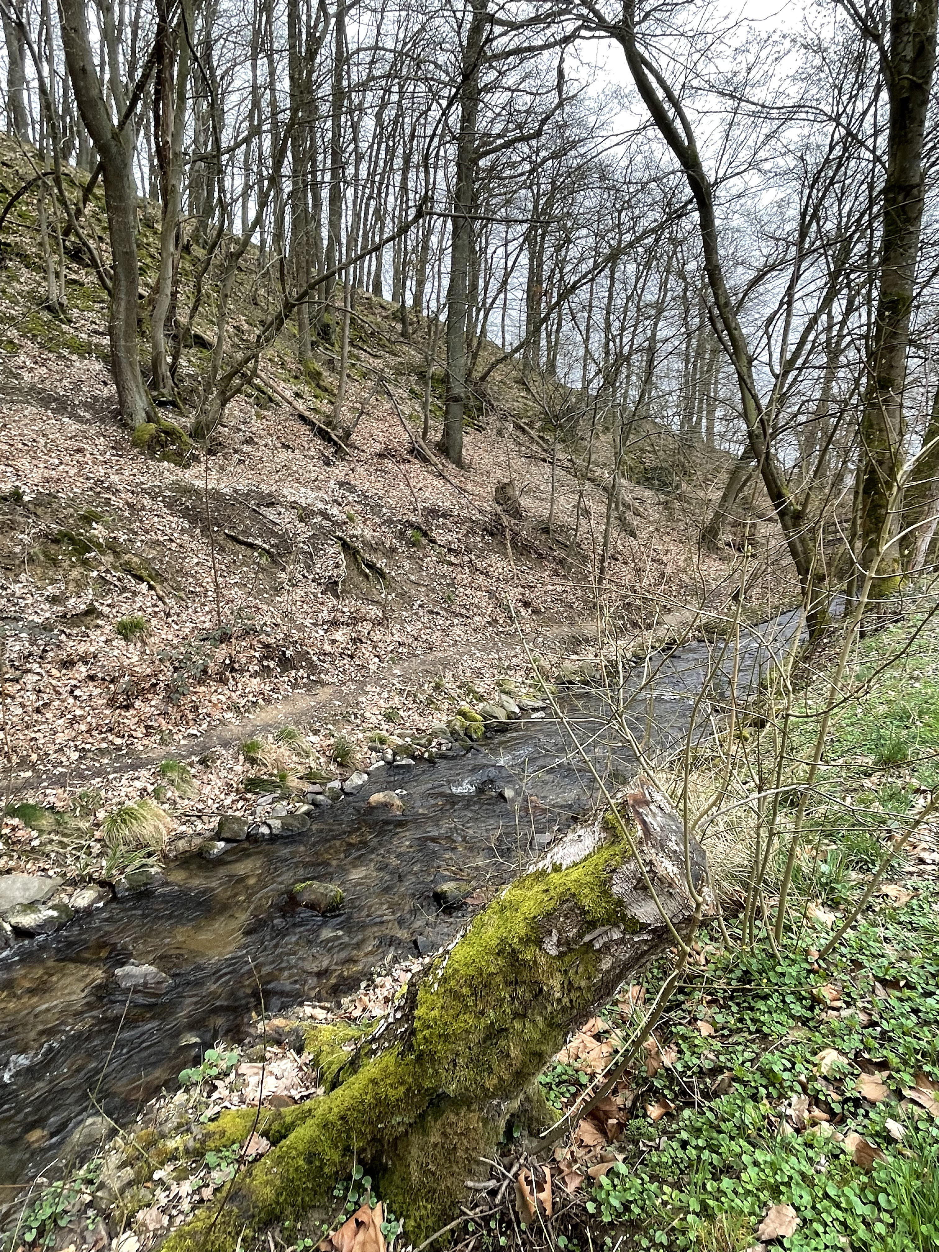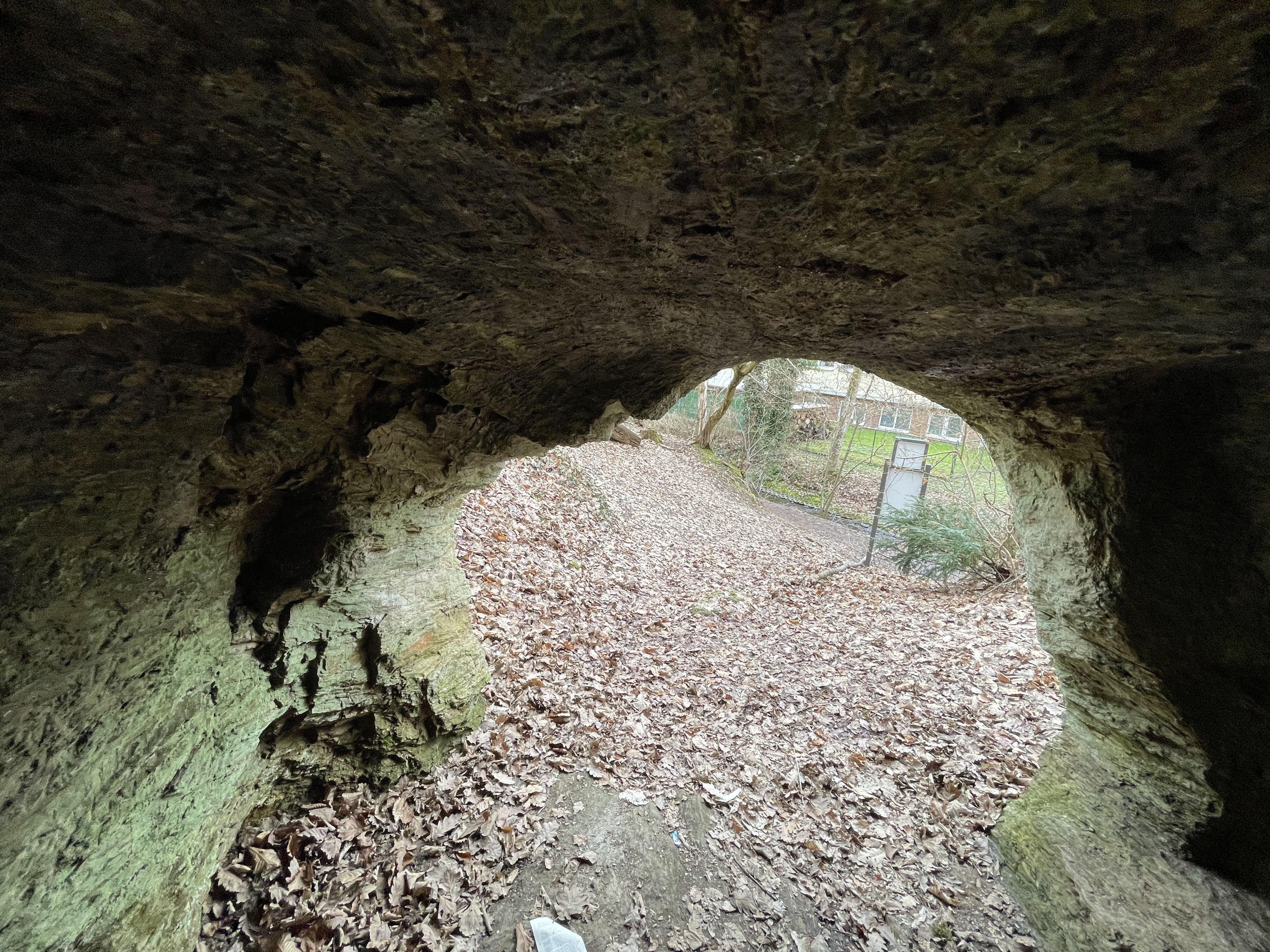 The coordinates are N 50.150202 E 8.452332. The cave is right on the side of a stream, the Liederbach and there's a nice foot bridge to cross over the stream. The cave is right next to buildings and roads as well, the easiest way to get to the cave is to park somewhere near the sports/playing field and walk 100 meters to reach the cave.