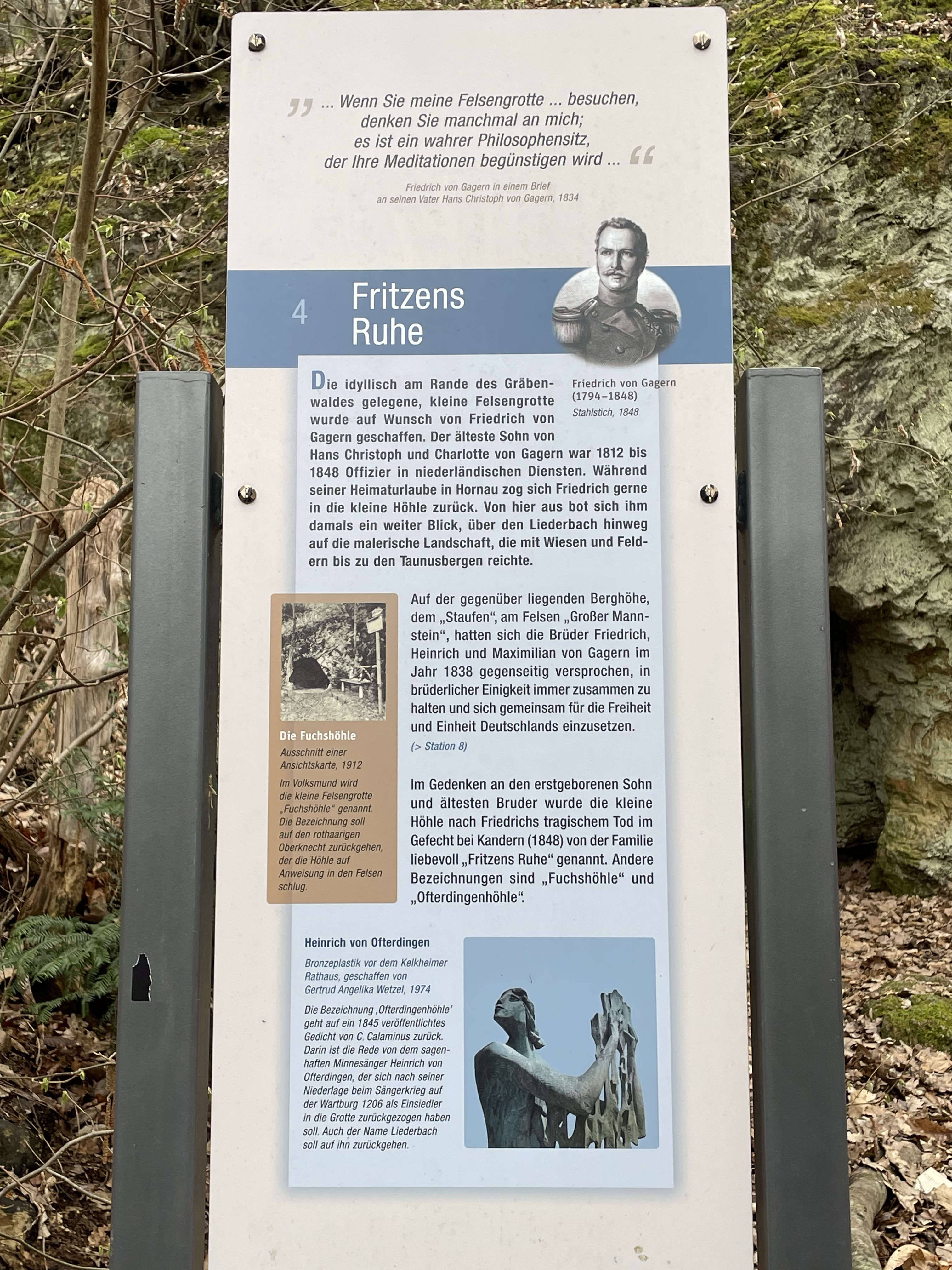 More information about the place can be found from the Kelkheim Discover page and the Outdoordad page. The cave is also called Fritzens Ruhe or Fritzen's rest, for the memory of the Fredrich's passing in the battle of Kandern in 1848. Yet another alternate name the cave is Fuchshöhle, for Fuchs, who carefully carved the cave per Friedrich's instructions.