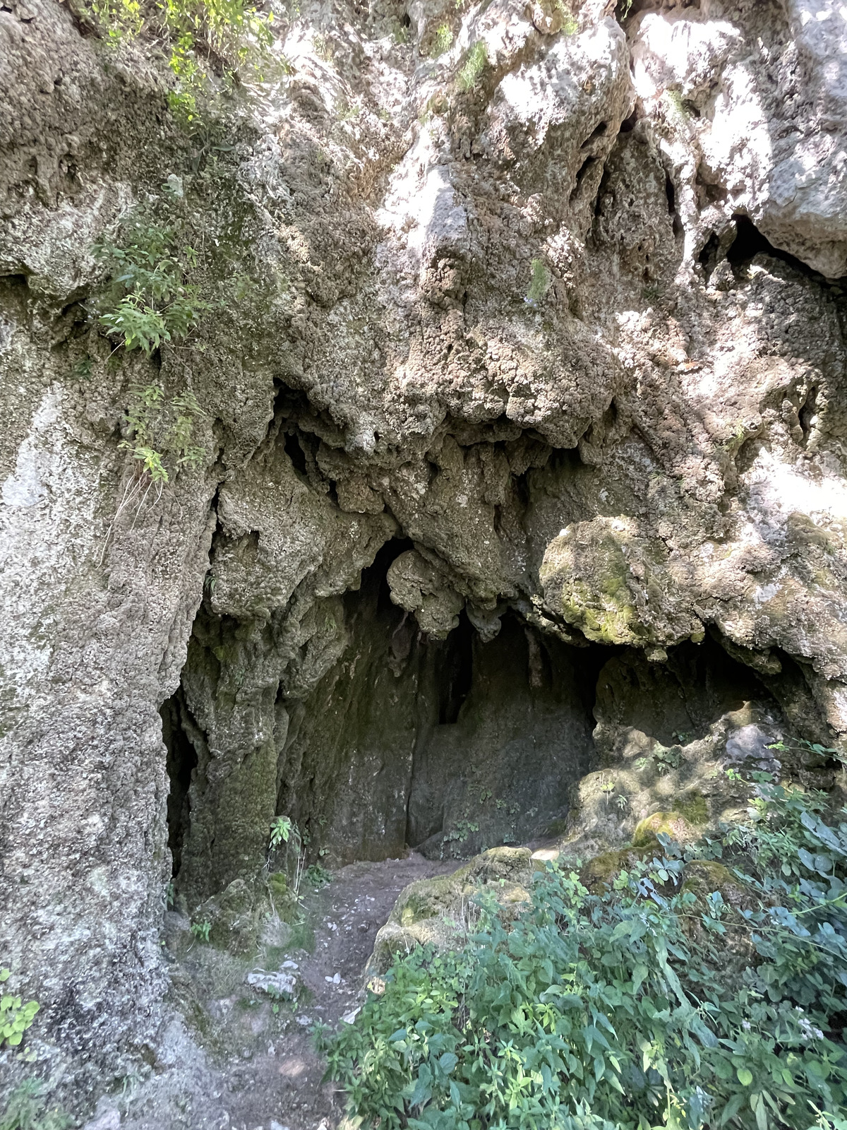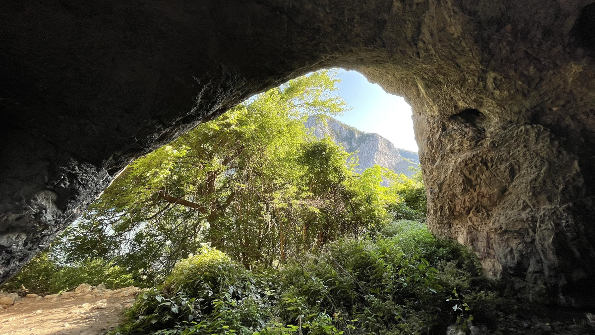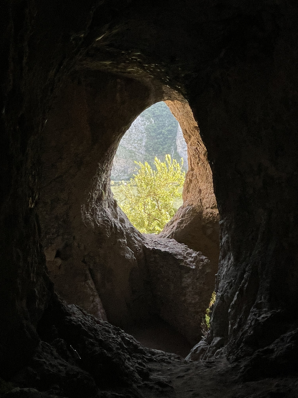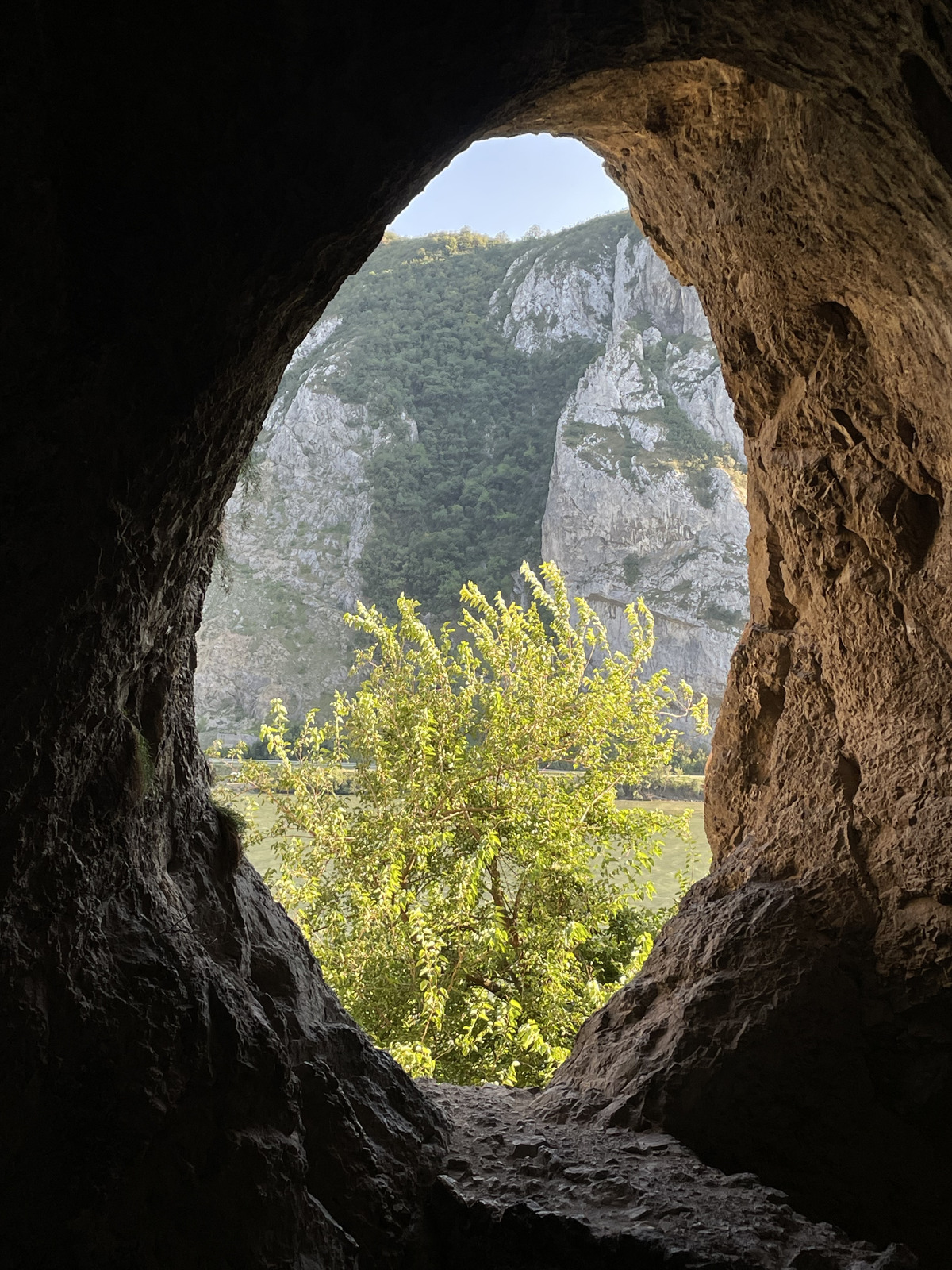 I had two choices for visiting a cave. One was reportedly larger, but also came with a river crossing on foot, hiking through bushes known to have venomous snakes, and a 10-meter vertical cliff climb without protection. I chose the other one, Gaura cu Muscă, or the "Cave of the Flies". This cave was supposed have an easy path to follow from the road. Yet, that easy path turned out to be not so obvious, so after hiking 50 meters up and gotten to an increasingly unstable and sketchy mountainside path, I gave up. But on the way back I realized there were alternate paths, and one of them lead to the actual cave. The views from inside this cave's oval-shaped entrance holes, over the Danube were nothing short of stunning!