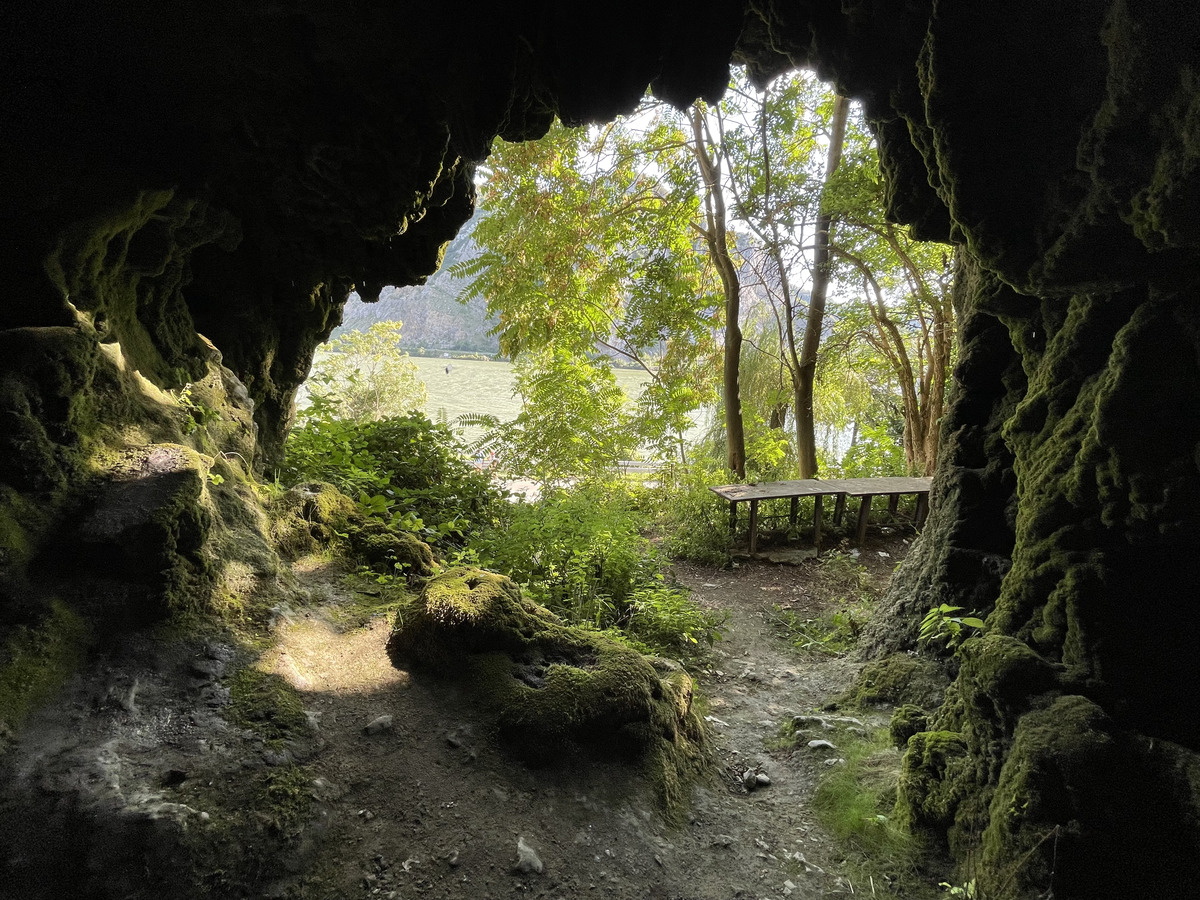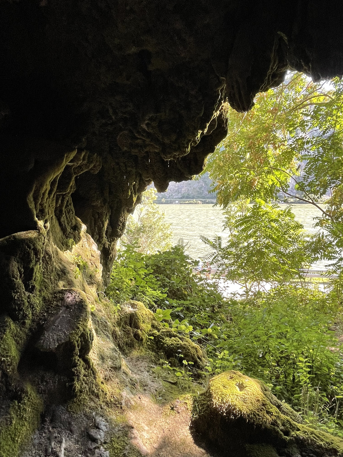 The cave is well known for its stunning views out of its entrances and over the Danube, like in the opening shot and here:
