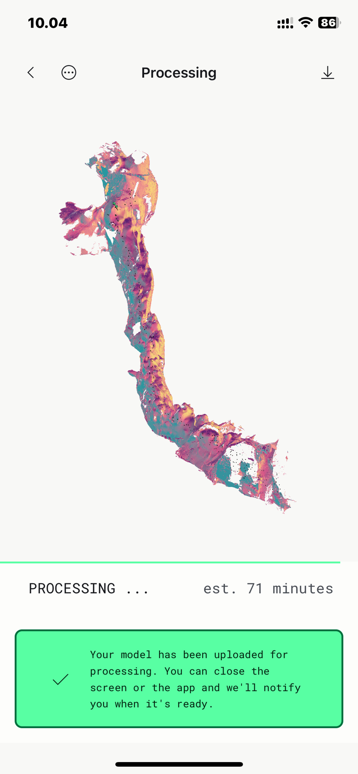 But the Polycam app sometimes fails to work, particularly with larger models, and I did the upper cave in just two parts, being lazy and wanting to avoid error-prone manual joining in post processing. But now I found out that the process-in-cloud option in Polycam works somewhat better. You need to publish the raw data to their cloud, and then the processing takes few tens of minutes, and you can then rotate, download, etc. the resulting model as you please.