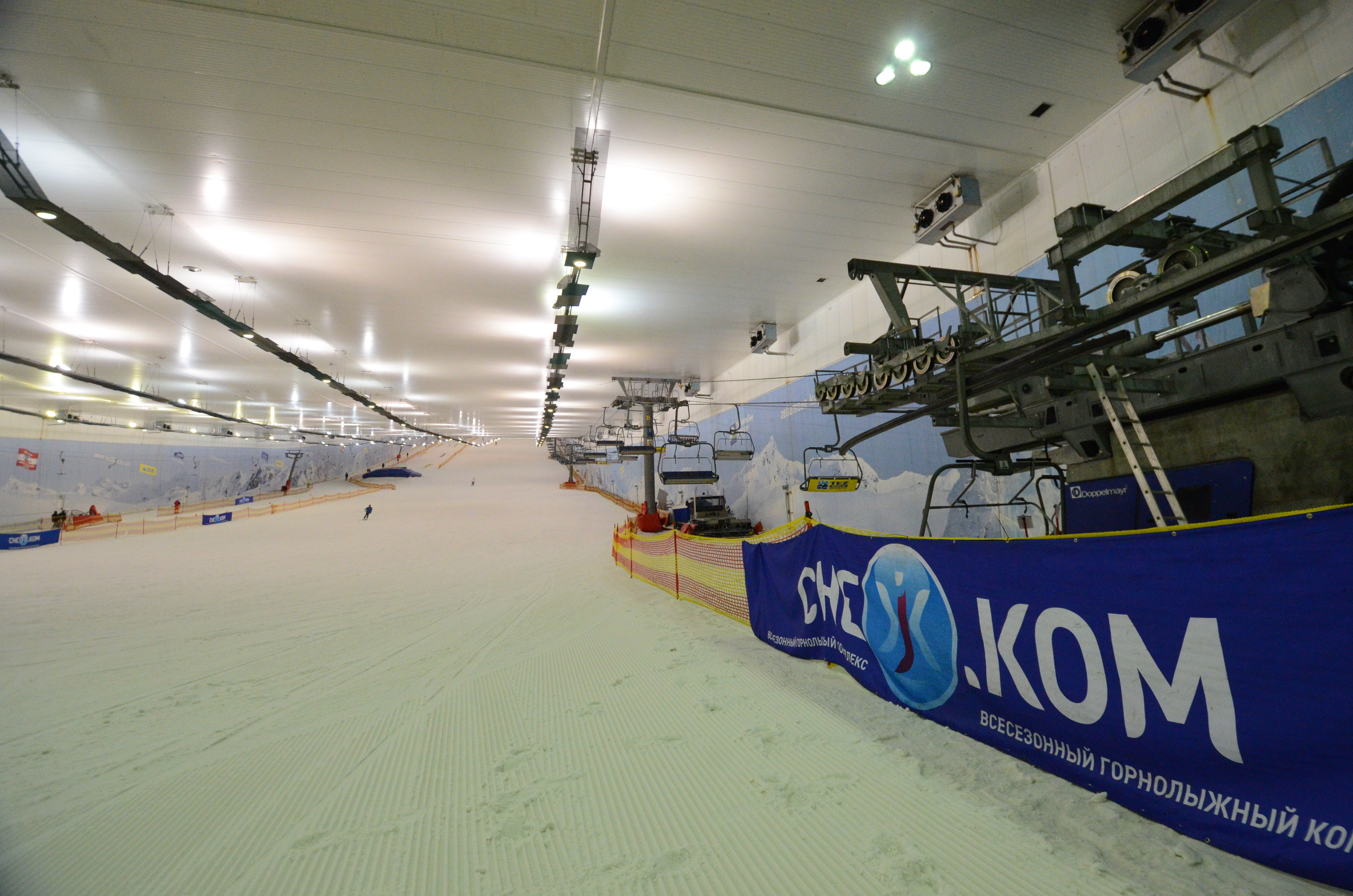 The main ski run is not very steep. This is typical of many indoor ski places, as they cater mostly for the beginner skiers. The upper part is decent though, you can make good turns and build up some speed. I have noticed that twisted, turning design on the indoor slopes is better for both advanced and beginner skiers, as one side of the slope can be steeper than the other one. Nevertheless, СНЕЖ.КОМis a good place to ski at, and fares better and larger than most other indoor ski places.
