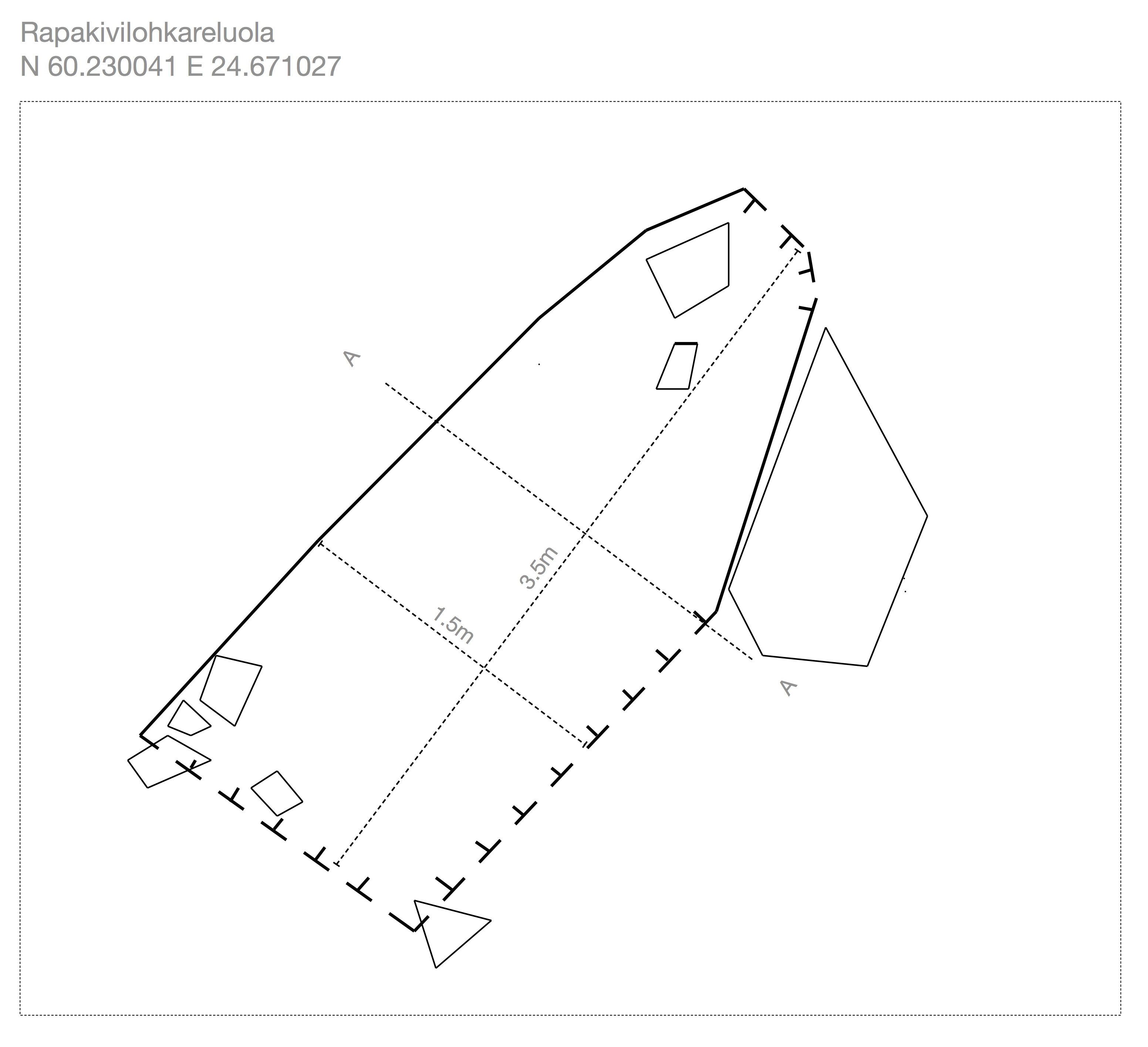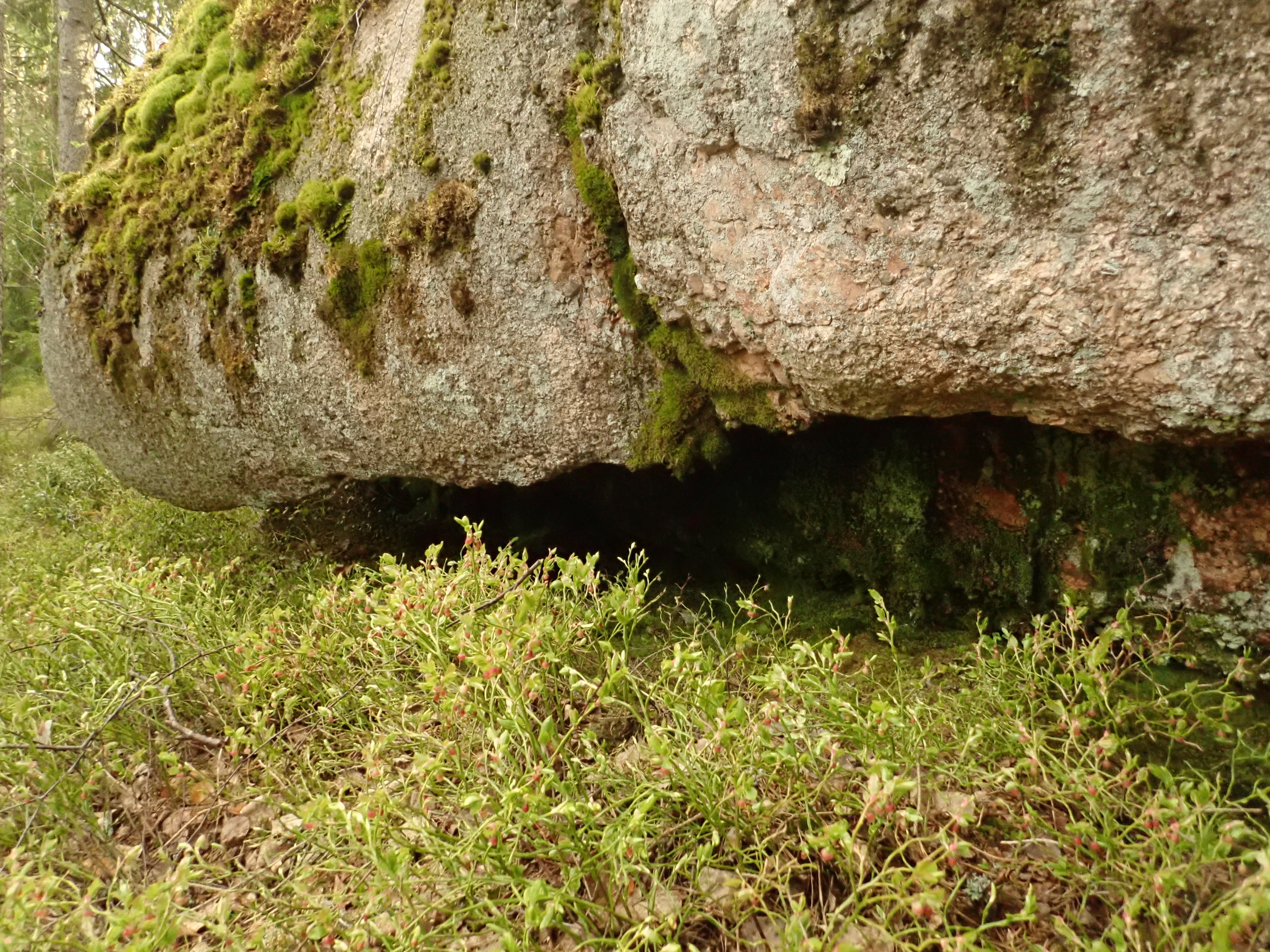 This was also true in Gåskärr/Tollinmäki, an area just north of the Ring III road and Bemböle. There was one cave that perhaps could even be called a cave, 3.5 meters by 1.5 meters space under a rapakivi (crumbling stone) boulder. Very interesting! The coordinates for this cave are N 60.23004 E 24.67102. A cave map is available here.
