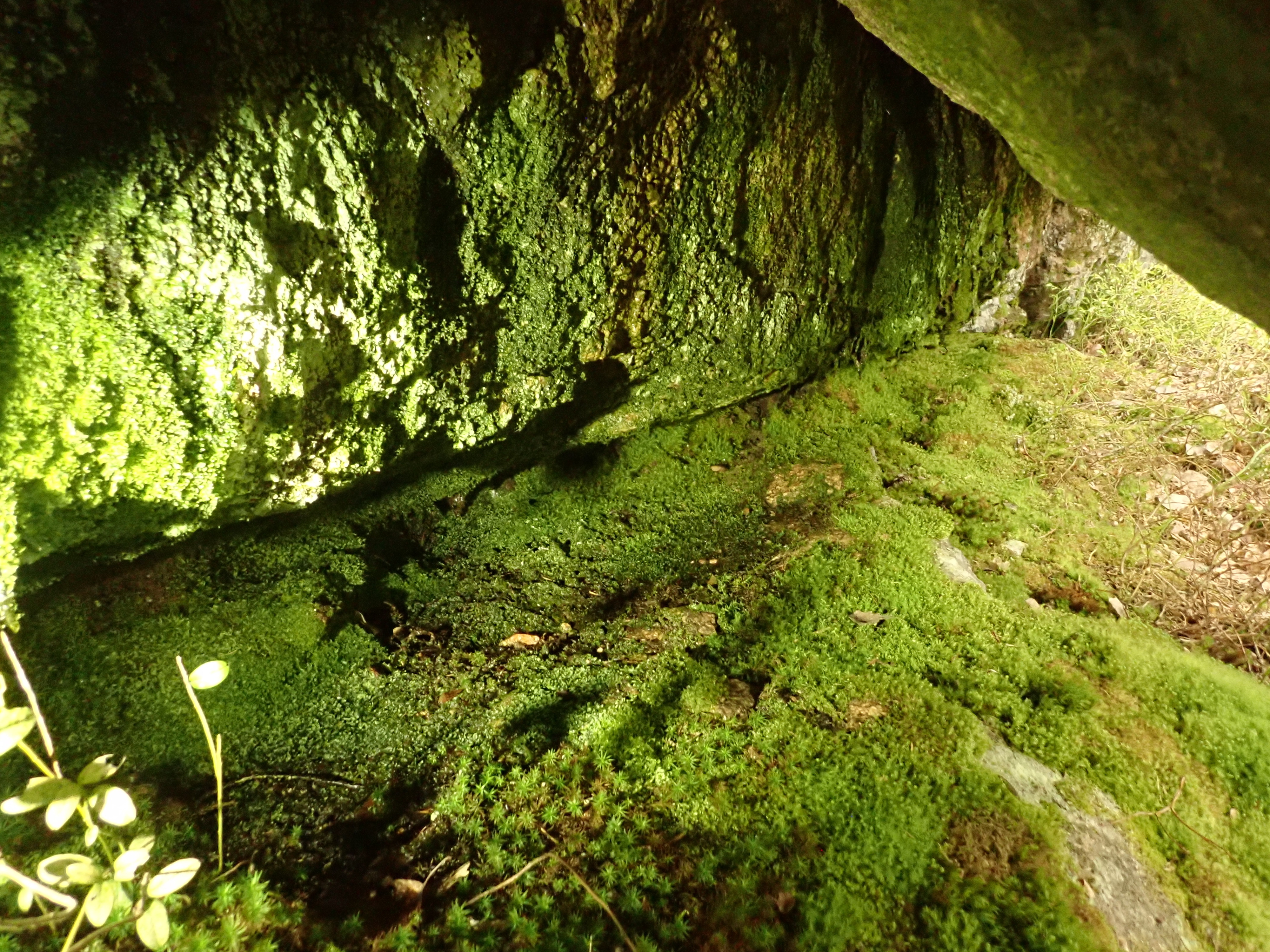 There was also another nice but little overhanging roof on a cliff. Just 2.2 meters long and 1 meters wide, but quite enclosed. And quite green, as the above picture shows! Coordinates for this cavelet are N 60.23075 E 24.67402. And a cave map is available here.