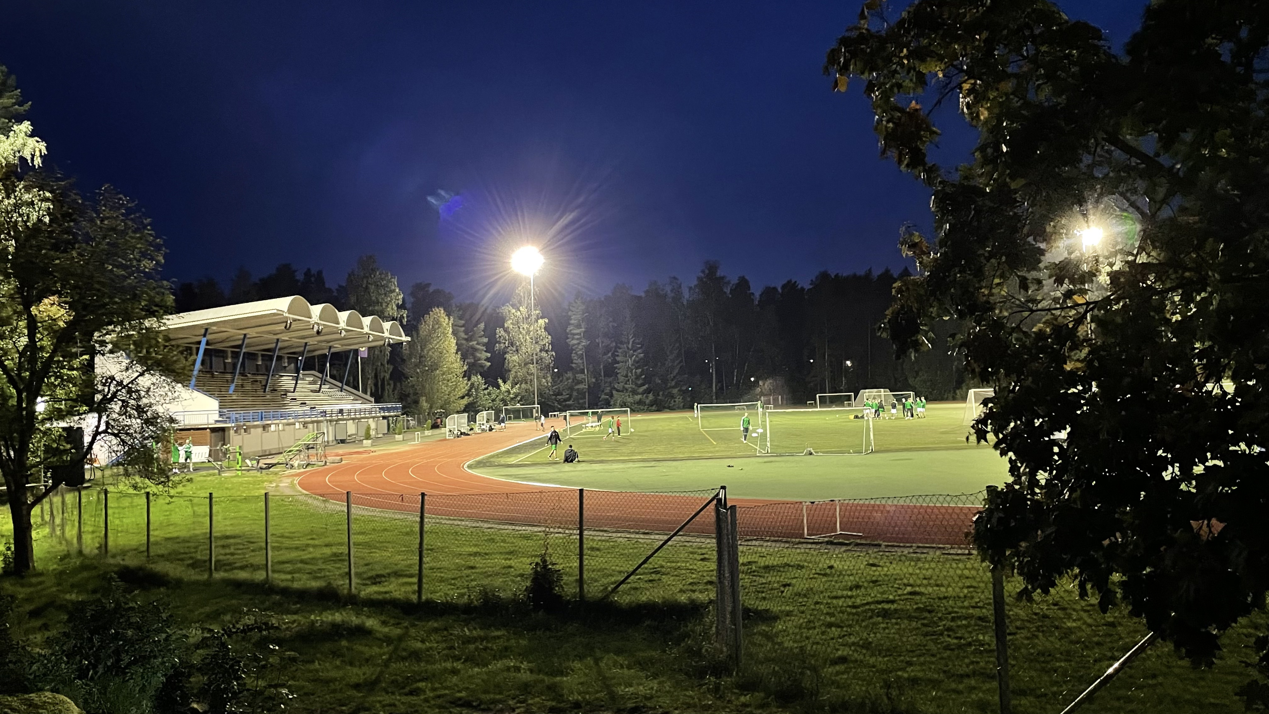 The photo is of the sports arena next to the swimming hall, in evening lights.