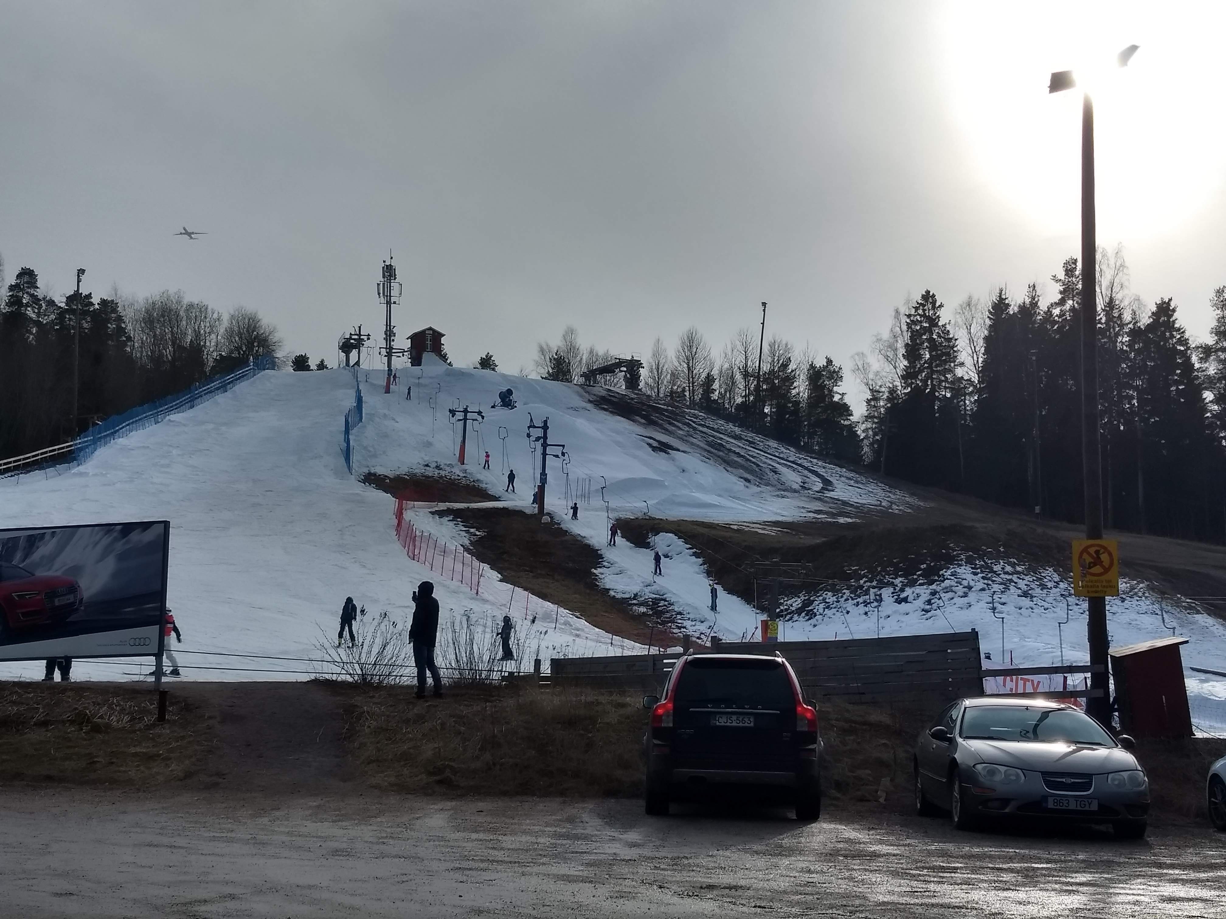 While coming back from the grocery store, I swing by the local ski hill in Kauniainen. To my amazement, they were up and running, with a bit more than half of the slope covered by snow.