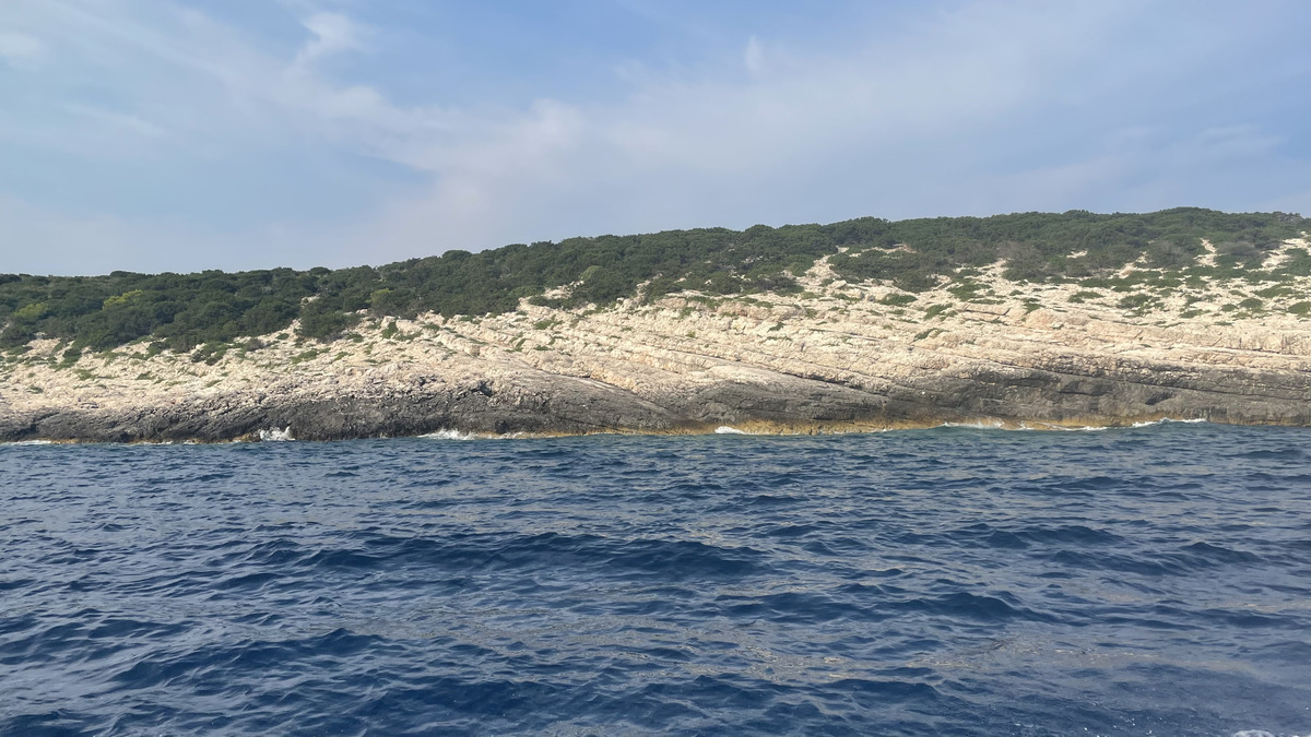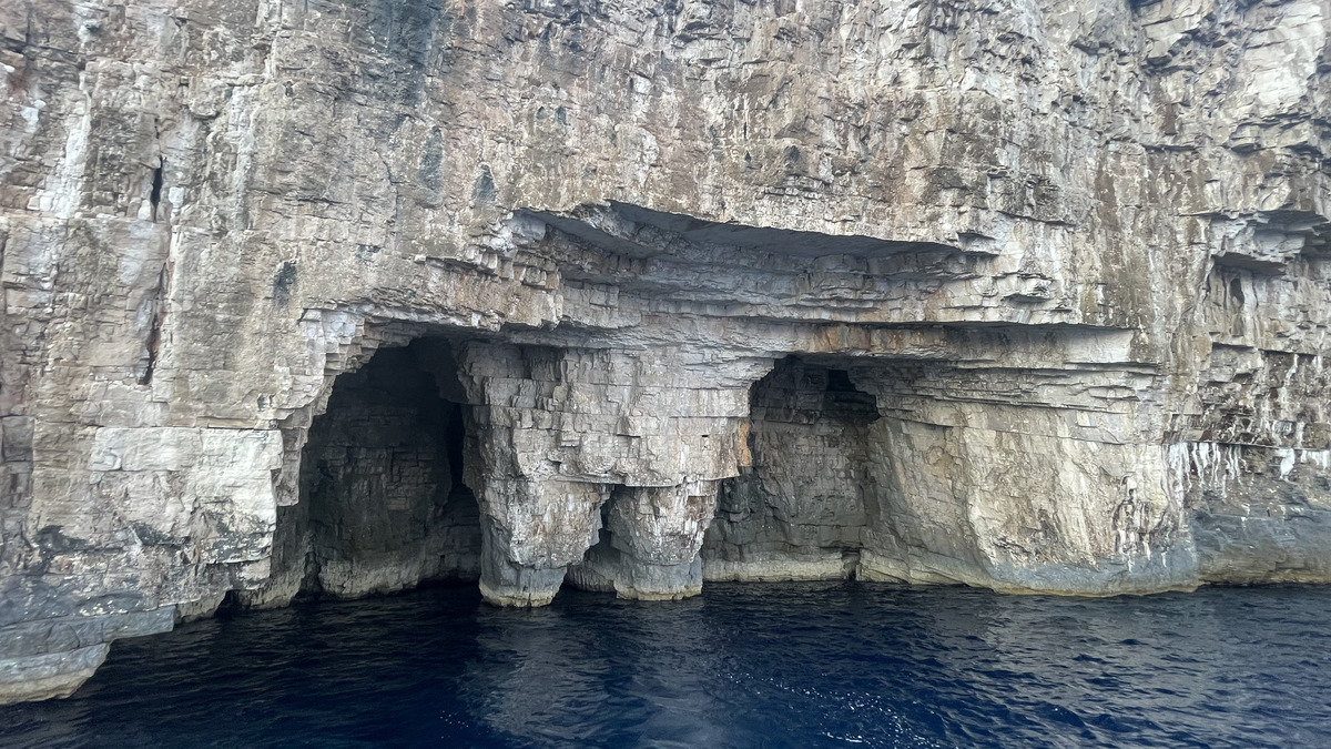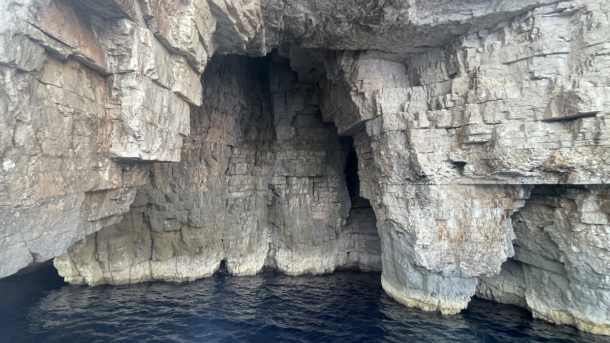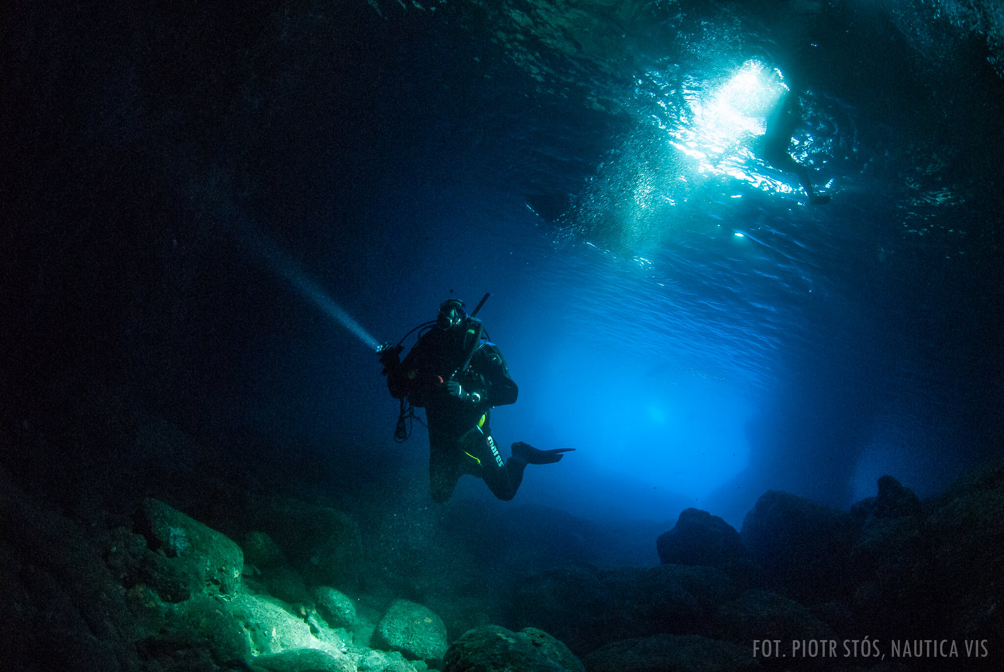 There are by the several caves on the southern shorelines of the island Vis. We visited one of them with the boat, at the approximate coordinates N 43.009955 E 16.120934, on the rocky shores near the Podhumlje village. This cave is big enough for a boat to enter, but you can't go particularly far inside. Some smaller cracks of the cave may continue further. A few pictures: