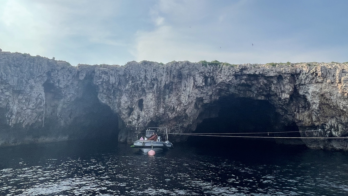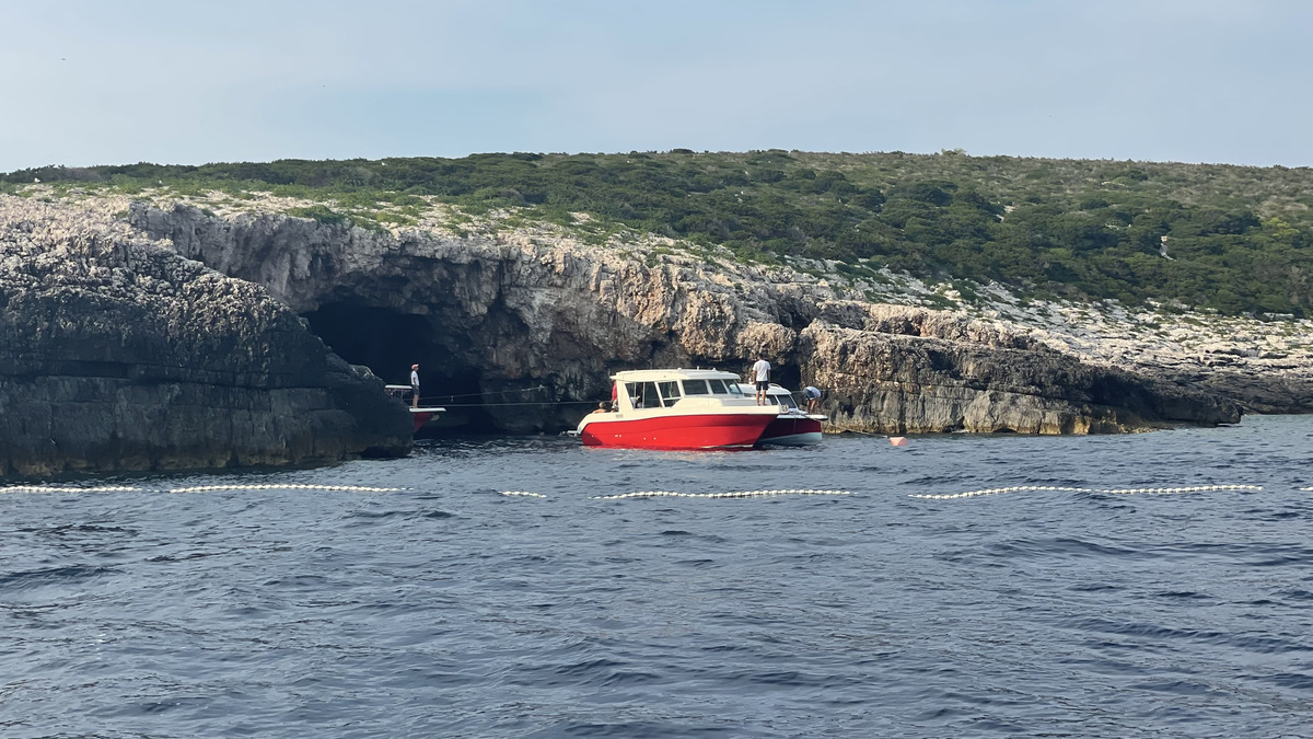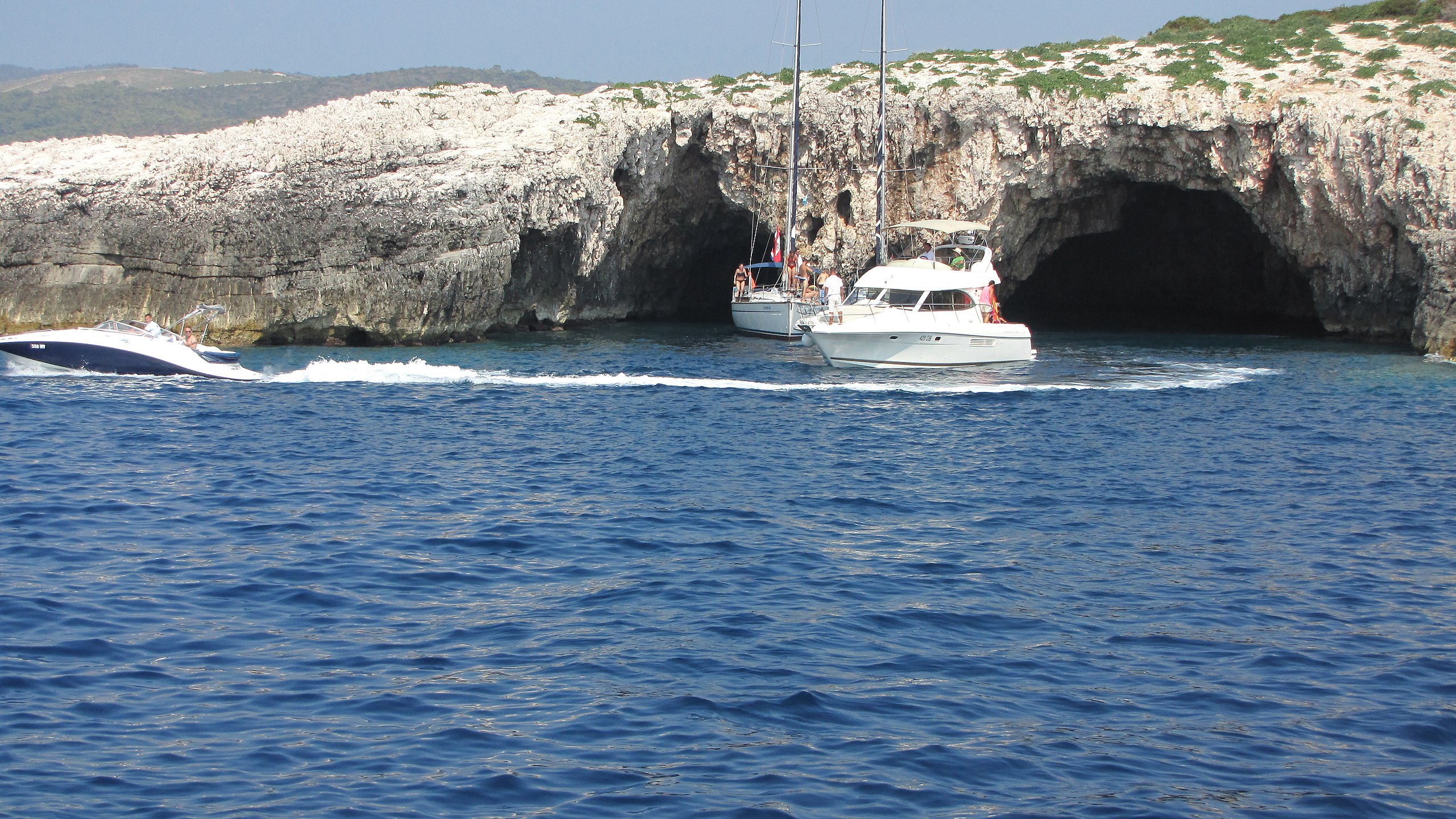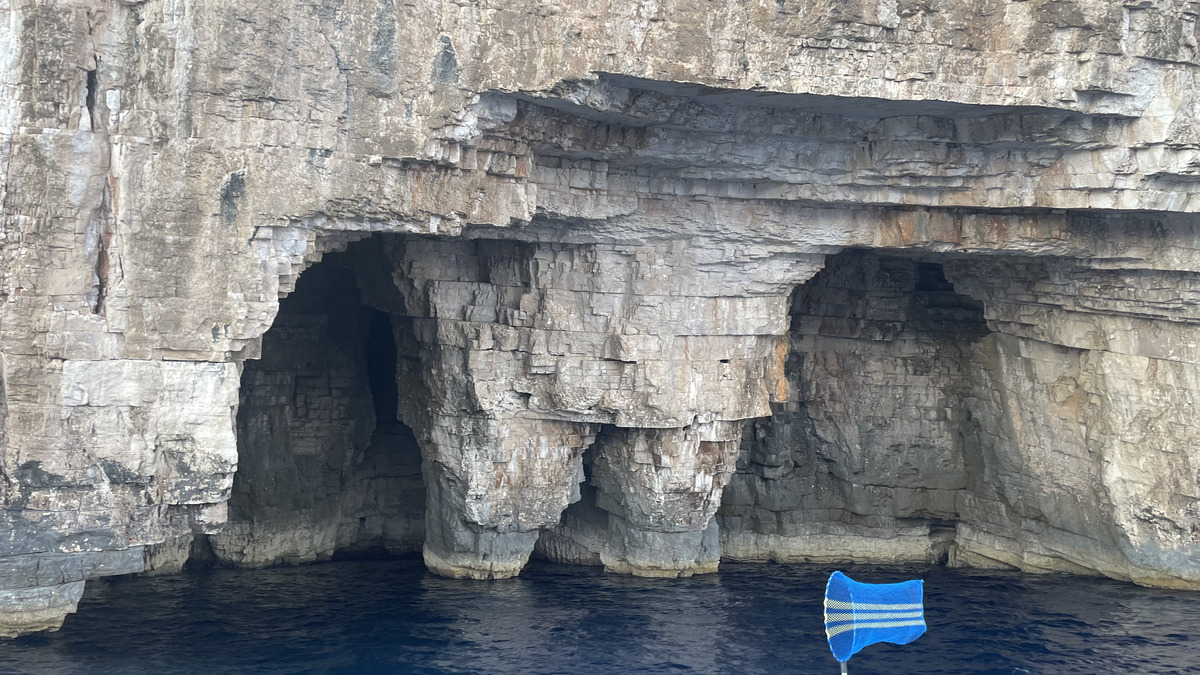 There are by the several caves on the southern shorelines of the island Vis. We visited one of them with the boat, at the approximate coordinates N 43.009955 E 16.120934, on the rocky shores near the Podhumlje village. This cave is big enough for a boat to enter, but you can't go particularly far inside. Some smaller cracks of the cave may continue further. A few pictures: