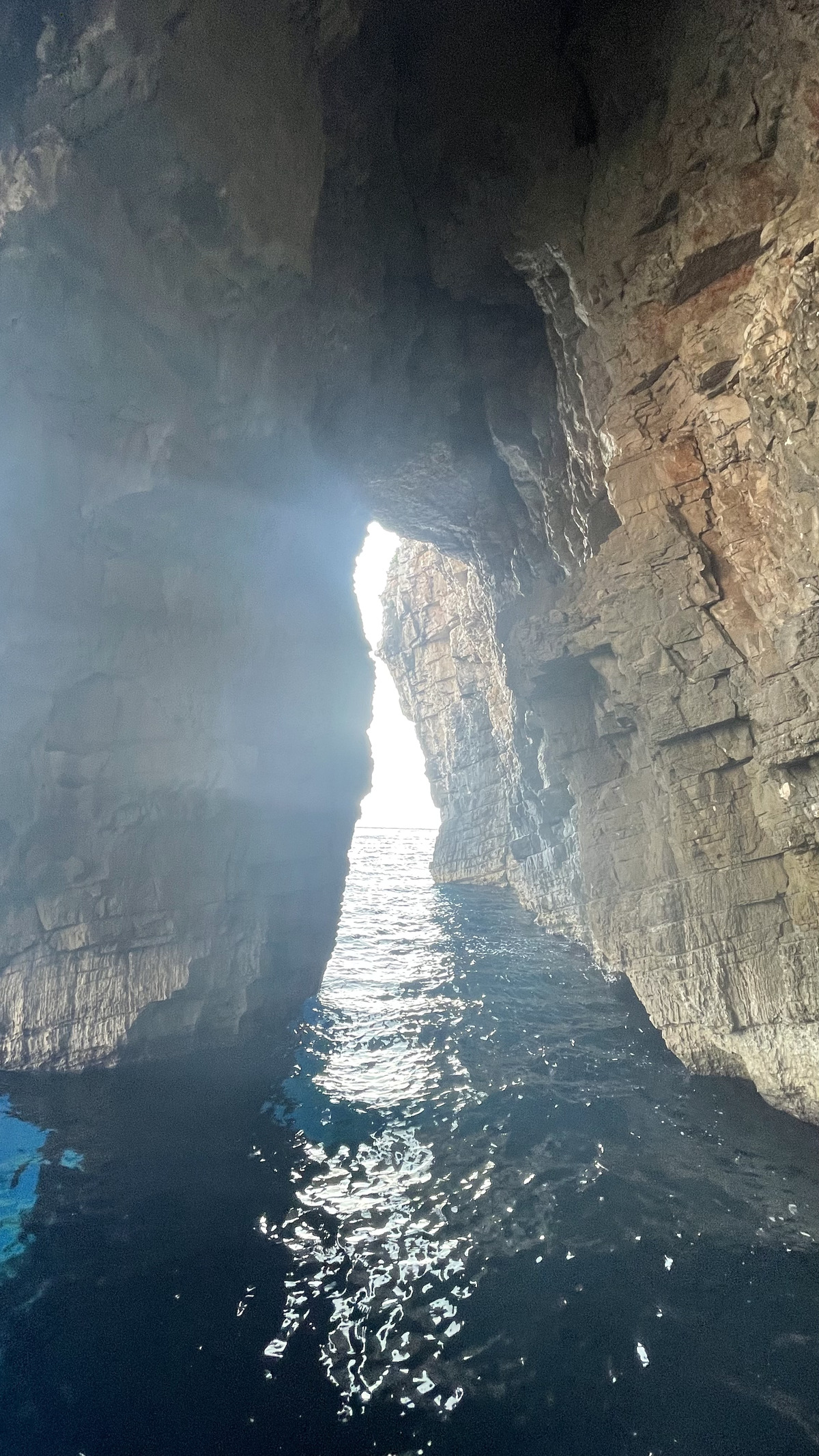 A hole in the sky. Or in the roof, rather. This is what has given this cave its name, Zelena Špilja or in English the Green Cave. At noon, sun will shine through this small hole down to the water in the sea cave, and combined with the sea weed at the bottom of the water, a green light is created. I'm here though in the evening, but the cave is still spectacular!