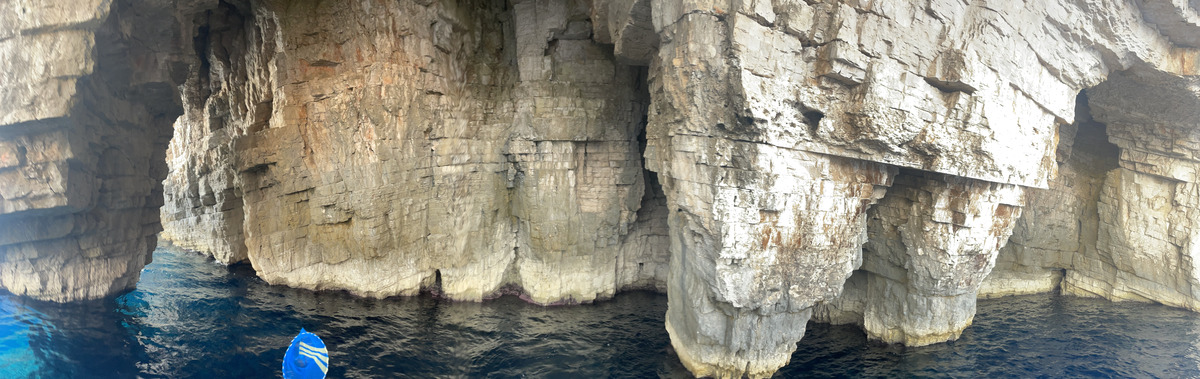 The cave is in these coordinates N 43.015605 E 16.224207. More reading about the Green Cave here: Wikipedia, YouTube promotional video, Nautica, Zen Travel Croatia, Diving Vis, and Explore Adriatic. We joined the Milaneze Marine tour (or one half of the tour). They are based in Komiža, and a full tour covering the day and multiple beaches in addition costs around 60€ per person. A half tour, just getting to the green cave and then back to Komiža costs around 30€. But the smaller boats from Milna near Ravnik may be an easier and more cost-effective option if you just want to see the cave, and are already in Milna or have a car to get there easily.