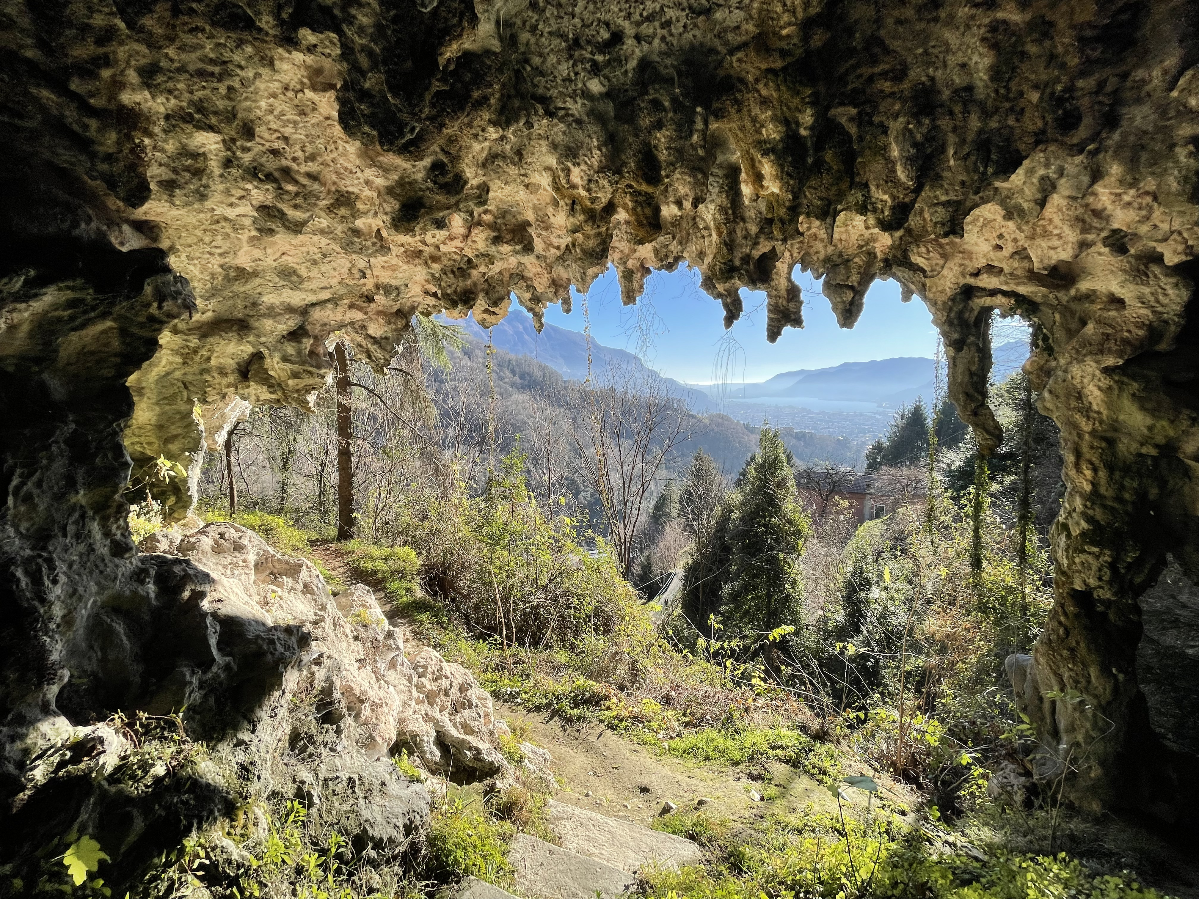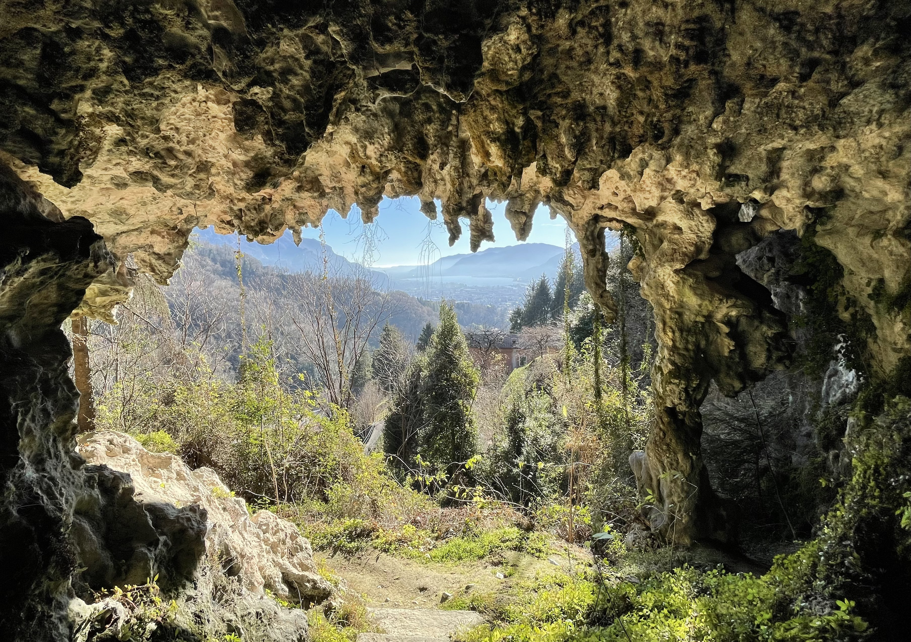 Grotta San Giovanni is near Lecco and Lago di Como, in northern Italy. As you can see from above, the views are wonderful! But there's a mystery: did this cave inspire Leonardo da Vinci's painting Madonna (or Virgin) on the Rocks?