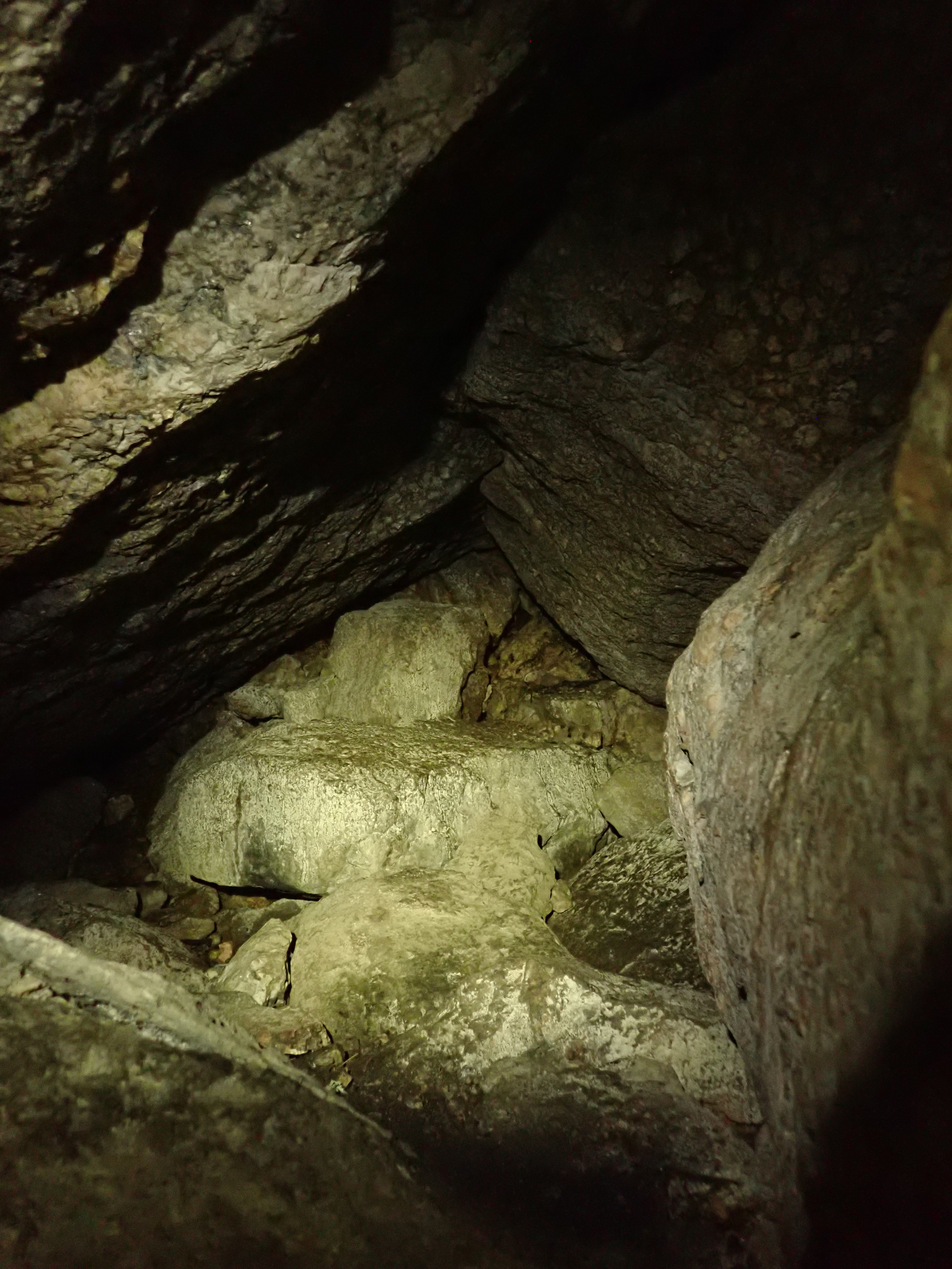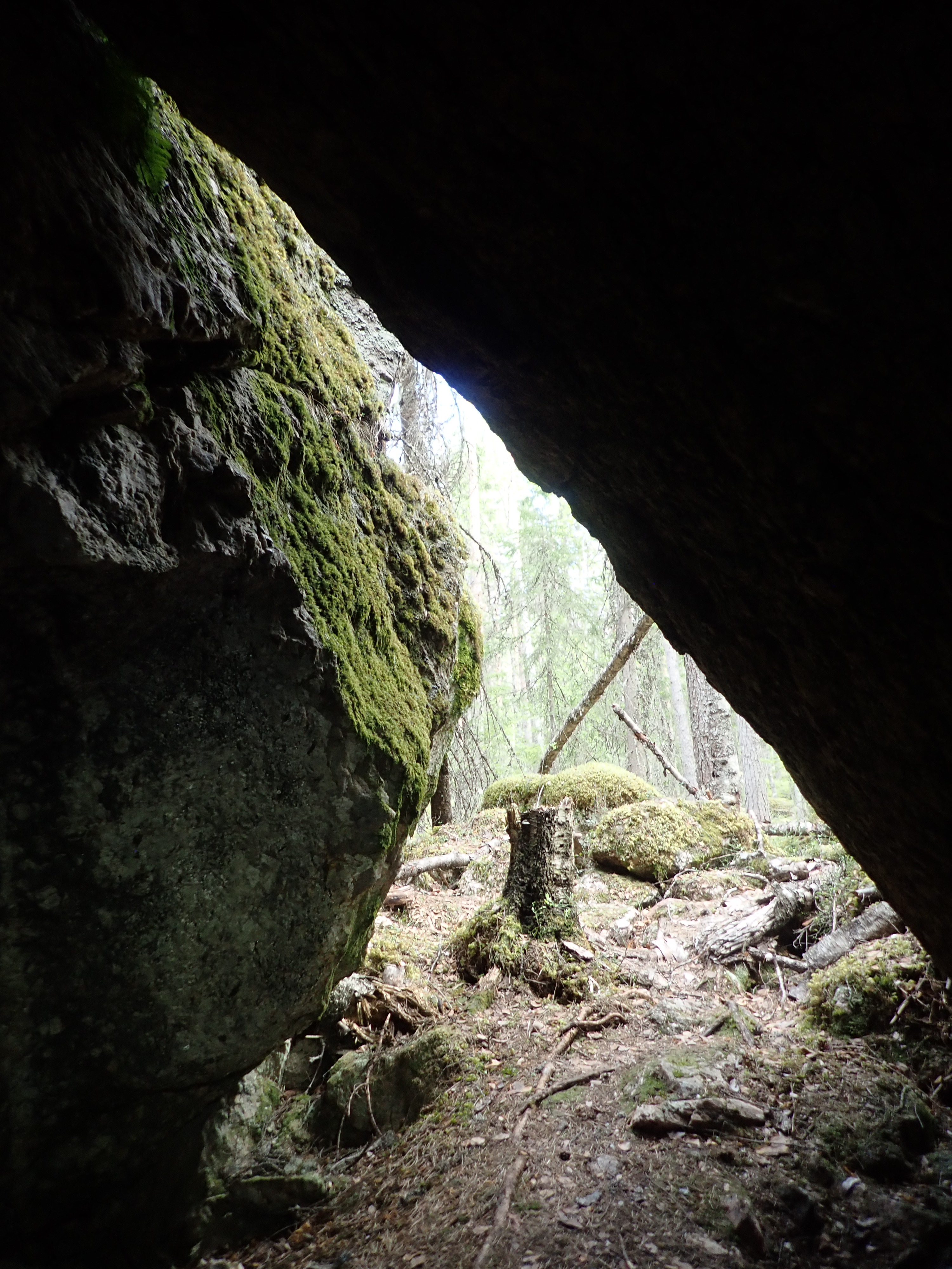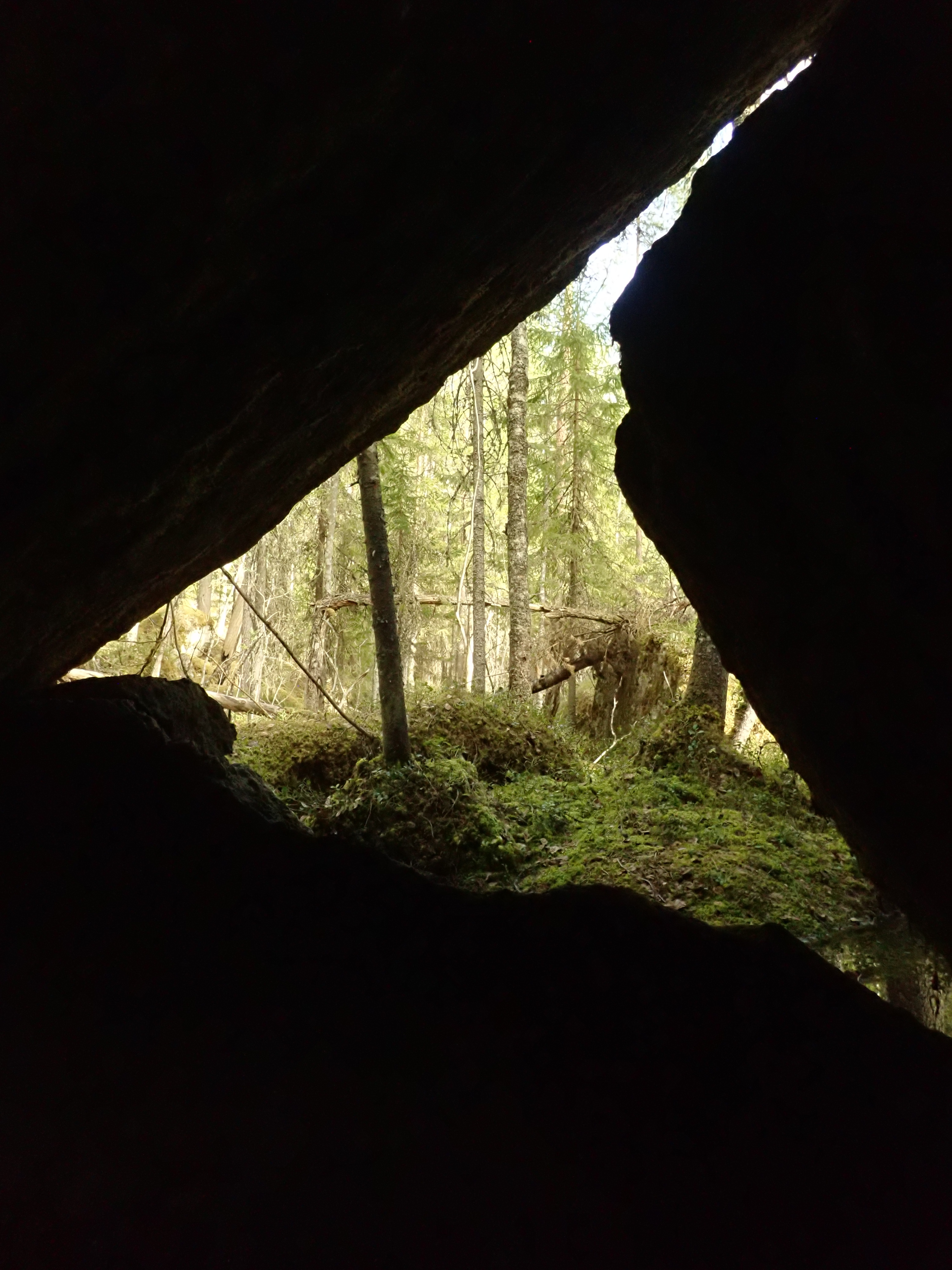 I visited Haavikkolehto to draw a map of the cave. But I also realized there are more caves, e.g., right next to the main cave there are other boulders, and inside their cracks there are other relative long (maybe 10-20m) of passages in a single cave, though perhaps not as spectacular large opening as in the main cave. The above picture is from that second cave.