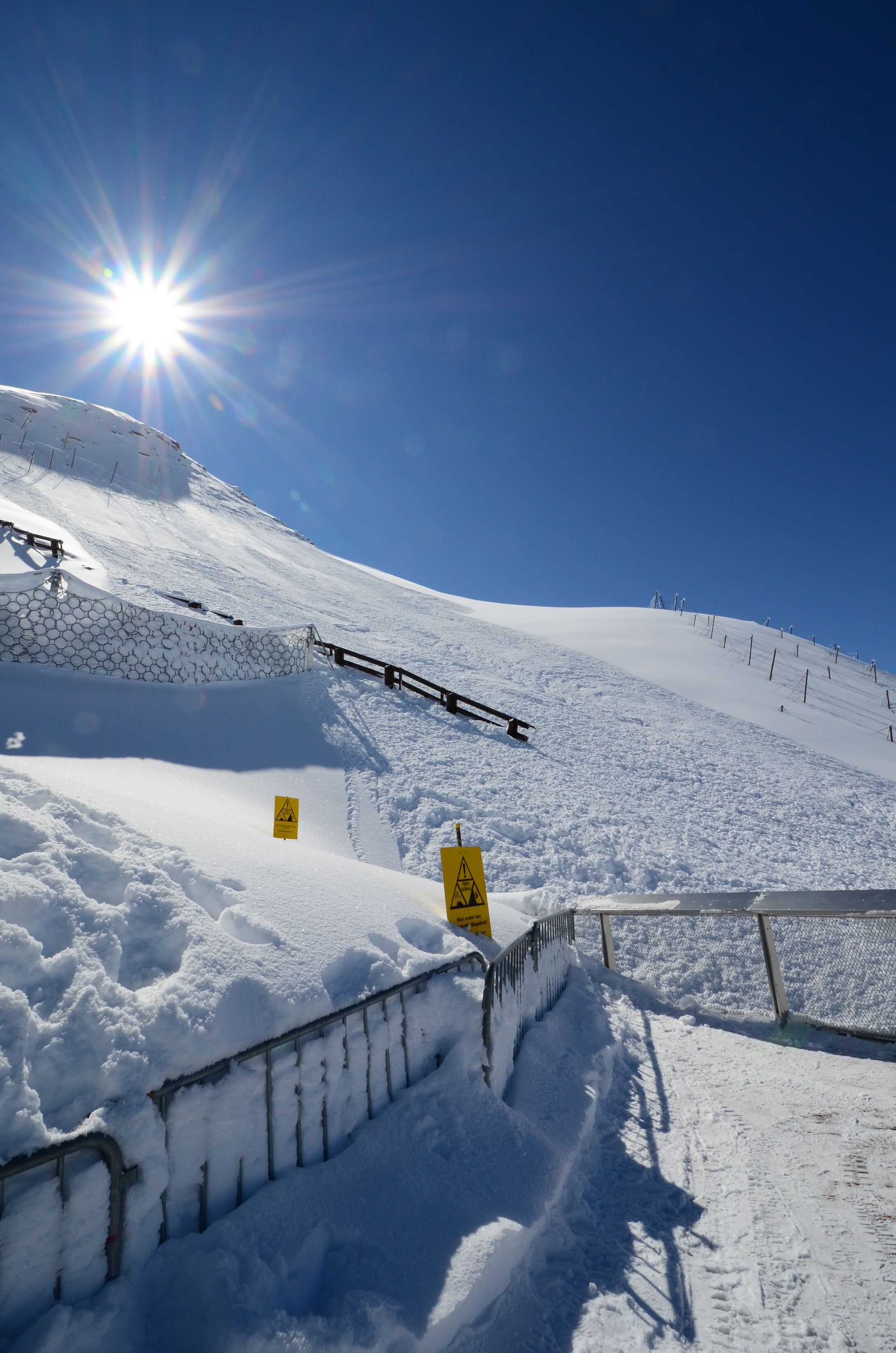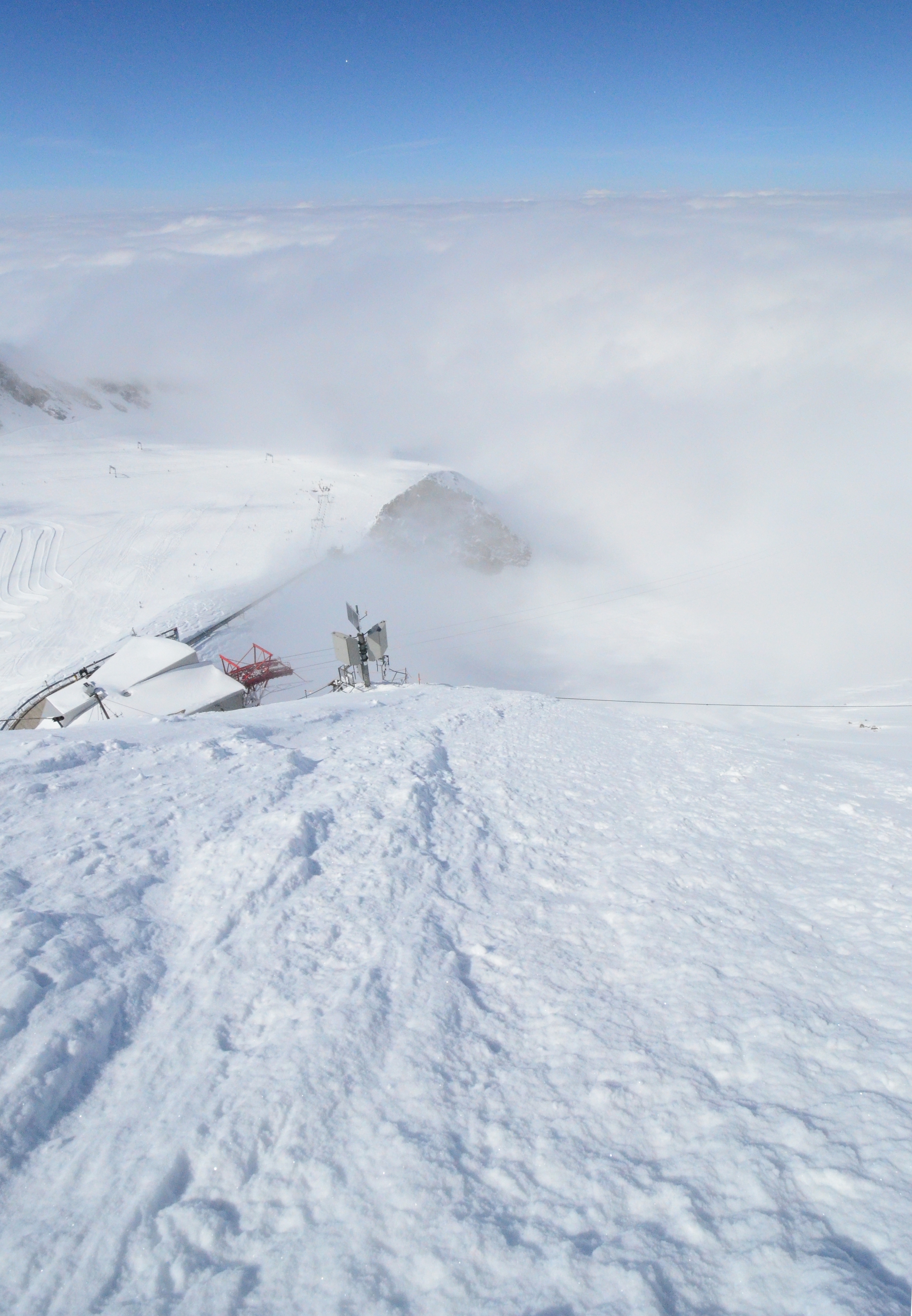 I started my ascent from the highest ski lift station at Kitzsteinhorn, 3029 meters. This is a multi-story station and observation platform. Complete with a movie theater at an altitude of three kilometers! In the beginning I was skinning under some avalanche protection nets. Some earlier work by the ski patrol had caused an avalanche here, and the snow was a little bit more packed than elsewhere.