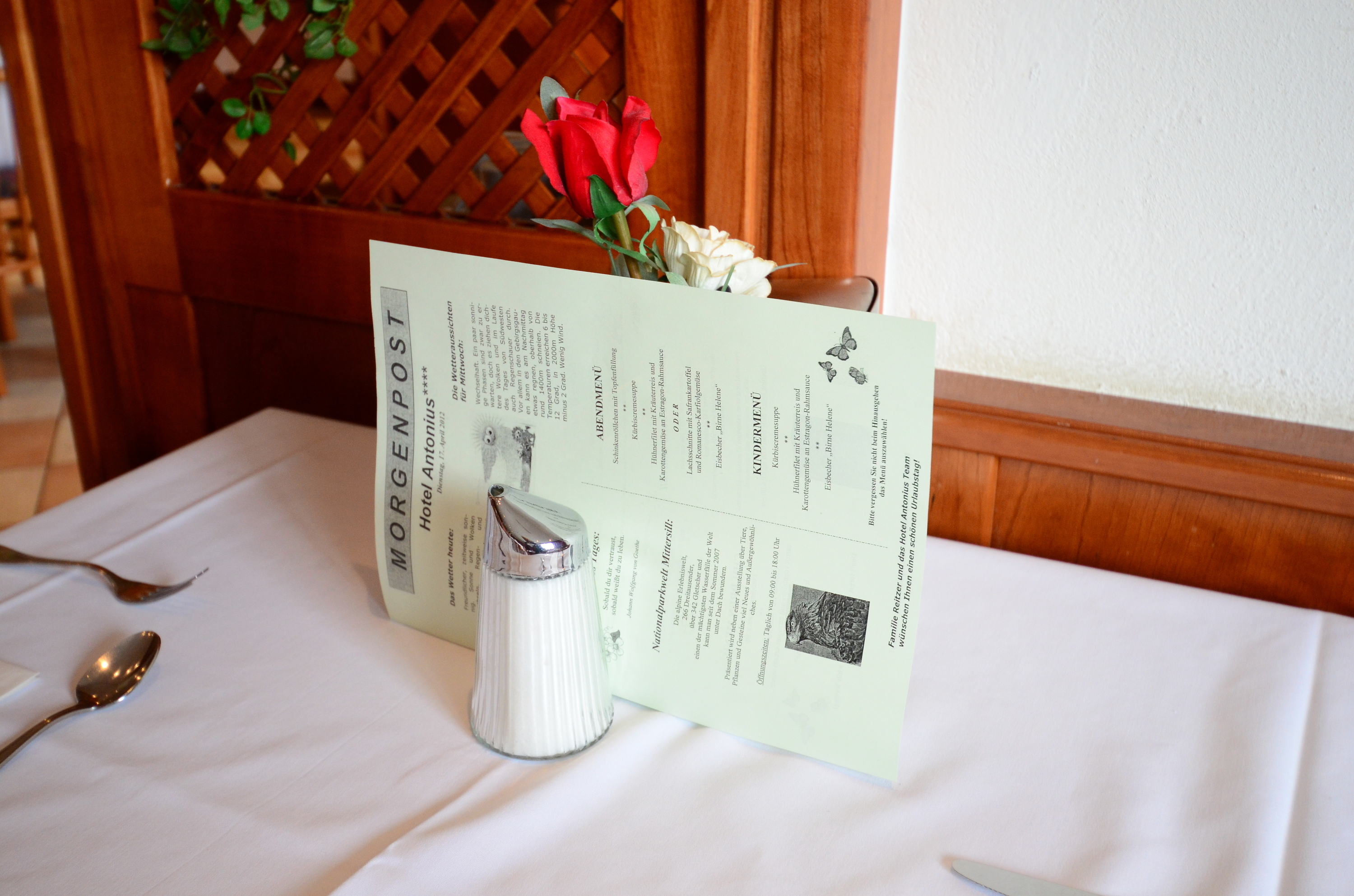 I stayed in Hotel Antonius, the first randomly selected accommodation in Kaprun that had vacancy. It turned out to be a nice place, though, with all the essentials of life: breakfast, garage, and sauna. Seriously though, it seemed like a good place to stay near the city center, a big hotel, a room with a separate bedroom for 80 €, and so on. They also had an innovation in the breakfast room that I'd love to see elsewhere: today's weather report printed on a sheet of paper in every table. Too bad the English version on the backside skipped mountain weather, however :-)