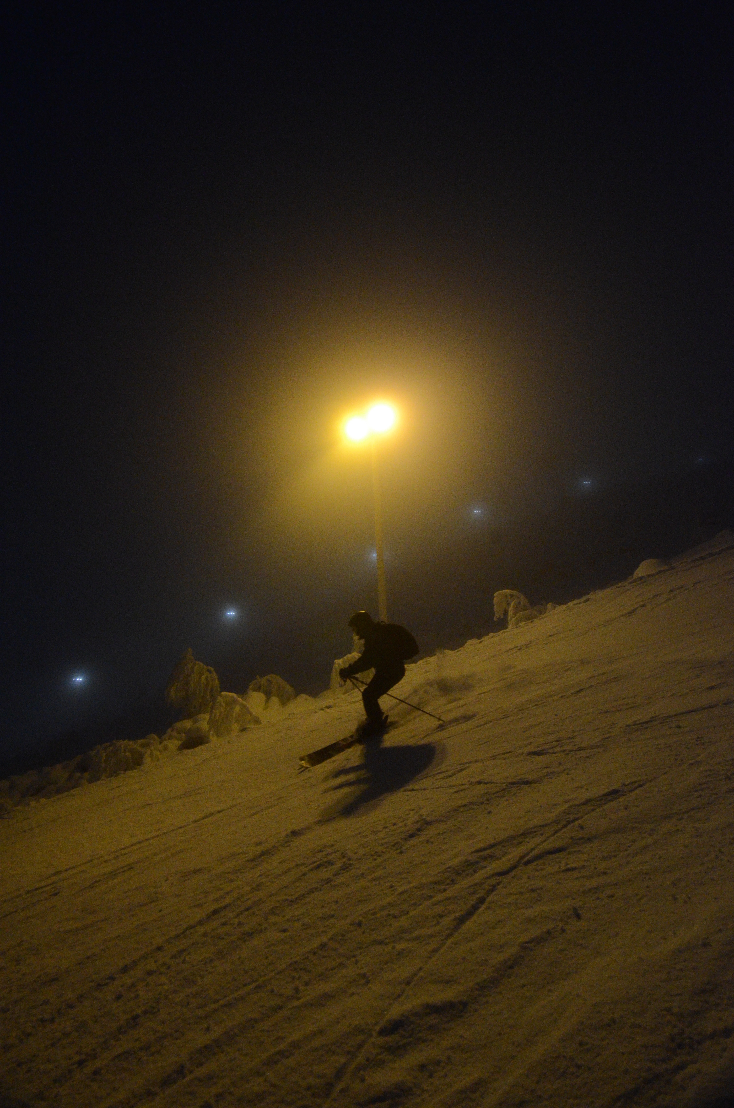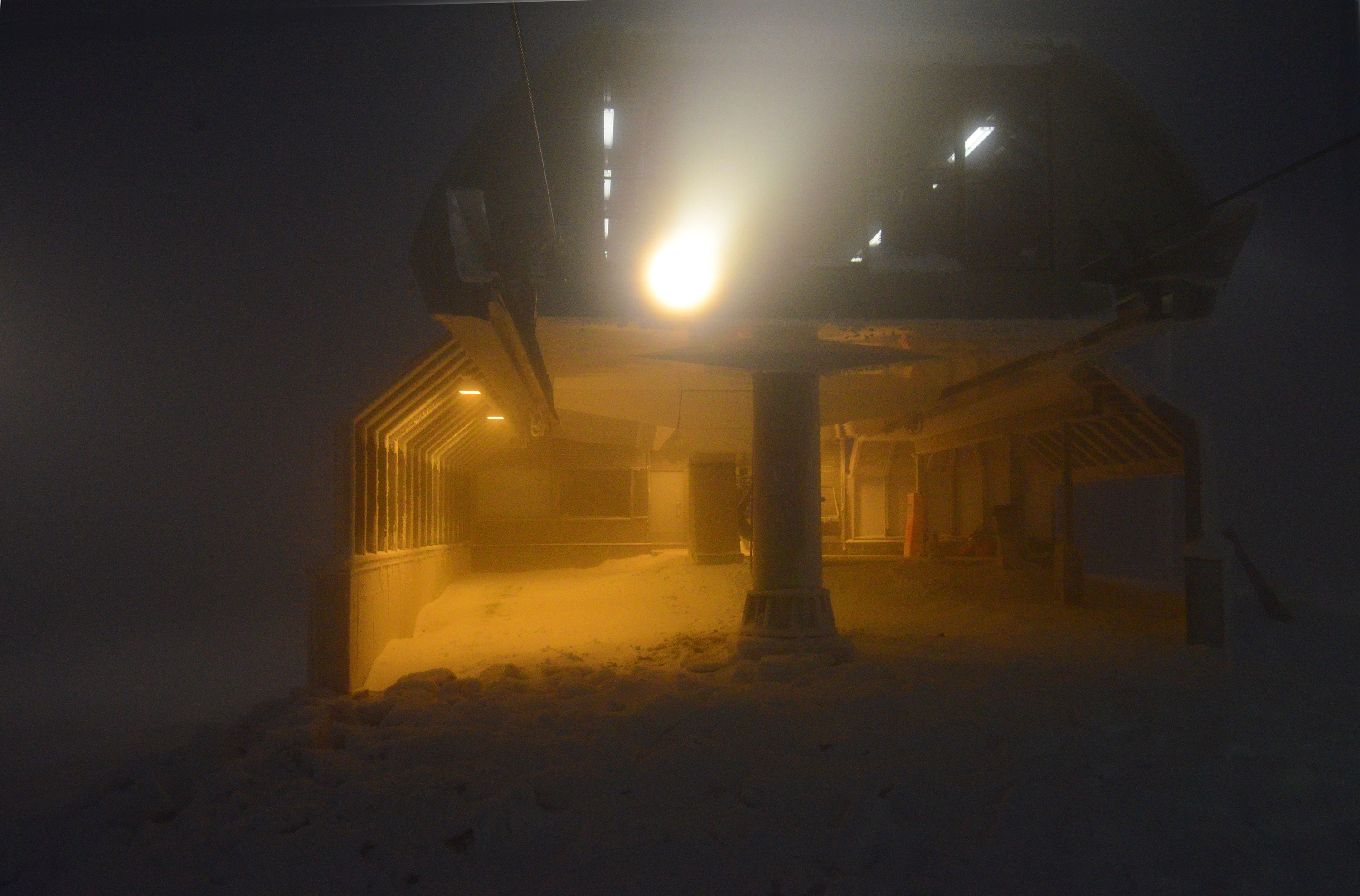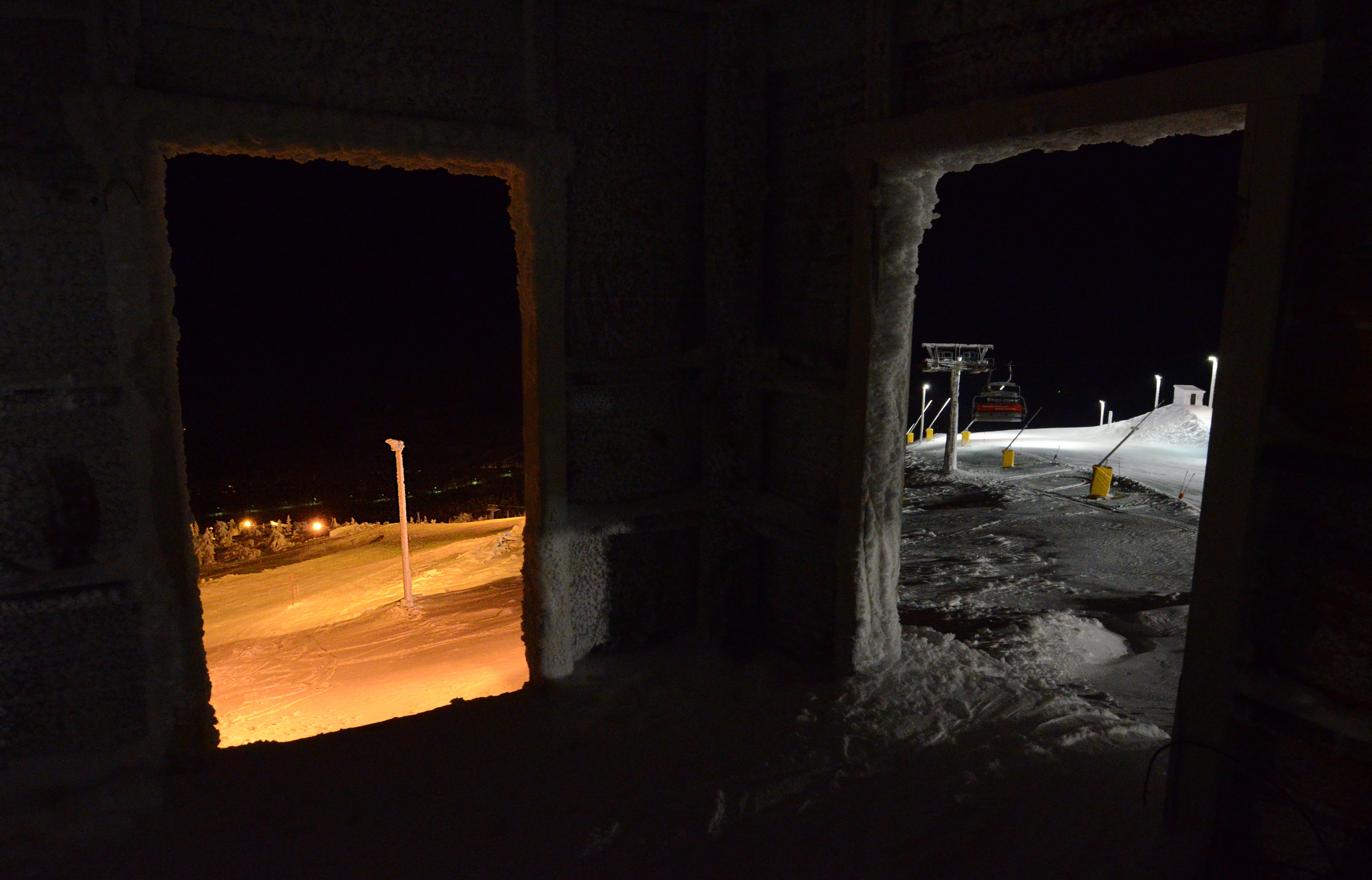 But the black door opens up the ultimate reality. The door to everything else. Even the orange world exists in a bubble of human control. A bubble of light, for instance. If you back away from the two orange and white doors, you'll find yourself in the completely open domain. Darkness. Thin and uncertain snow cover. Rocks. I found this domain the most interesting, even if there was indeed very small amount of snow. My skis kept hitting the rocks and I had to watch where I'm going. I enjoyed a ski run in the fresh snow on the closed Blue Run, the area between the Blue run and the Polar Runs, and the Hotel Runs, a rocky area above the hotel.
