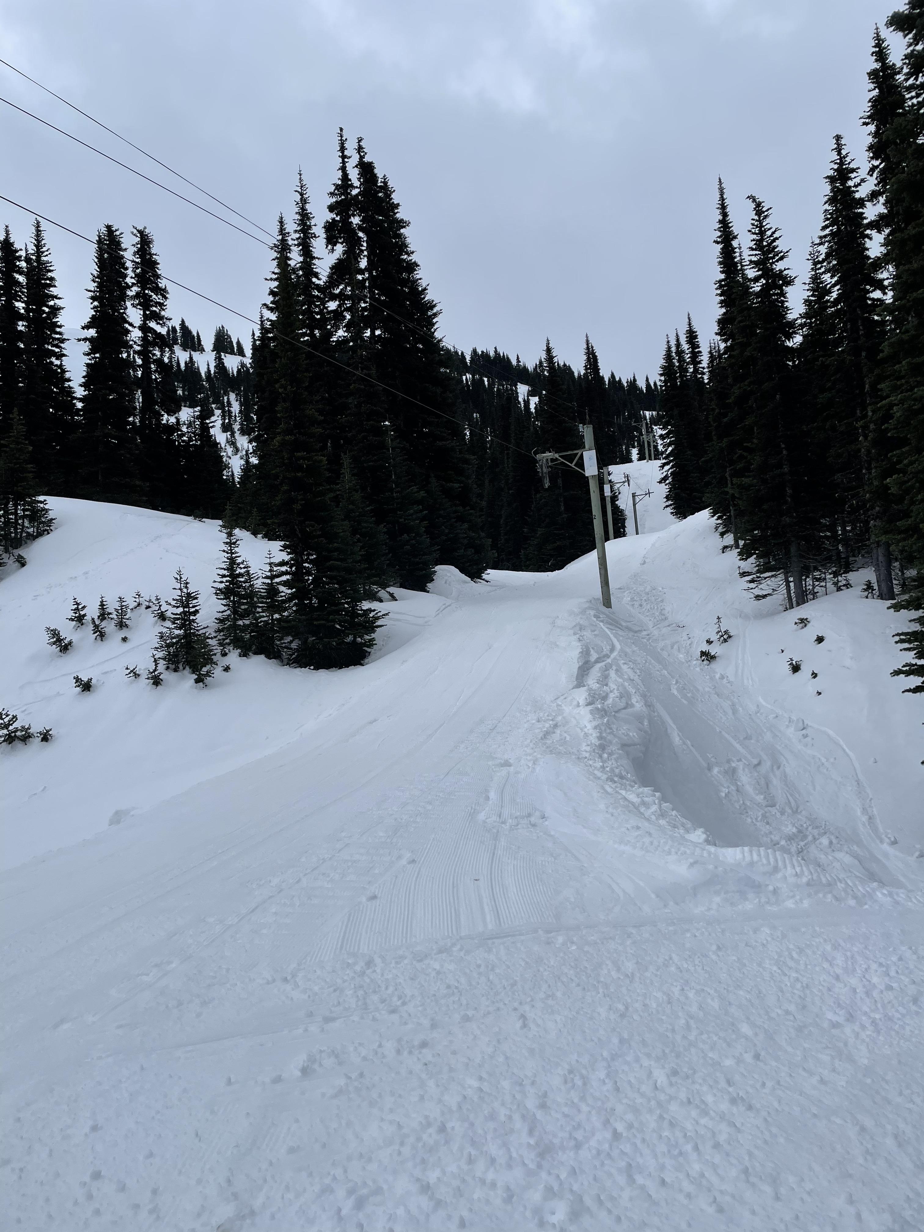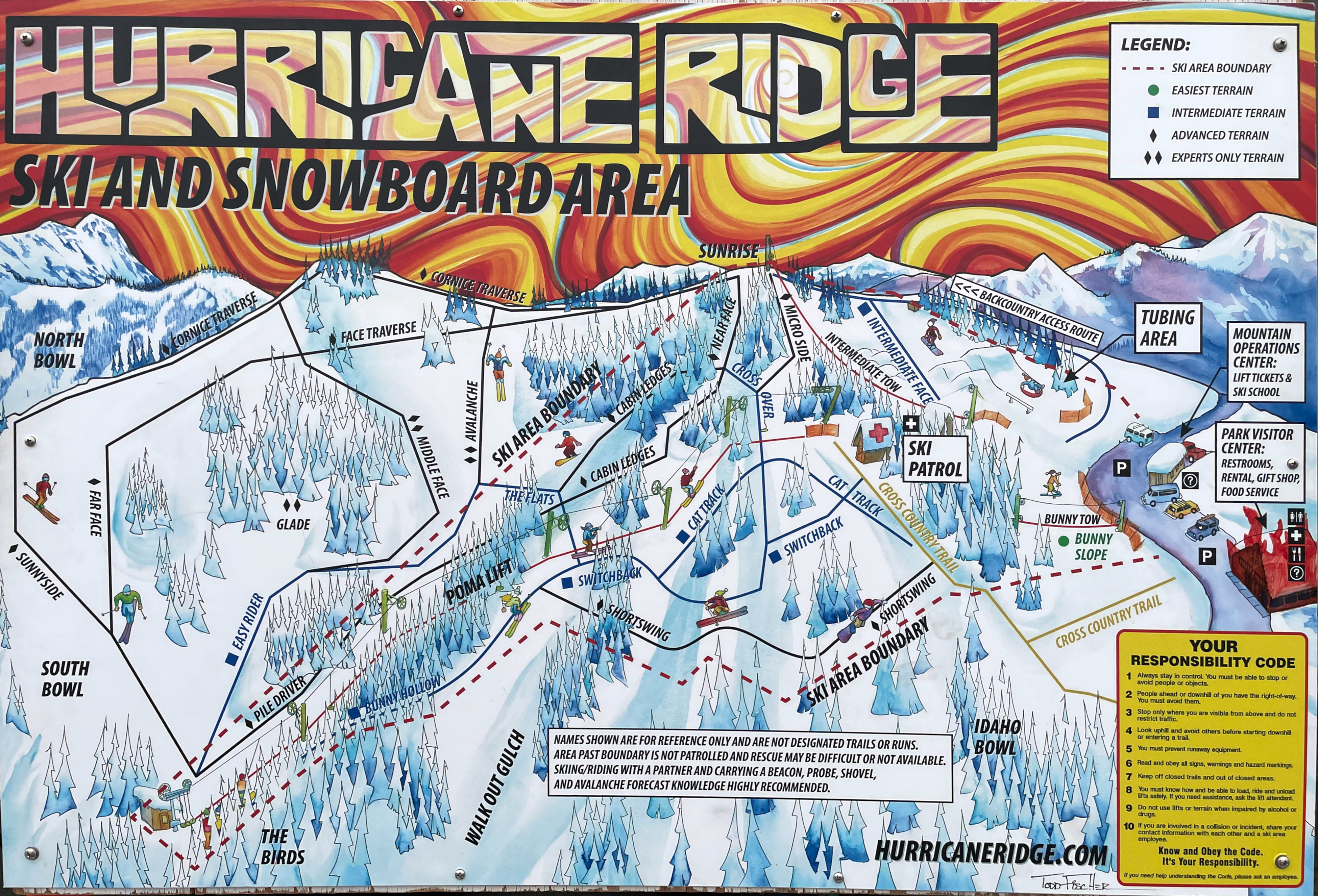 The summit elevation is 5240 ft or m, and there's 800 ft of vertical. The official website (including traffic information) is here. The resort is a small, family-oriented ski and snowboard area, supporting a ski school, ski team, terrain park, and tubing area. The area is operated by the non-profit Hurricane Ridge Education Foundation. On site there's almost nothing - even the road isn't open expect Fridays, Saturdays, and Sundays. There's two containers, one for ticket sales and another for bathrooms. A parking lot.