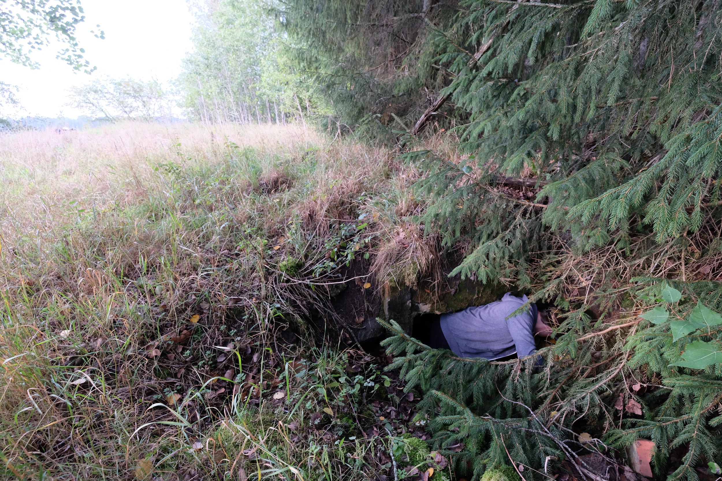 There's a big contrast between warm summer evening in the countryside, and what you find a few meters under your feet: a massive, blown up Soviet-era bunker. Damp darkness, rebar that is difficult to crawl through. And we're here to practice photography!