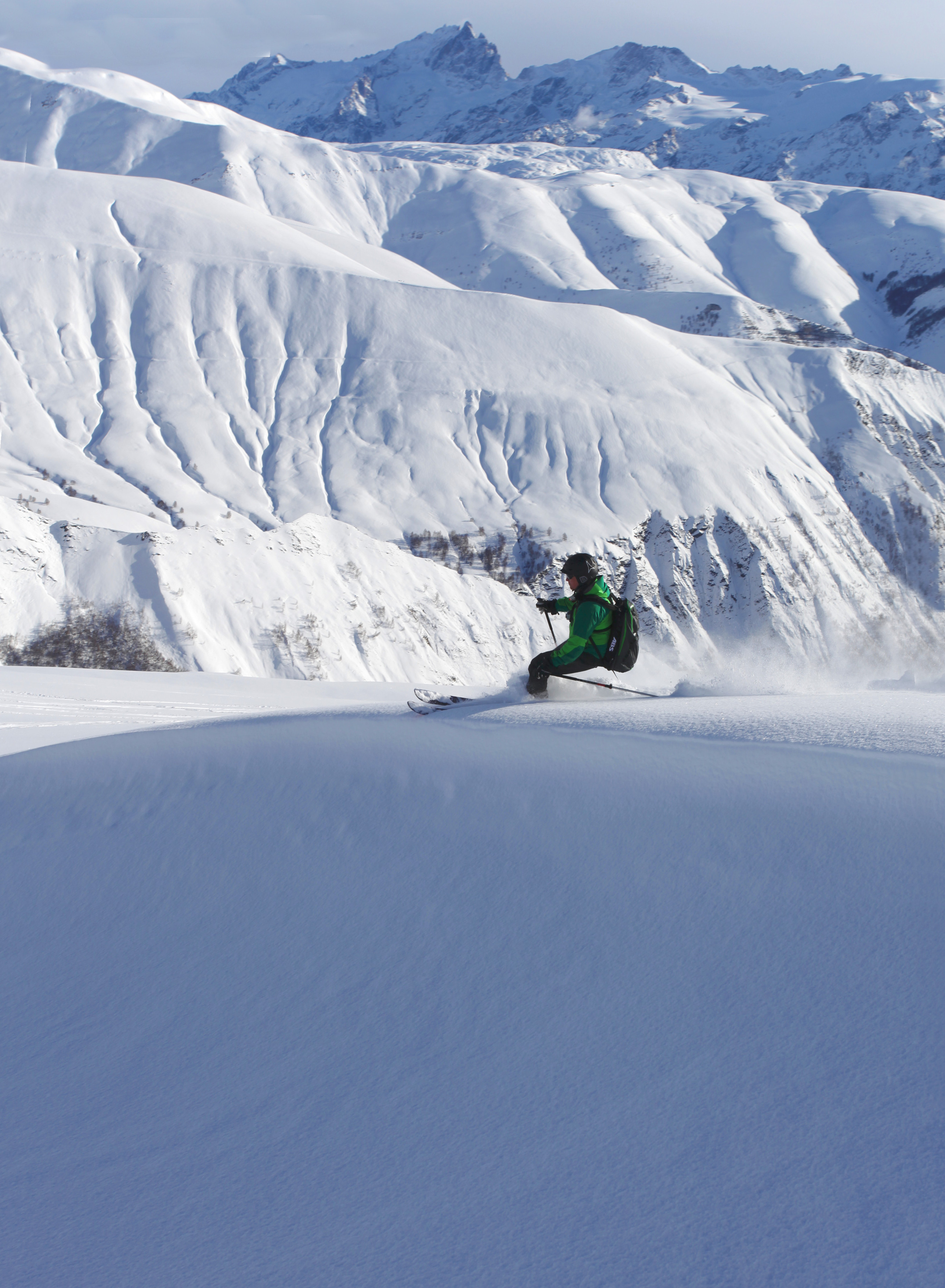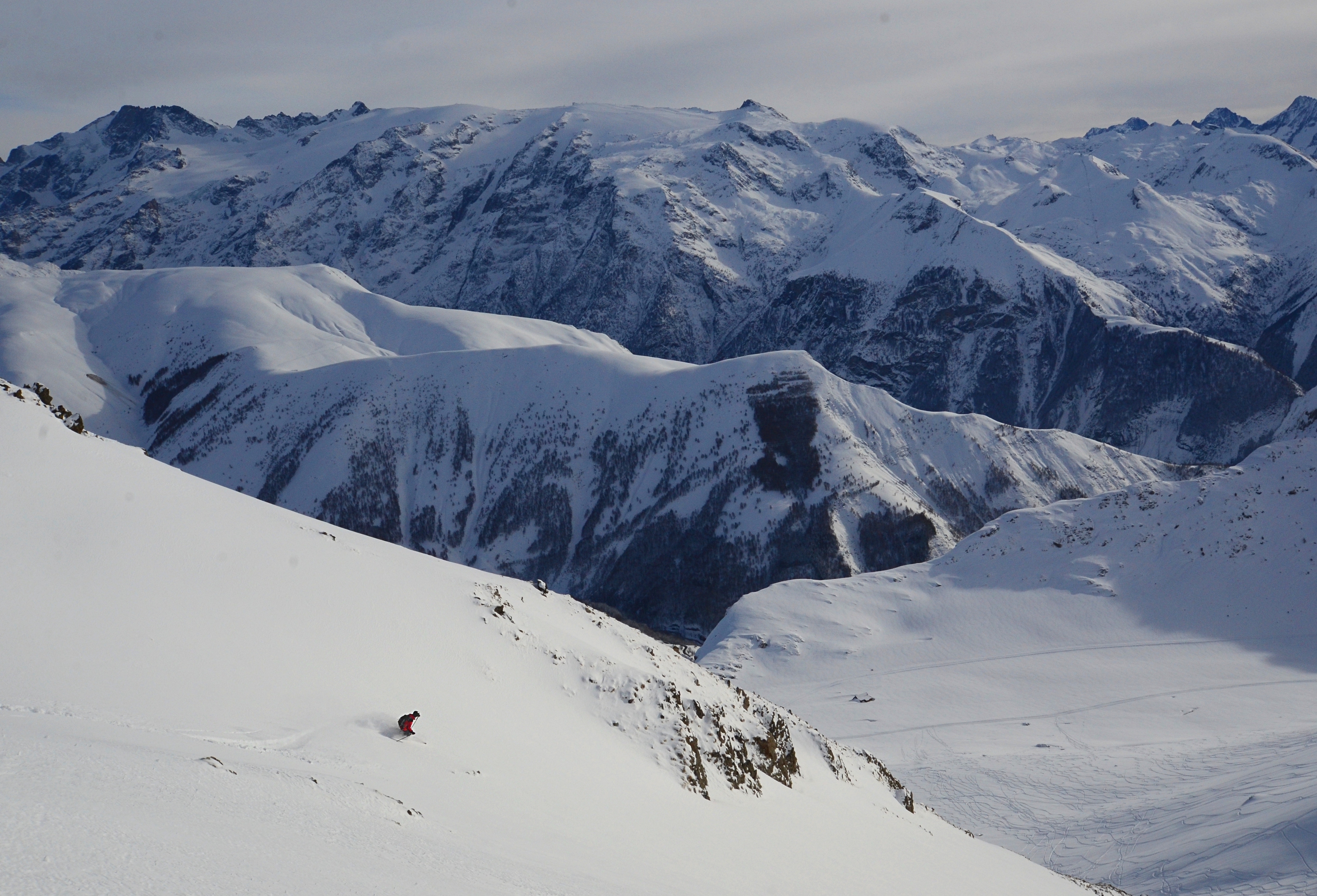 It turns out that it is illegal to use a helicopter to take us to a mountain. But there is nothing that prevents using one take us from a mountain. So we are using the lifts to take ourselves to the highest mountaintop in Alpe d'Huez, Pic Blanc. And then we ski the backside, choosing any route as long as it gets us to the small village of Clavans le Haut. A scheduled heliservice will then pick us up, and five minutes later we are back in the central parts of Alpe d'Huez. At the cost of only 60€ per a run. Each run is over two kilometers of vertical and in an amazing backcountry that takes time to negotiate through. You can only do one or at most two runs per day. The costs are amazingly low for heliskiing, although for the first time you have to get a guide to learn the route.