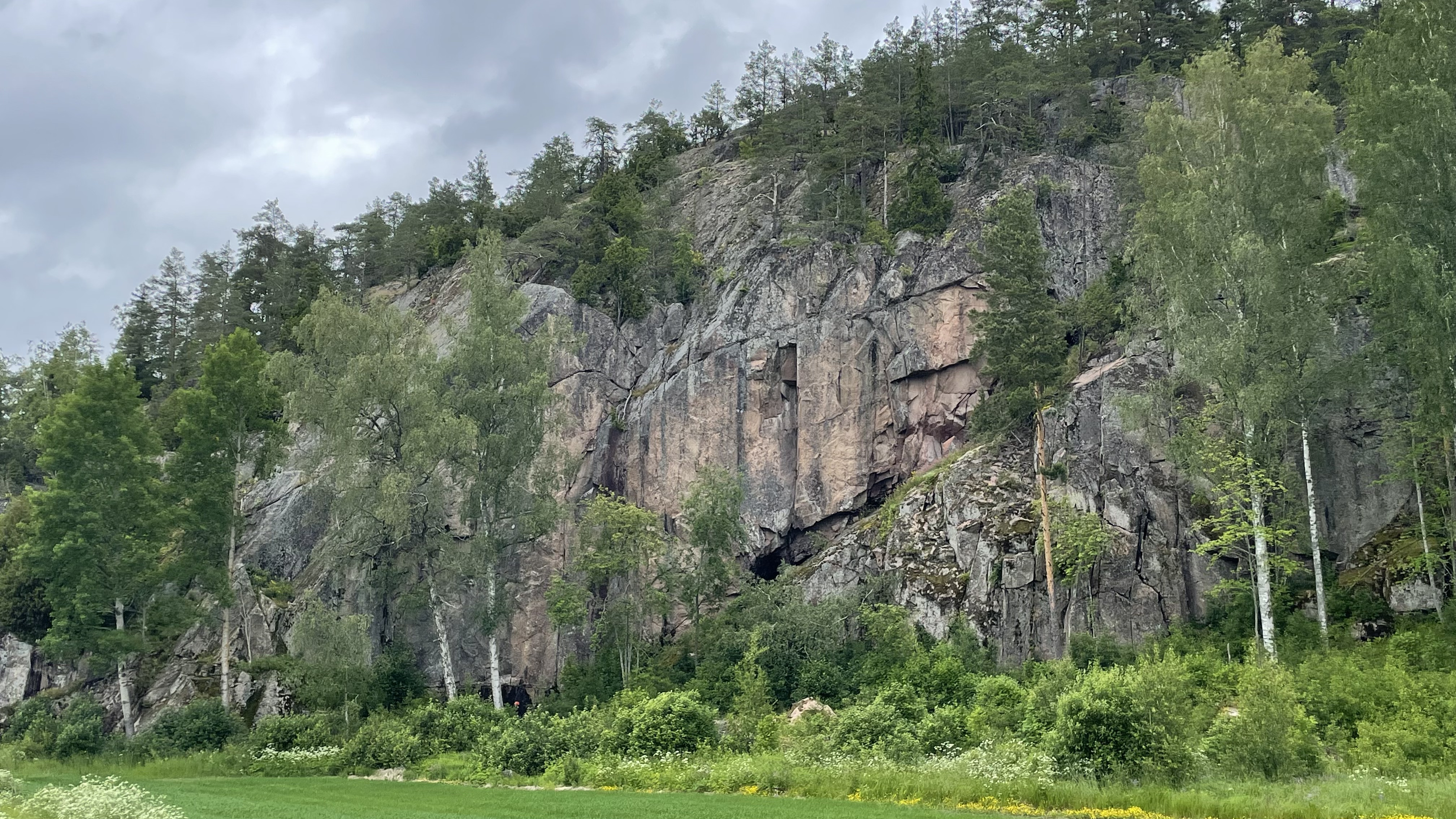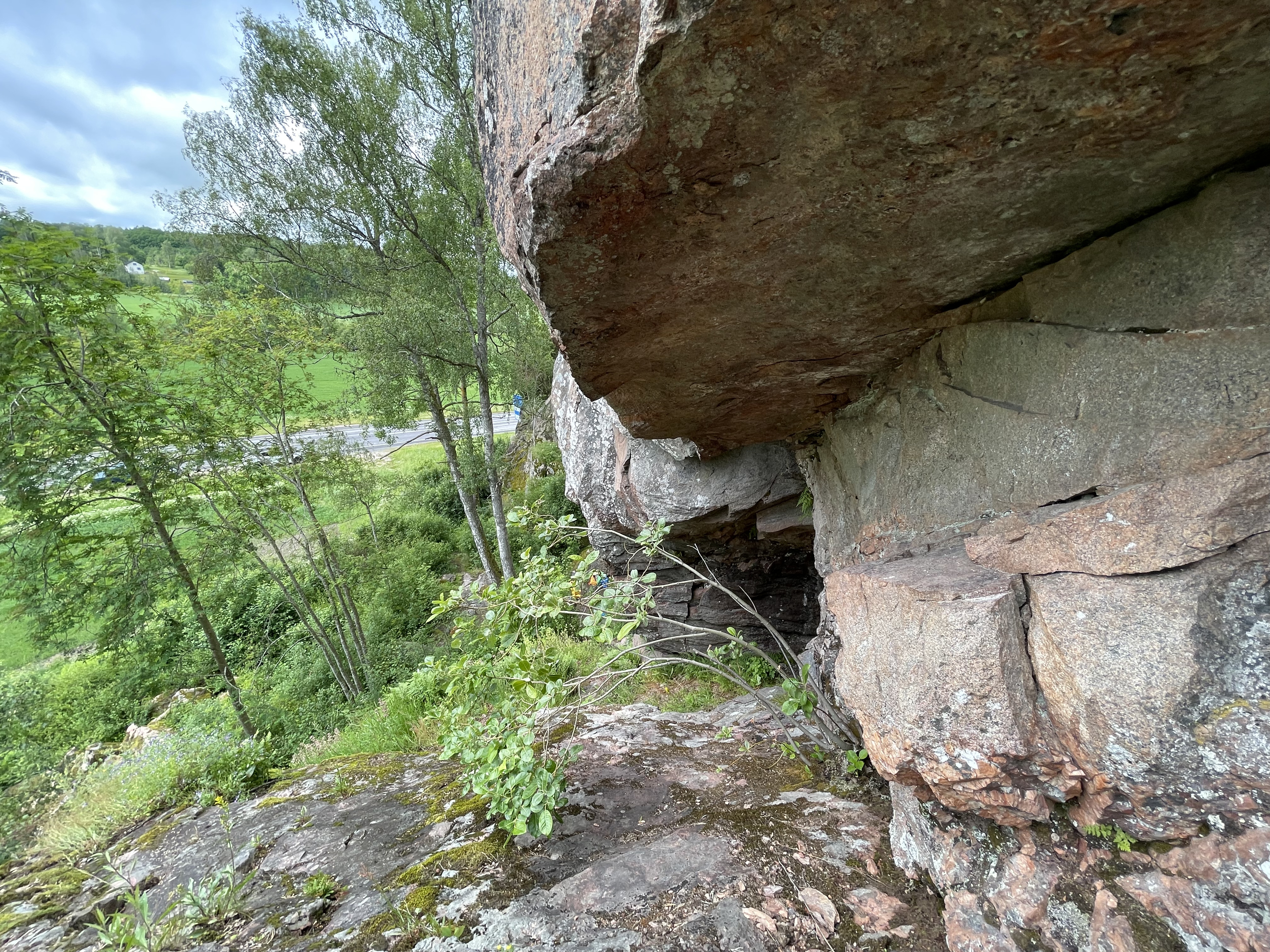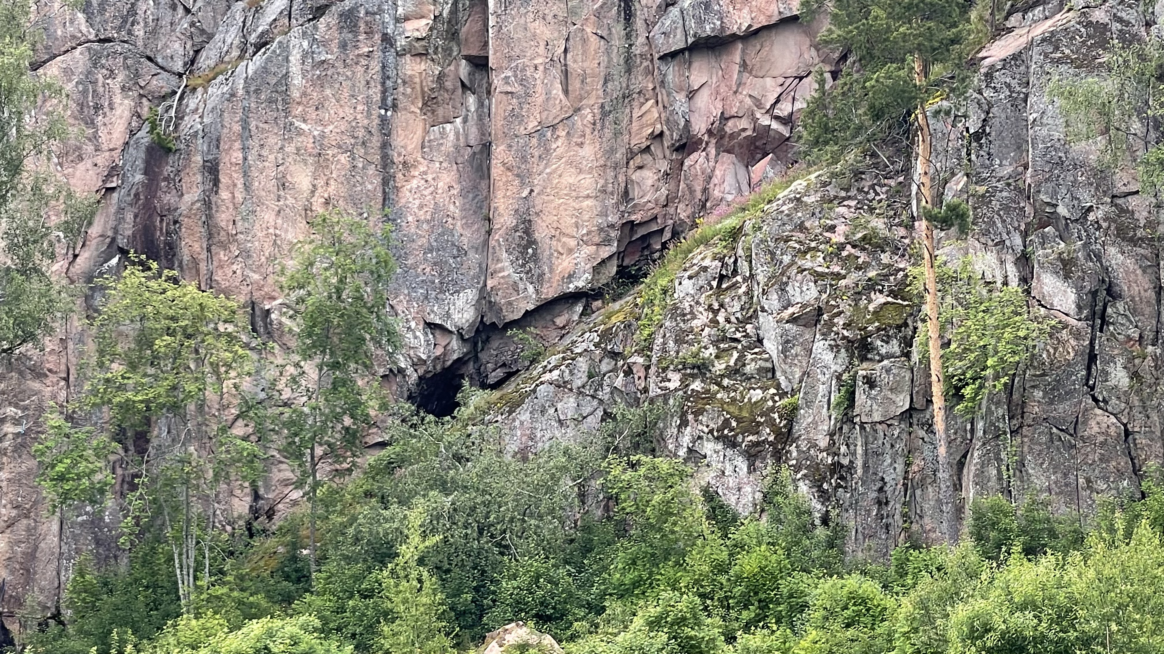 I was driving back from a very nice midsummer visit to a friend's cottage when I spotted a grand, 20+ meter cliff by the roadside. I had seen this before, but never had an opportunity to stop. But now I had to, because there was a hole on the middle of the wall, staring me in the eye :-) The question was though if I could get to it without climbing equipment. It turned out that a steep ledge was leading up to it, not great and not for wet weather, but still climbable carefully. So I got to the hole! It turned out to be a pretty small though, maybe 3 meters long. Still something, but as a too short cave I had to return it back to the nature :-)