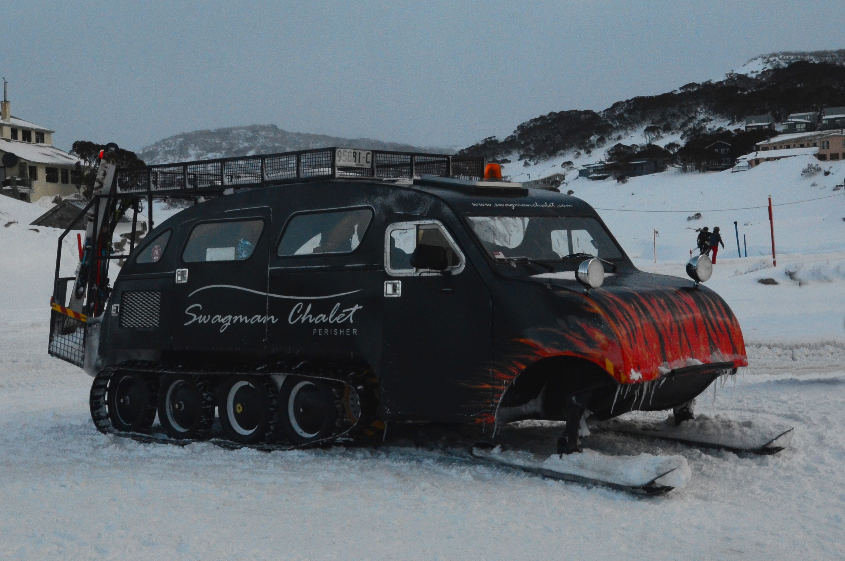 Wheels? It does not have wheels! Check out the "Swagman Chalet" transport at Perisher: