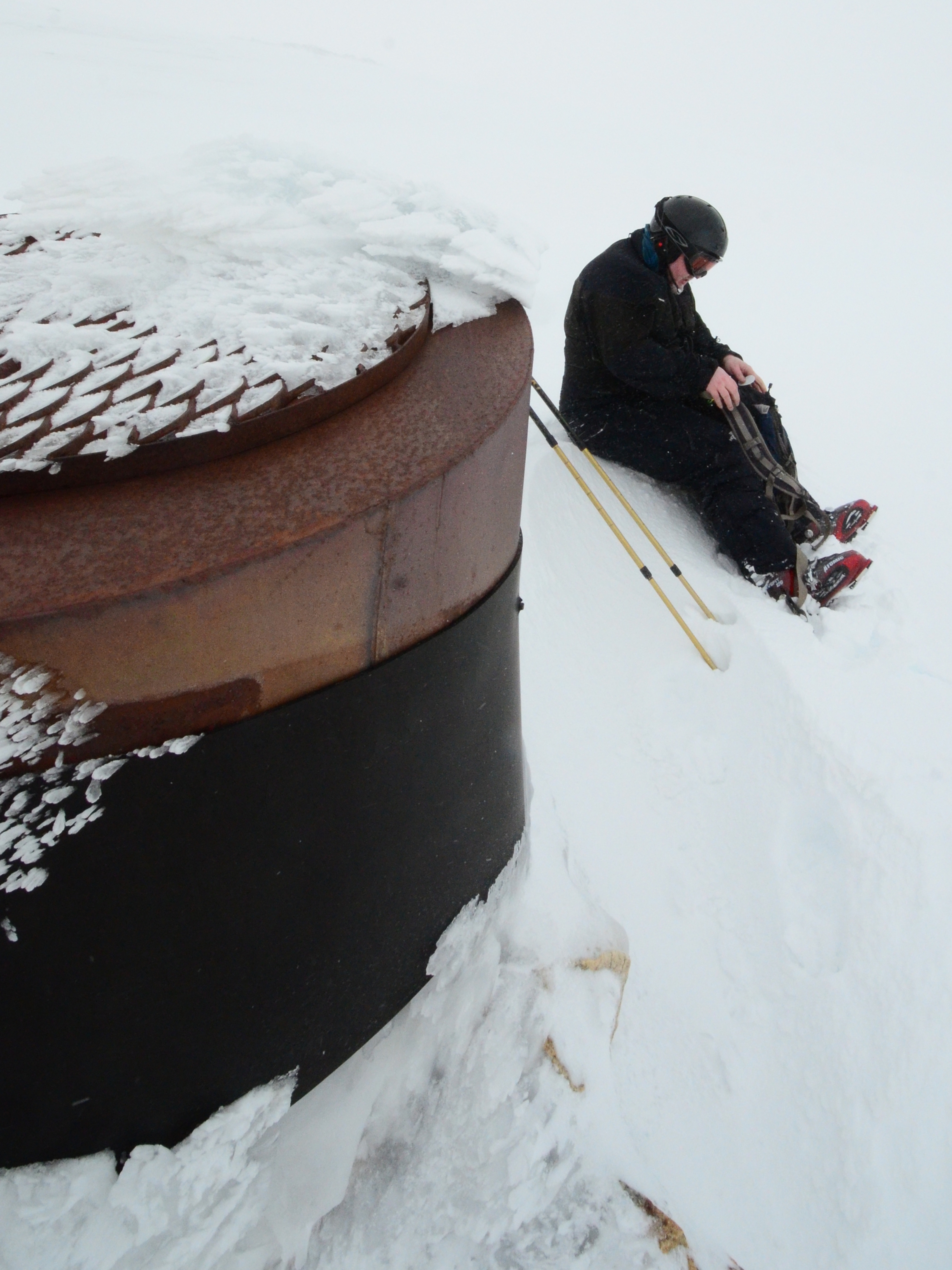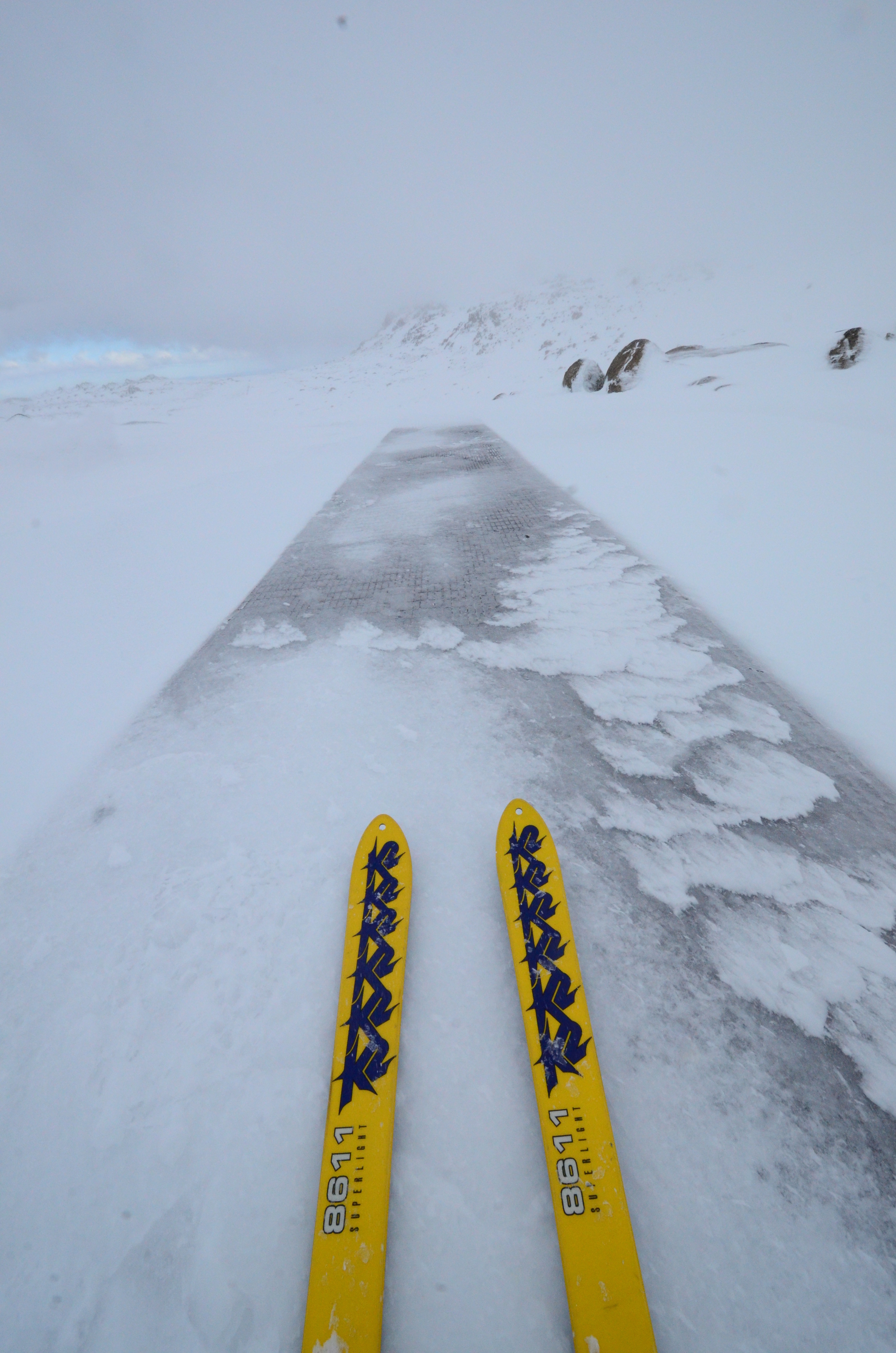 But in the winter reaching Kosciouszko is a different matter. First off, not many people seem to be doing it. The ski patrol people that we talked to had not done it, for instance, and we did not find easily available guide services to take us there. Secondly, weather and visibility can be an issue. Skinning slowly upwards, we ended up running out of time, light, and visibility. There were no clear skies during the day, and eventually we reached a point where we were just following the GPS track for the walking path, essentially blind to anything in the environment. Occasionally we were able to see the metal walkway, but mostly we barely saw the tips of our skis. We reached the toilet facility 100 meters from the summit. I would probably have been crazy enough to continue to the summit in total whiteout conditions with just the GPS guiding us. But it was also getting late and Tero's feet were developing blisters. We turned back. But hey, we did reach the highest toilets in Australia! I wonder where the highest toilets are in other continents. Might be worth a tour...