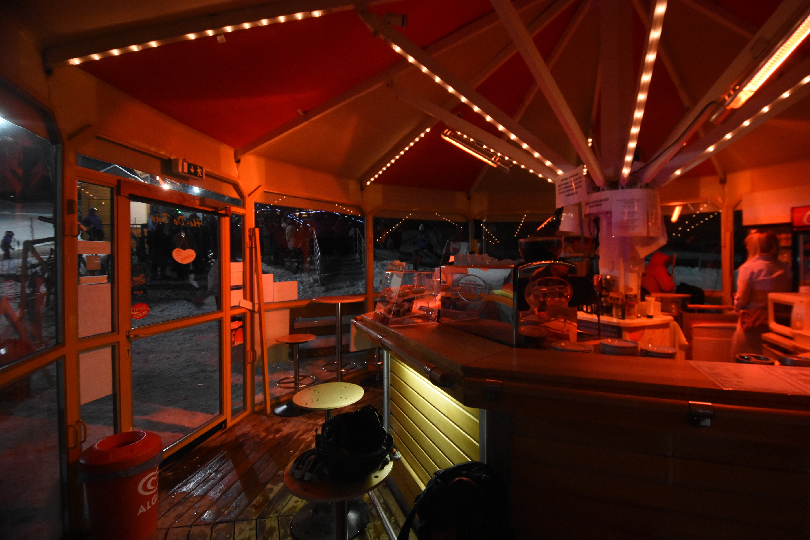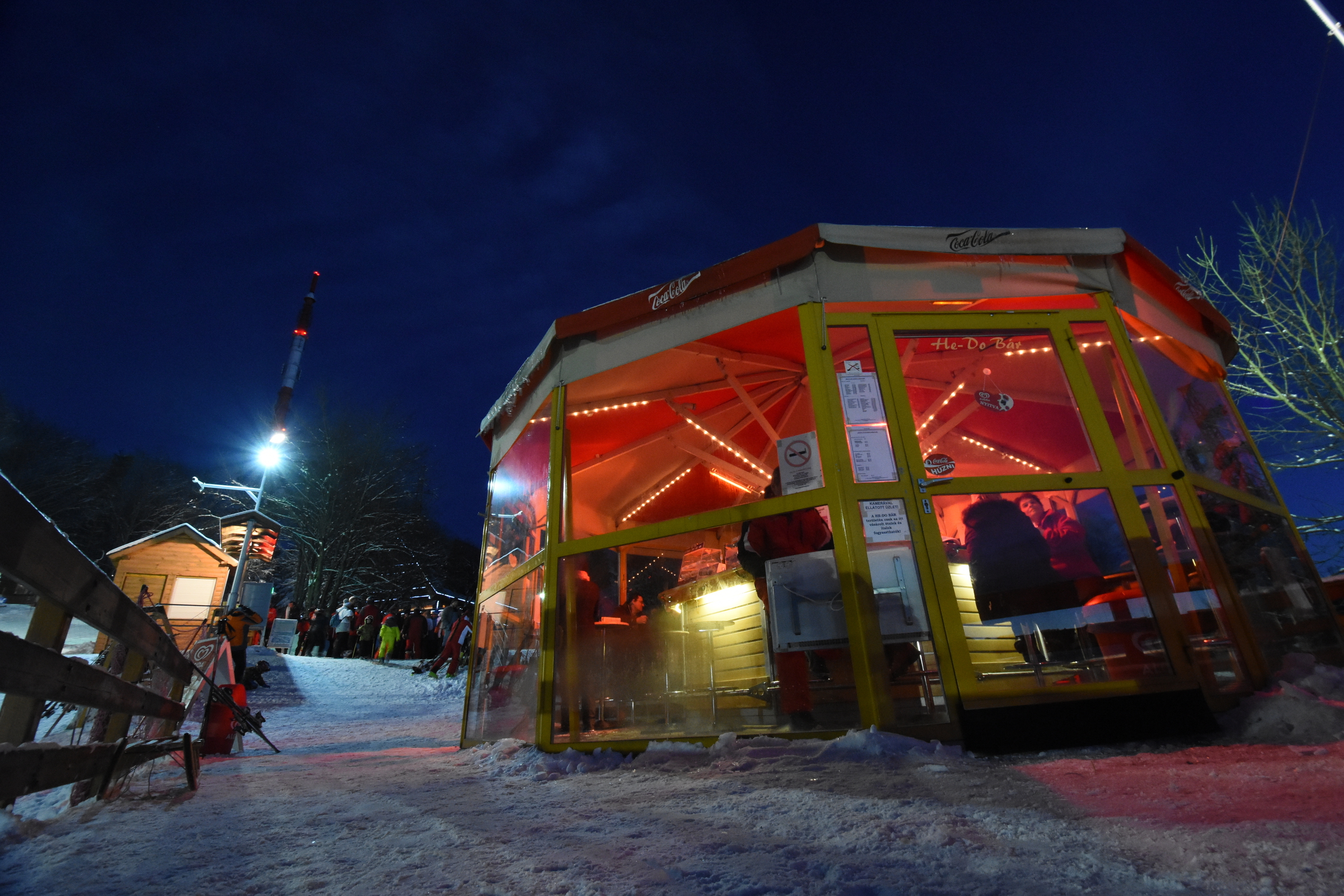 About the after ski: The "He-Do Bar" provides the entertainment venue for the slopes. A round ret hut offers small snacks and drinks. A red oasis in the dark and cold night.