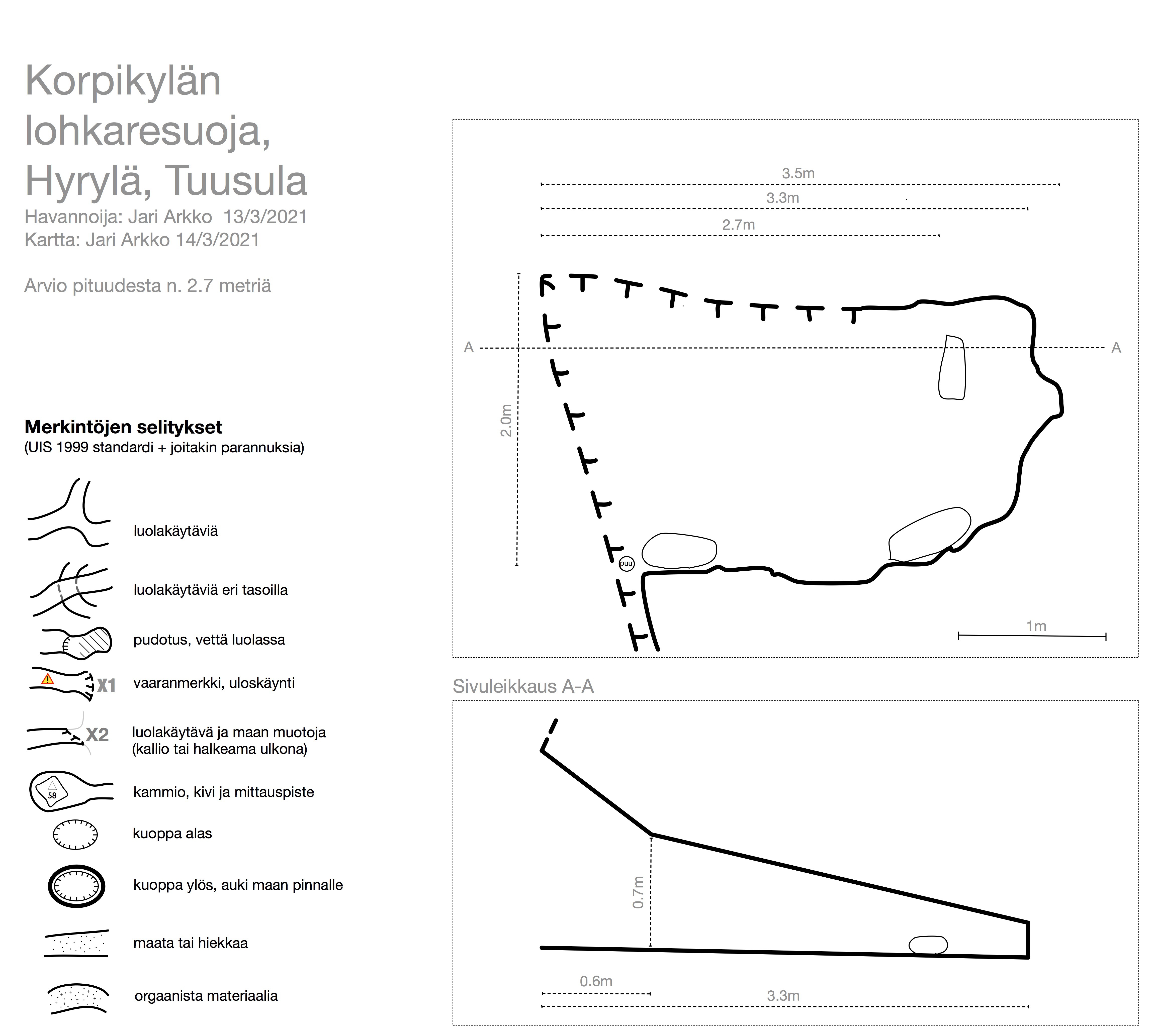 The cave is at coordinates N 60.38458 E 25.05021. I drew a simple map of the shape of the cave: