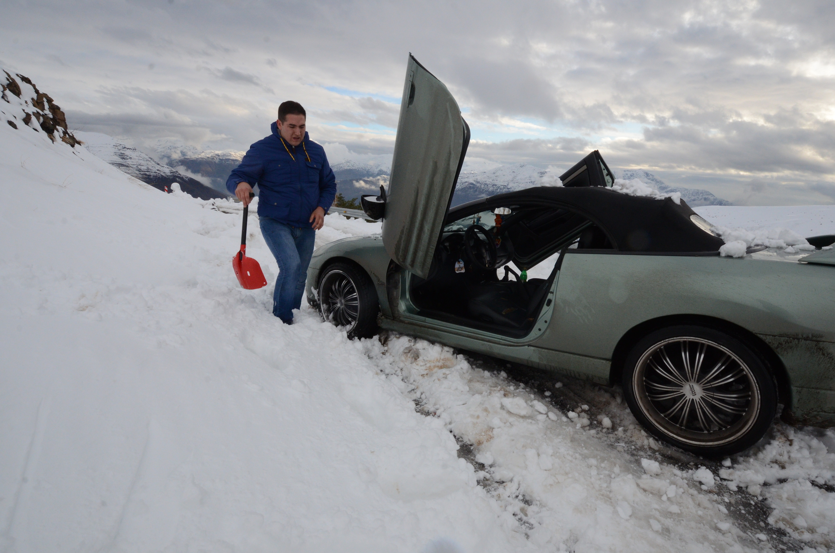 We eventually found a steep backroad, barely drivable, but one that delivered us on the closed ski area road above the police. Onwards to the ski area! Funnily enough, the ski area itself was not closed, and further up on the road we even found a guy working on installing chains. To this day, we don't know why the police was blocking the road. A temporary closure? We were going up too late in the early afternoon, after our long drive from our previous hotel? Language problems?