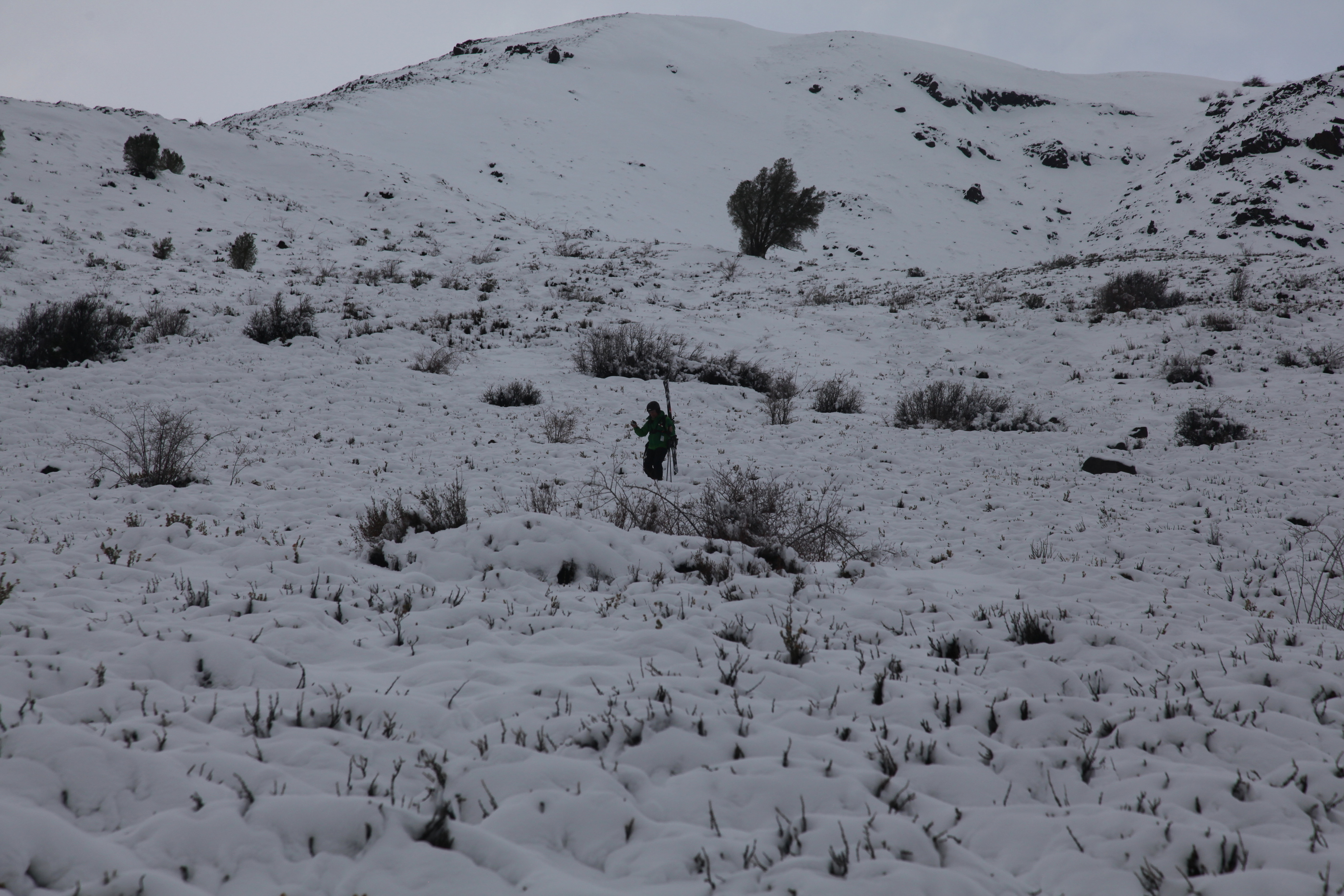 The second issue was that I wanted to ski as far down as possible, but eventually I ran out of snow on a long slope between the switchbacks. There was a small snow cover, but it covered a rocky field, and my skis were making even worse sounds than usual. I had to take off the skis and walk the rest.