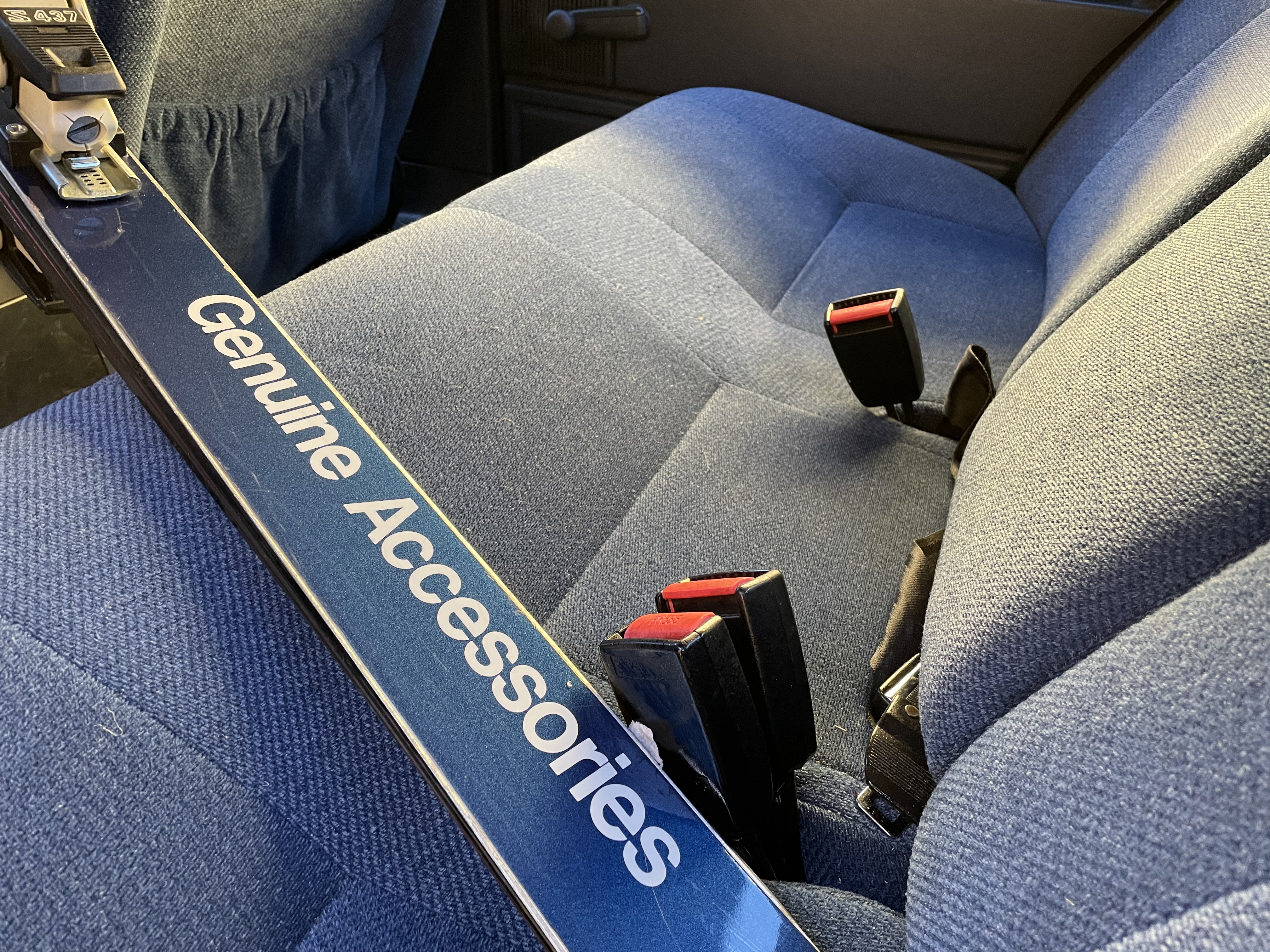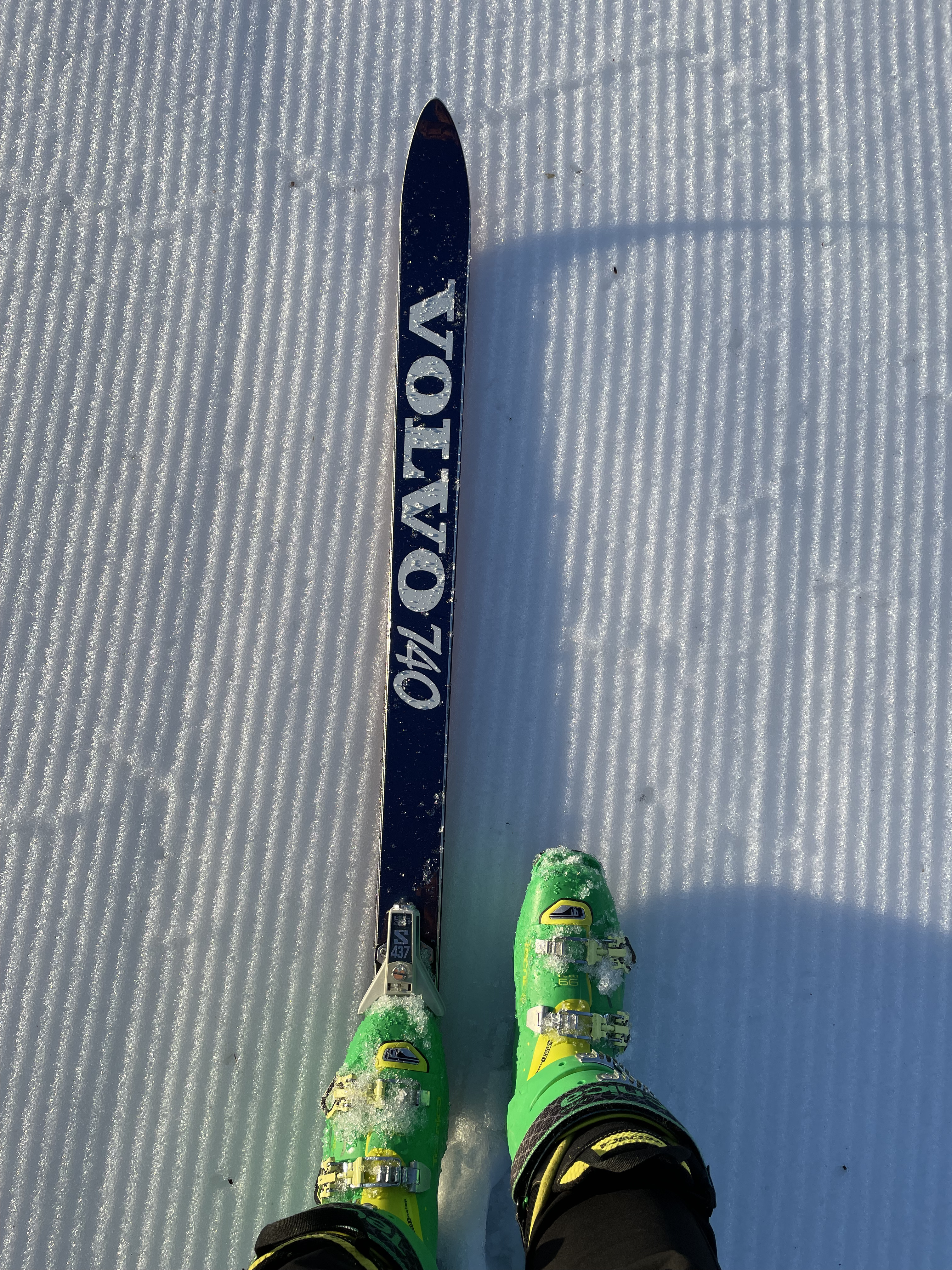 Only three days of legal driving left. The Volvo goes to a last-ditch cheap attempt to fix it, but, the odds are not great. Took the car for a spin today, along with the 'Genuine Accessories' aka the Volvo 740 skis. Just like the car, however, the skis are aging, one binding's plastic parts disintegrated. No prob, one ski is enough.