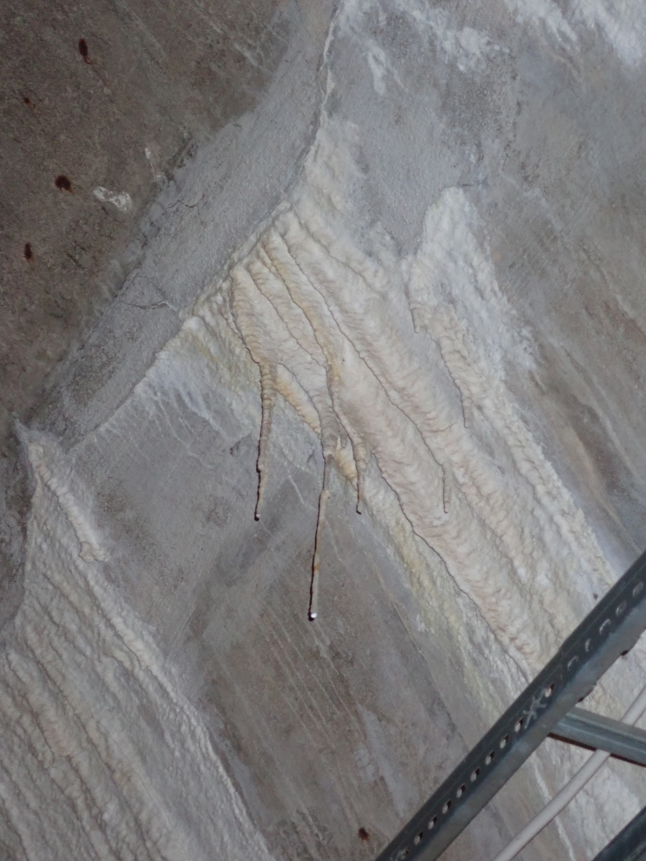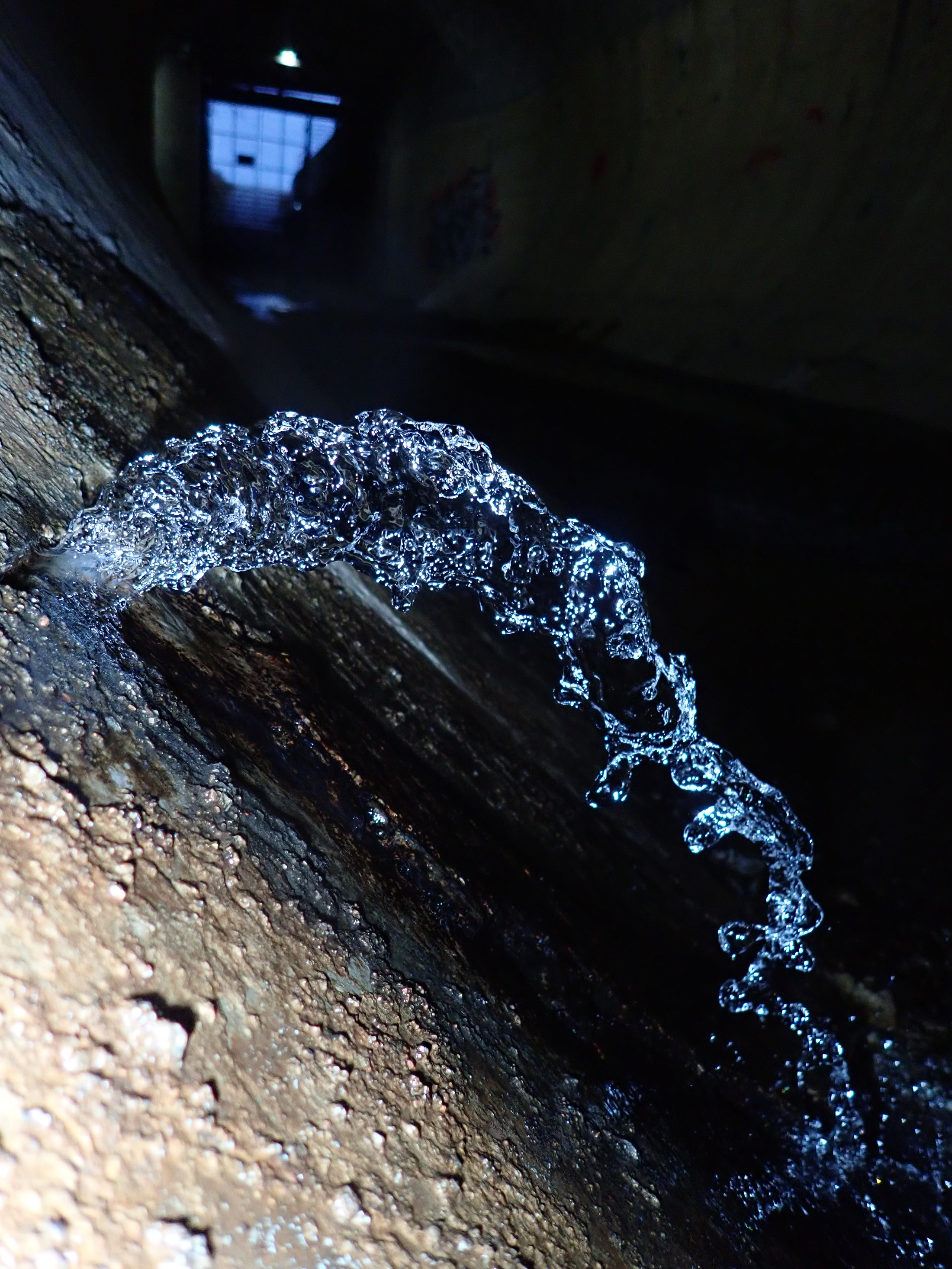 Interestingly, when we got into the second tunnel, we realized there's a leak. Water spraying in an arc. Not much to cause a flood, but clearly there's water behind the walls wanting to get in.