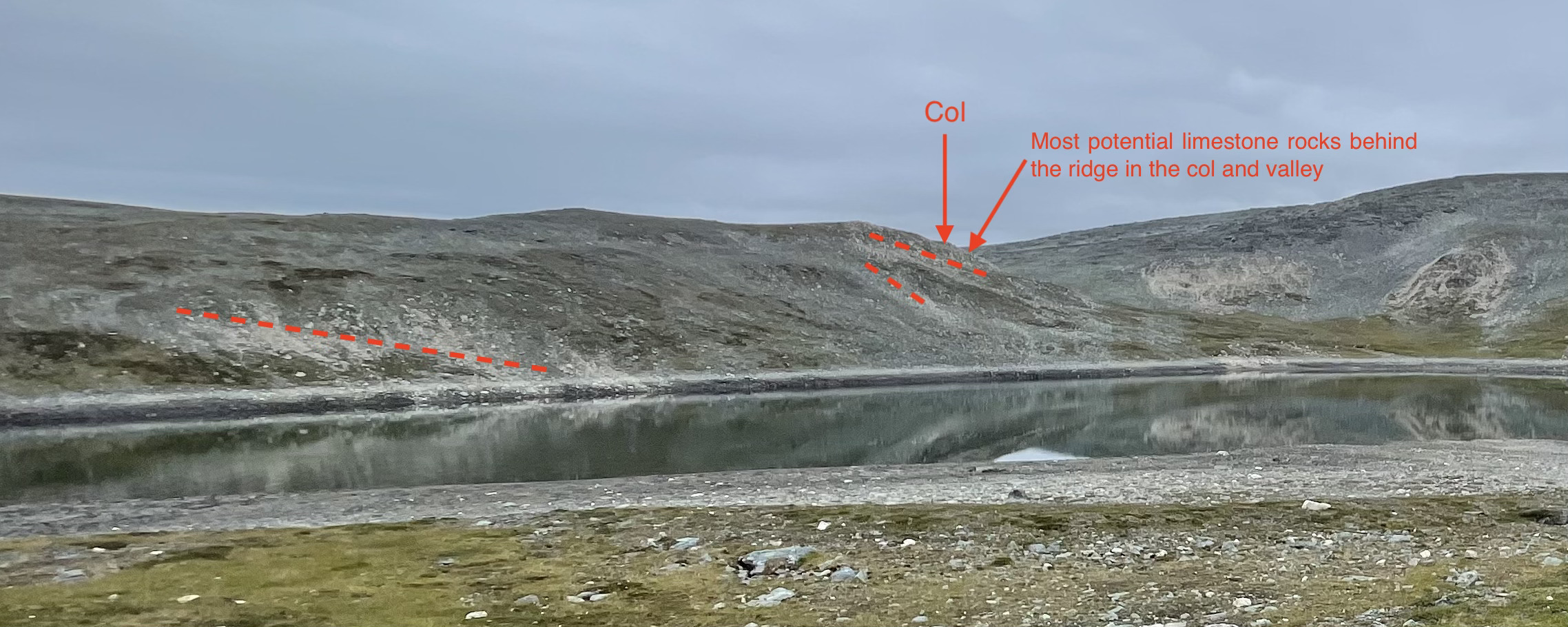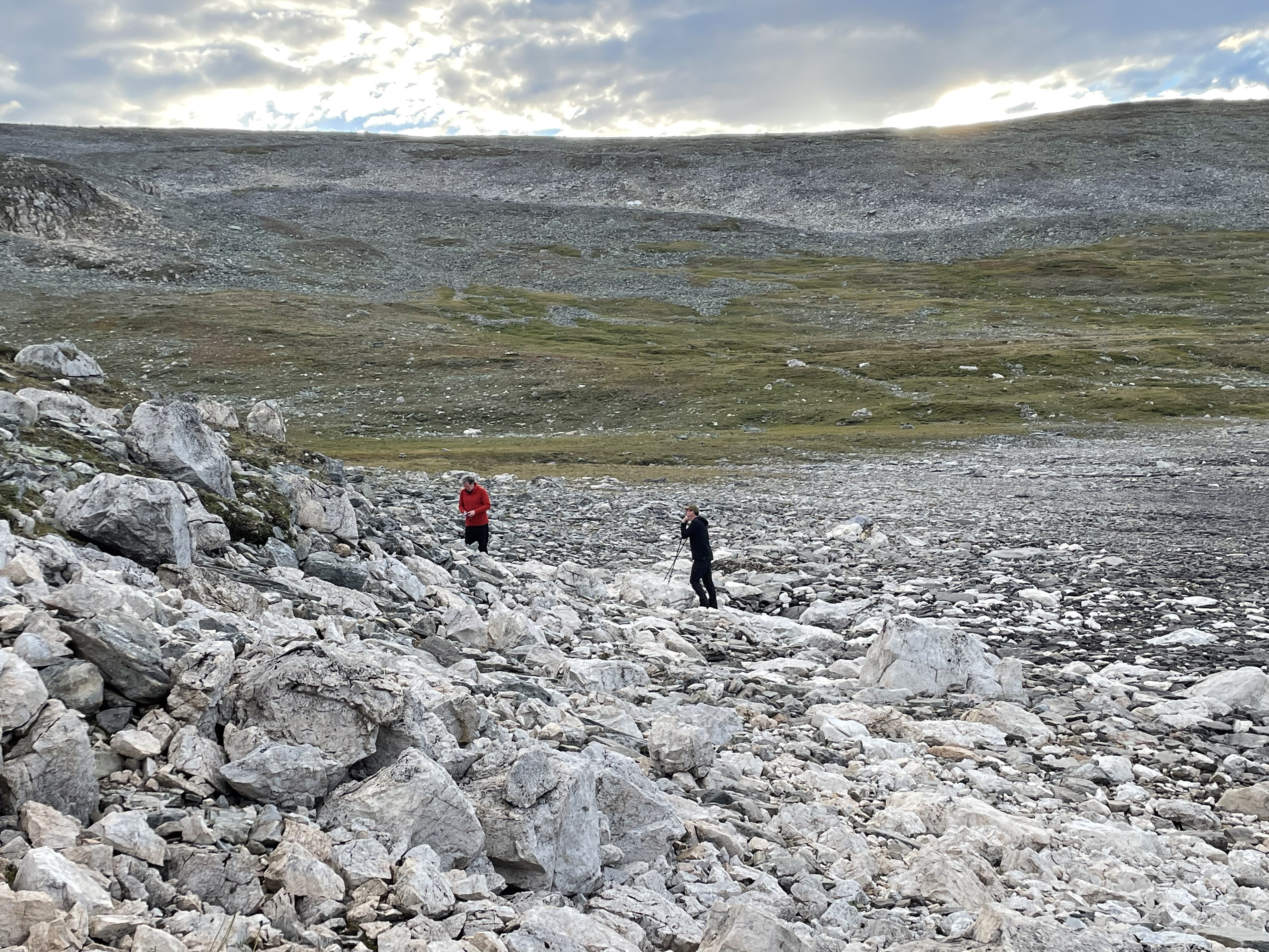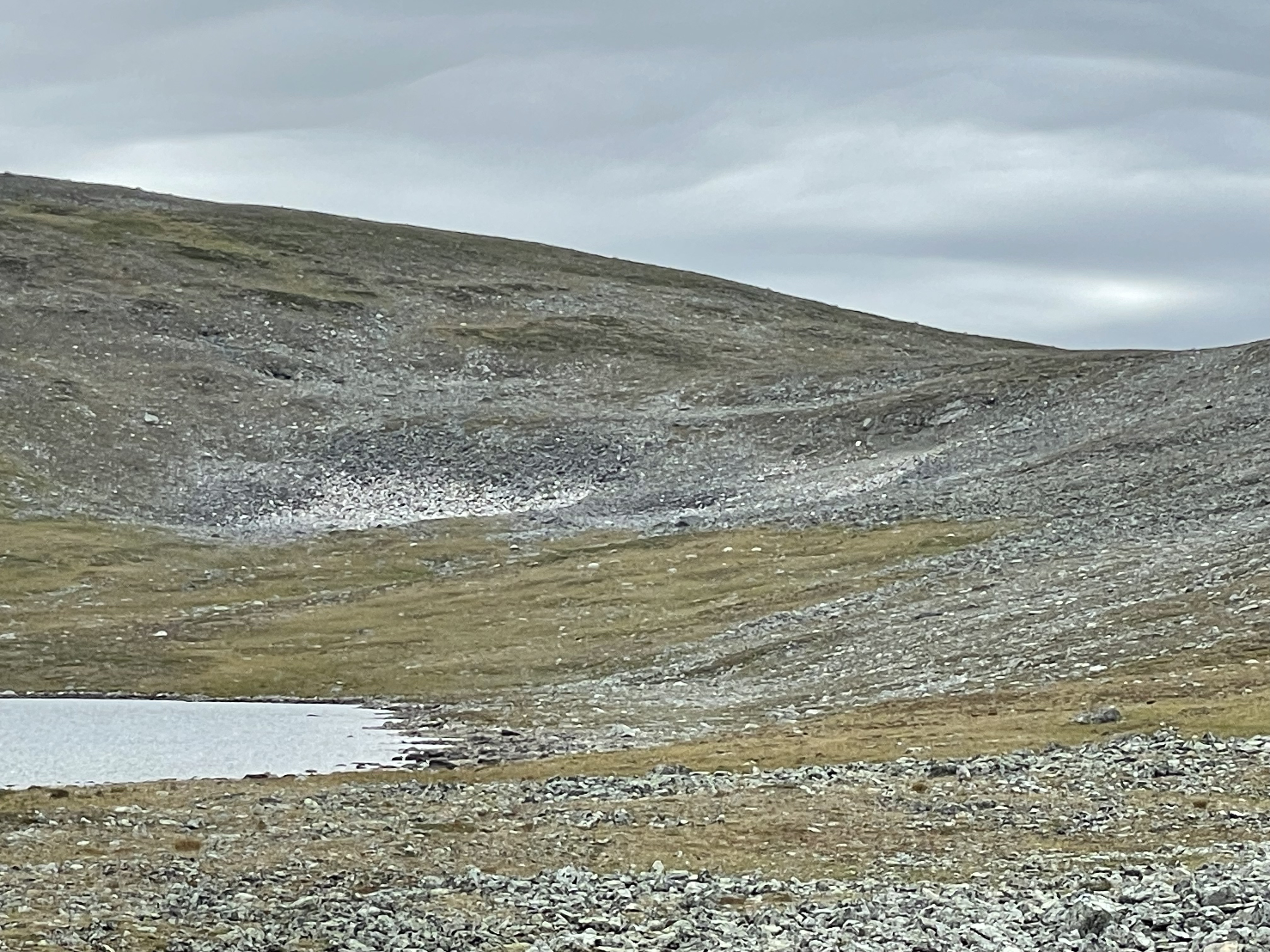 As part of our exploration trip to the Njiellalanjávri area, we scouted all signs of limestone around lakes Njiellalanjávri, Toskaljärvi, Veajetjávrrit, and Láfoljávri lakes, and the mountains in between. In some cases limestone was easy to identify, known to be limestone, in other cases it was not so easy to identify by non-experts. But we think we made a reasonable analysis, and found quite many places where there is at least potential limestone. There's plenty of loose rock pieces that are clearly limestone, but the more interesting target for us were ground rock layers. Or larger collections of potential limestone rock pieces that might indicate a ground rock layer would be somewhere nearby.