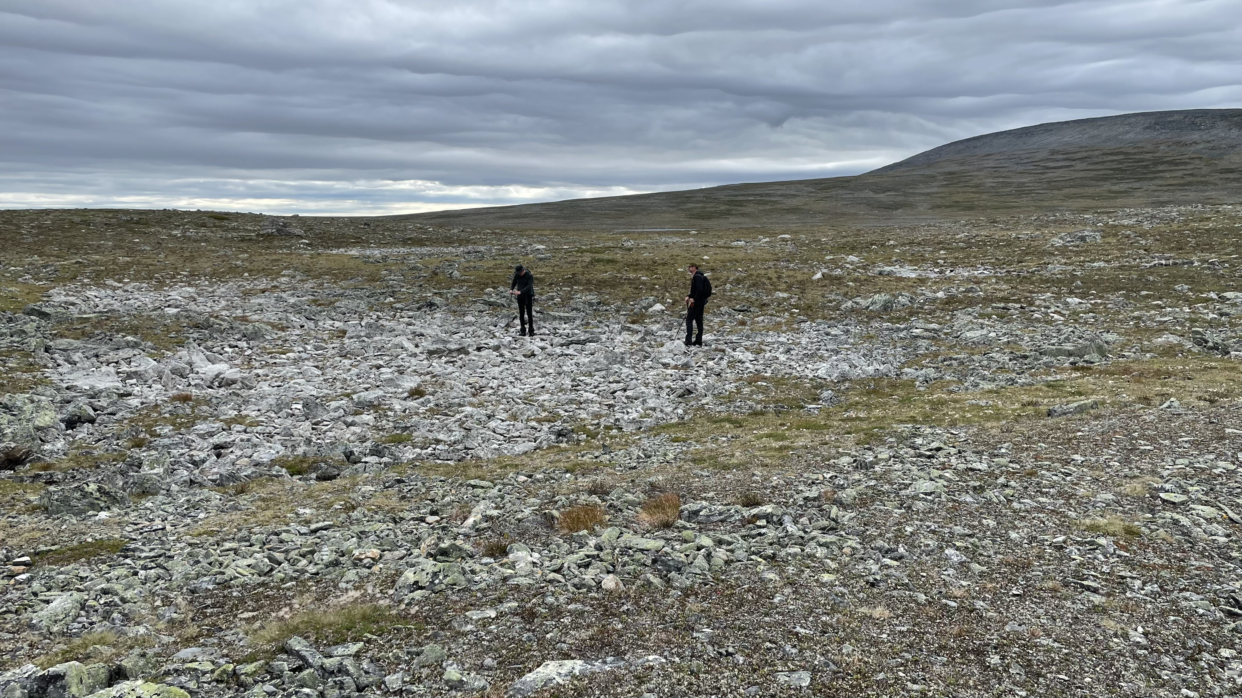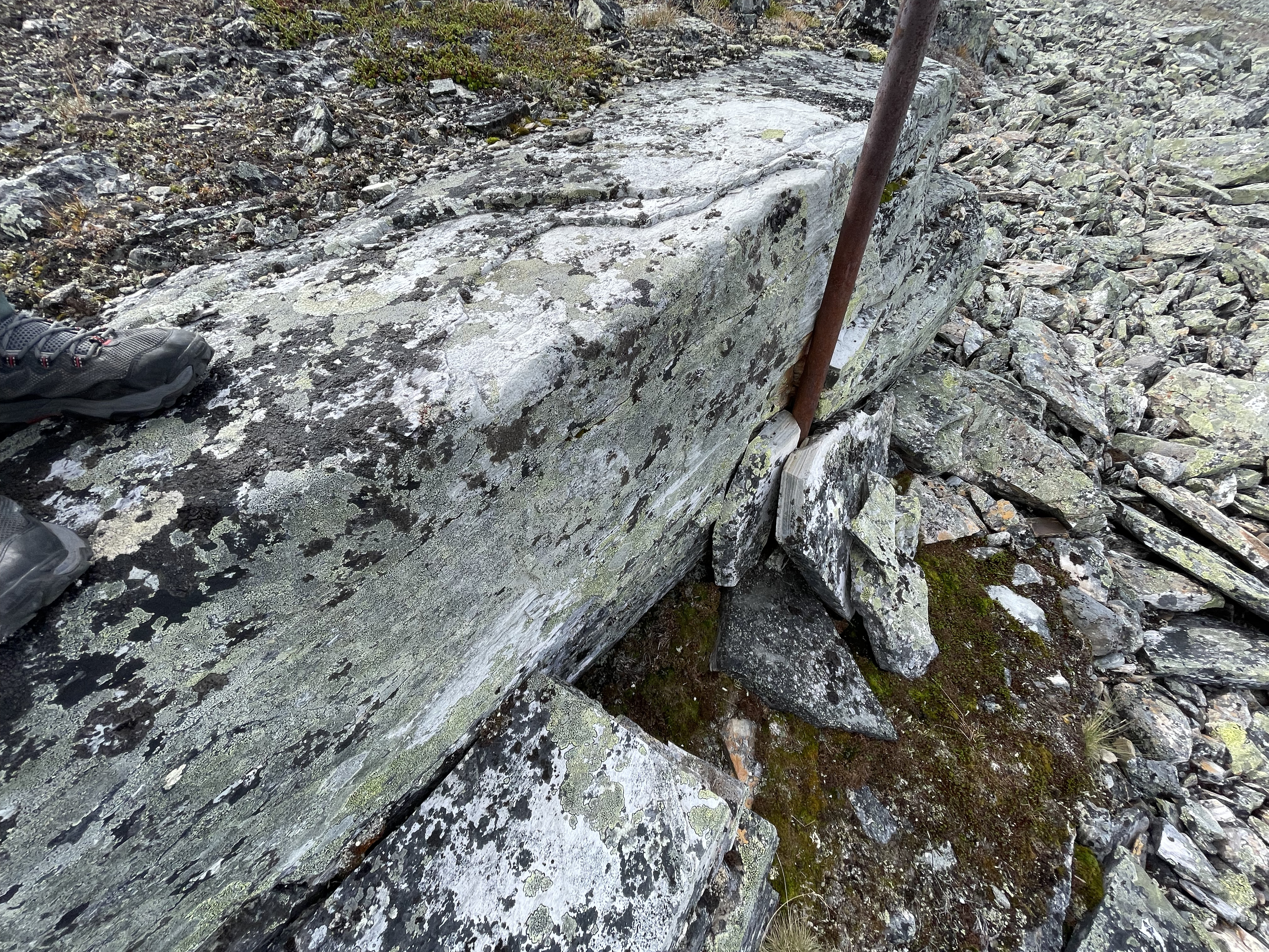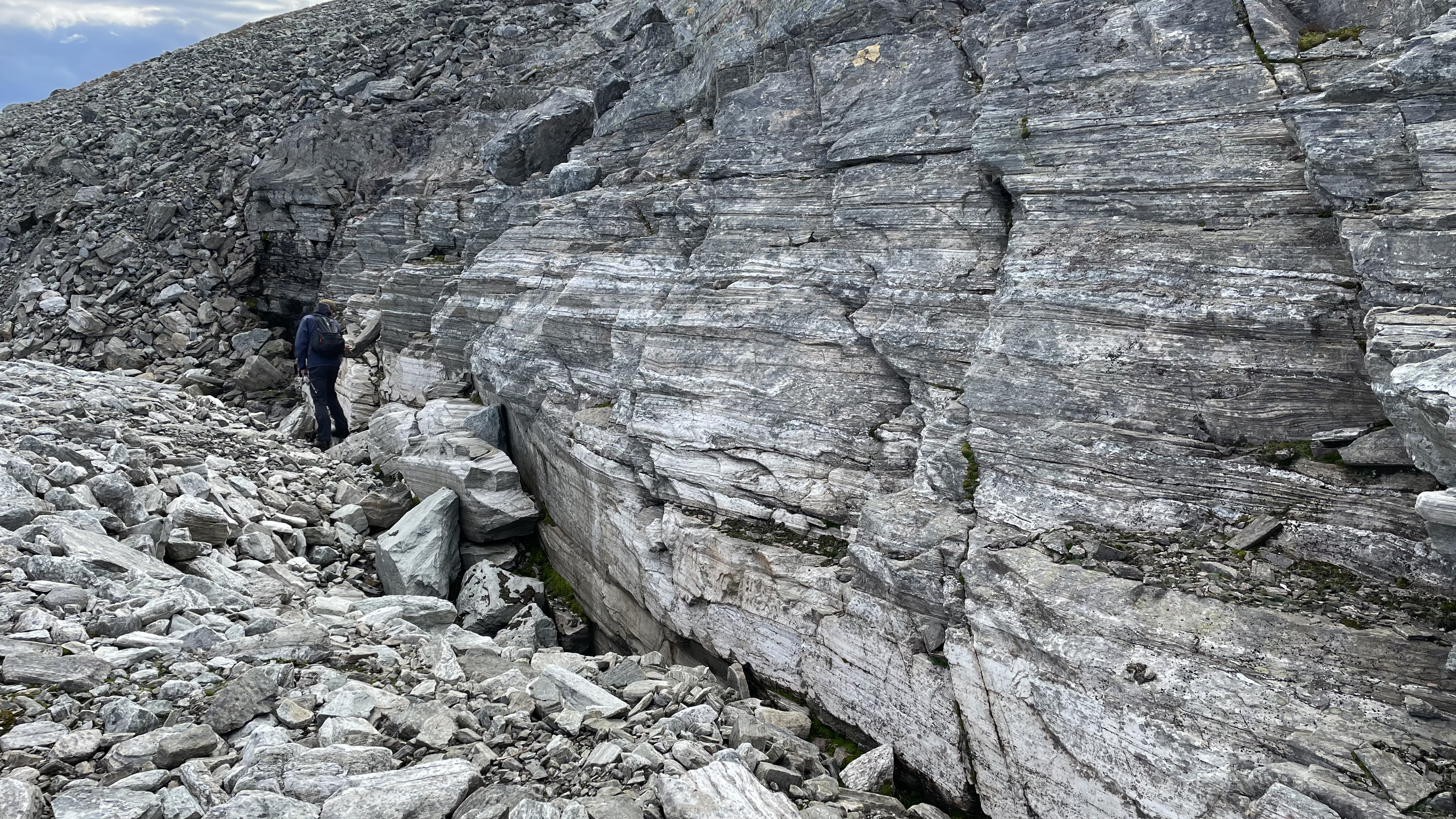 As part of our exploration trip to the Njiellalanjávri area, we scouted all signs of limestone around lakes Njiellalanjávri, Toskaljärvi, Veajetjávrrit, and Láfoljávri lakes, and the mountains in between. In some cases limestone was easy to identify, known to be limestone, in other cases it was not so easy to identify by non-experts. But we think we made a reasonable analysis, and found quite many places where there is at least potential limestone. There's plenty of loose rock pieces that are clearly limestone, but the more interesting target for us were ground rock layers. Or larger collections of potential limestone rock pieces that might indicate a ground rock layer would be somewhere nearby.