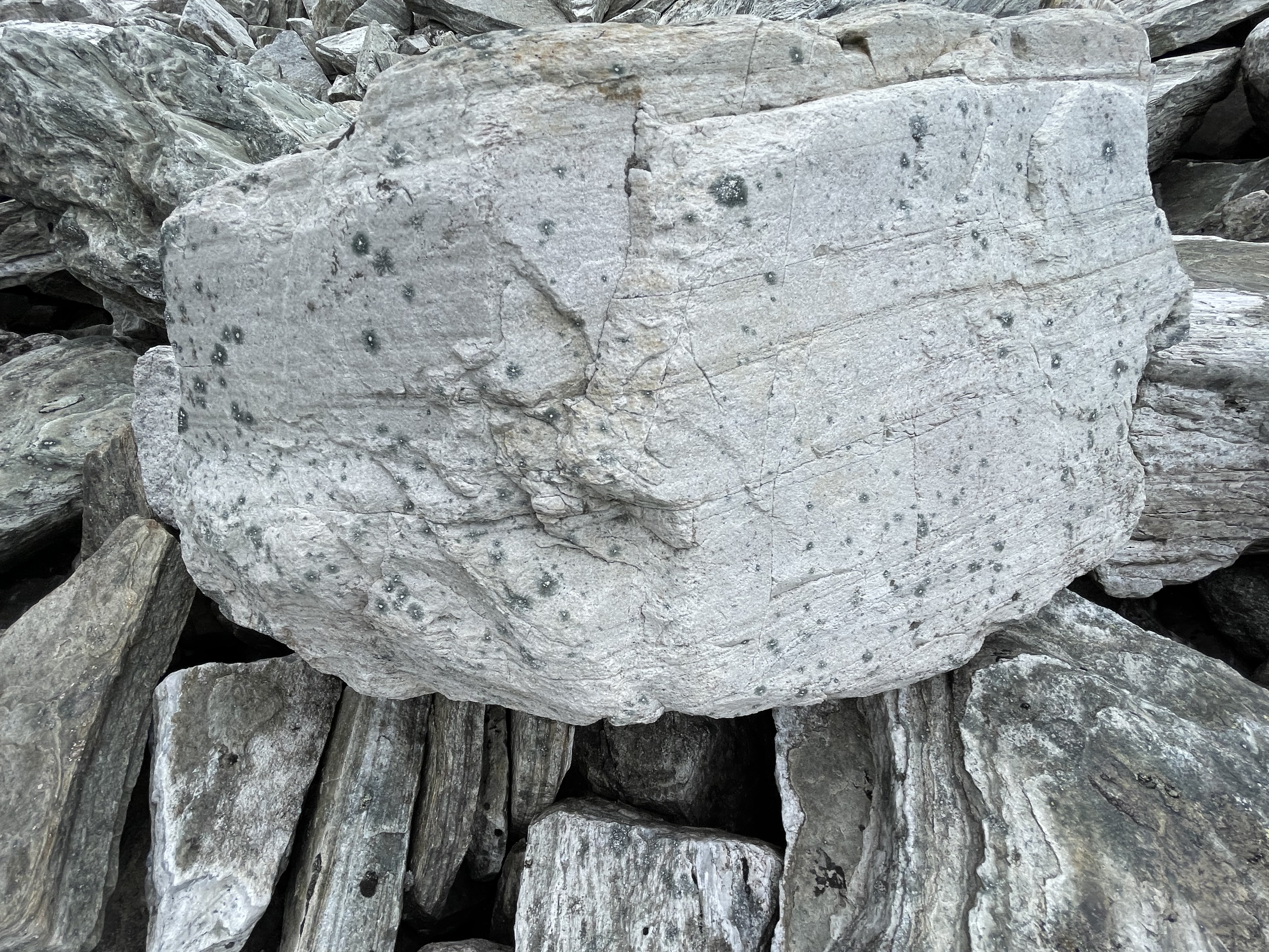 On the lakefront of the Njiellalanjávri there's a large number of large boulders that (we think) are clearly limestone - or perhaps even some softer form of the rock, the smaller ones seem very soft. While the beach is covered with the loose boulders piled on top of each other, we believe that right behind the boulder field there are parts of more stationary, ground rock visible. These rocks are where the green grass turns into the rock field.