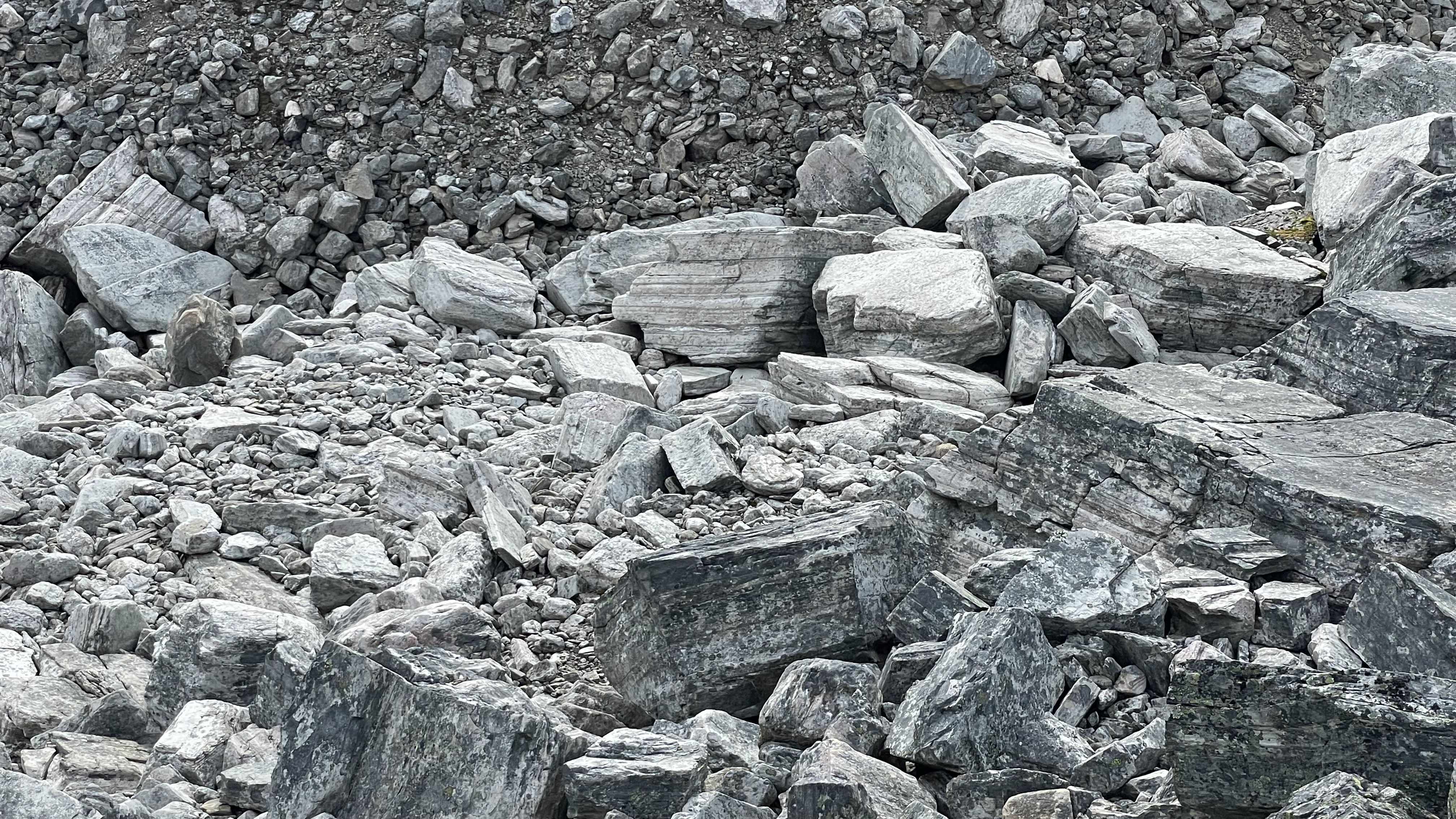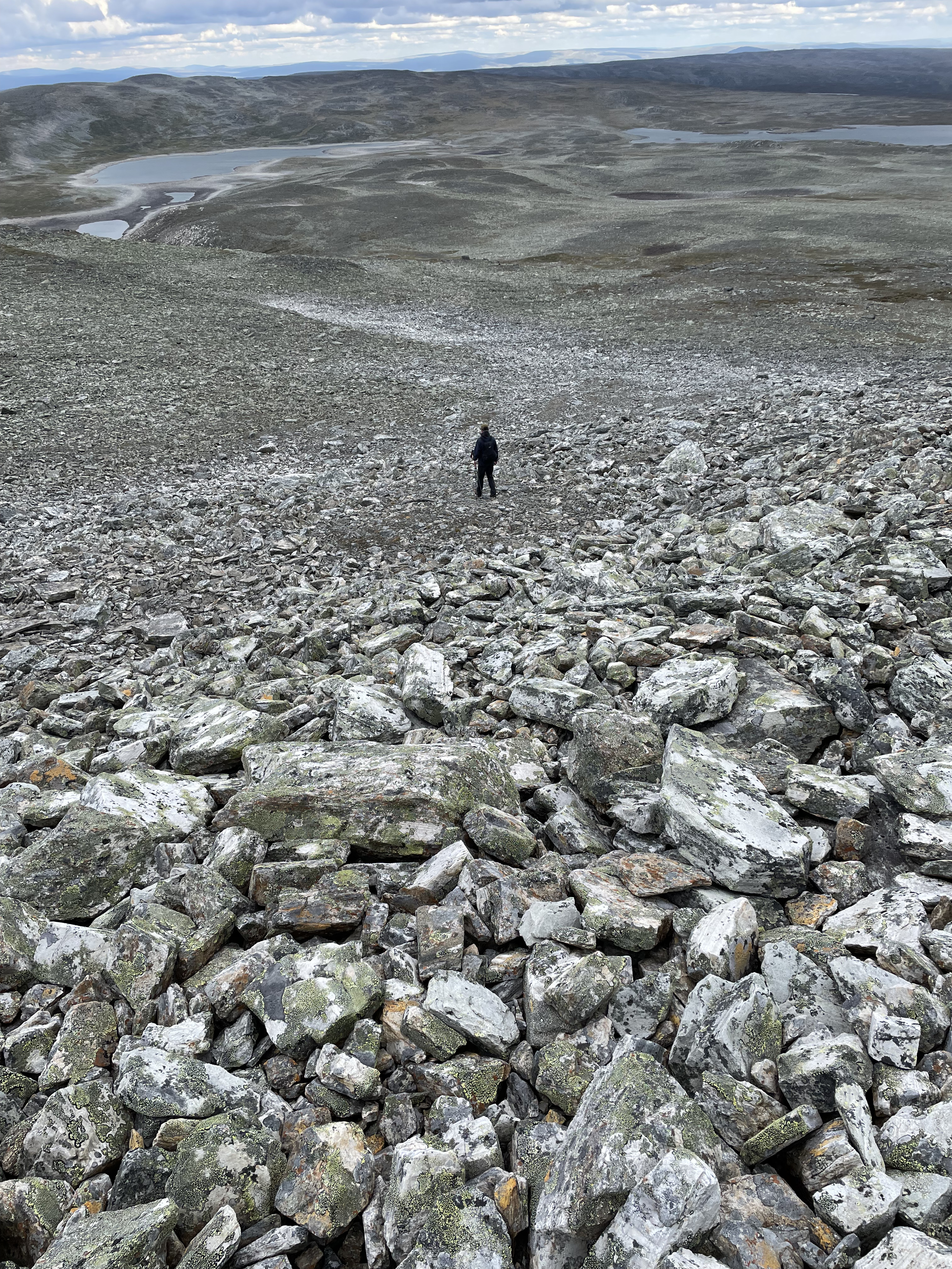 It is also interesting to look at the broken rock flows. As if something broke up higher, above the current outcrops, and then fell as loose rock in a "river" flowing down almost to the lake. When viewing the rocks above the higher outcrop in the picture, we found several rocks that could be part of ground rock layers, and not just boulders.