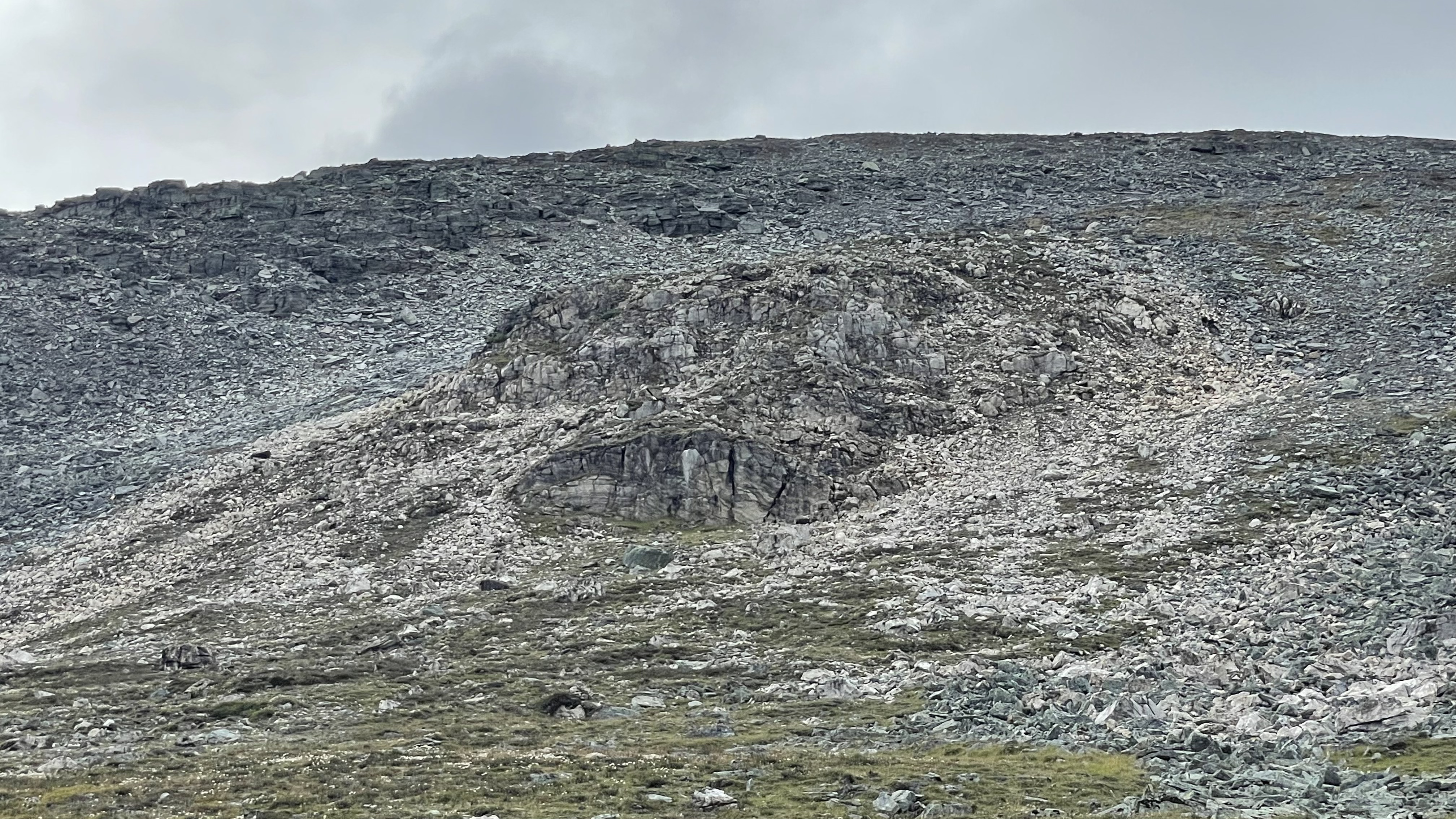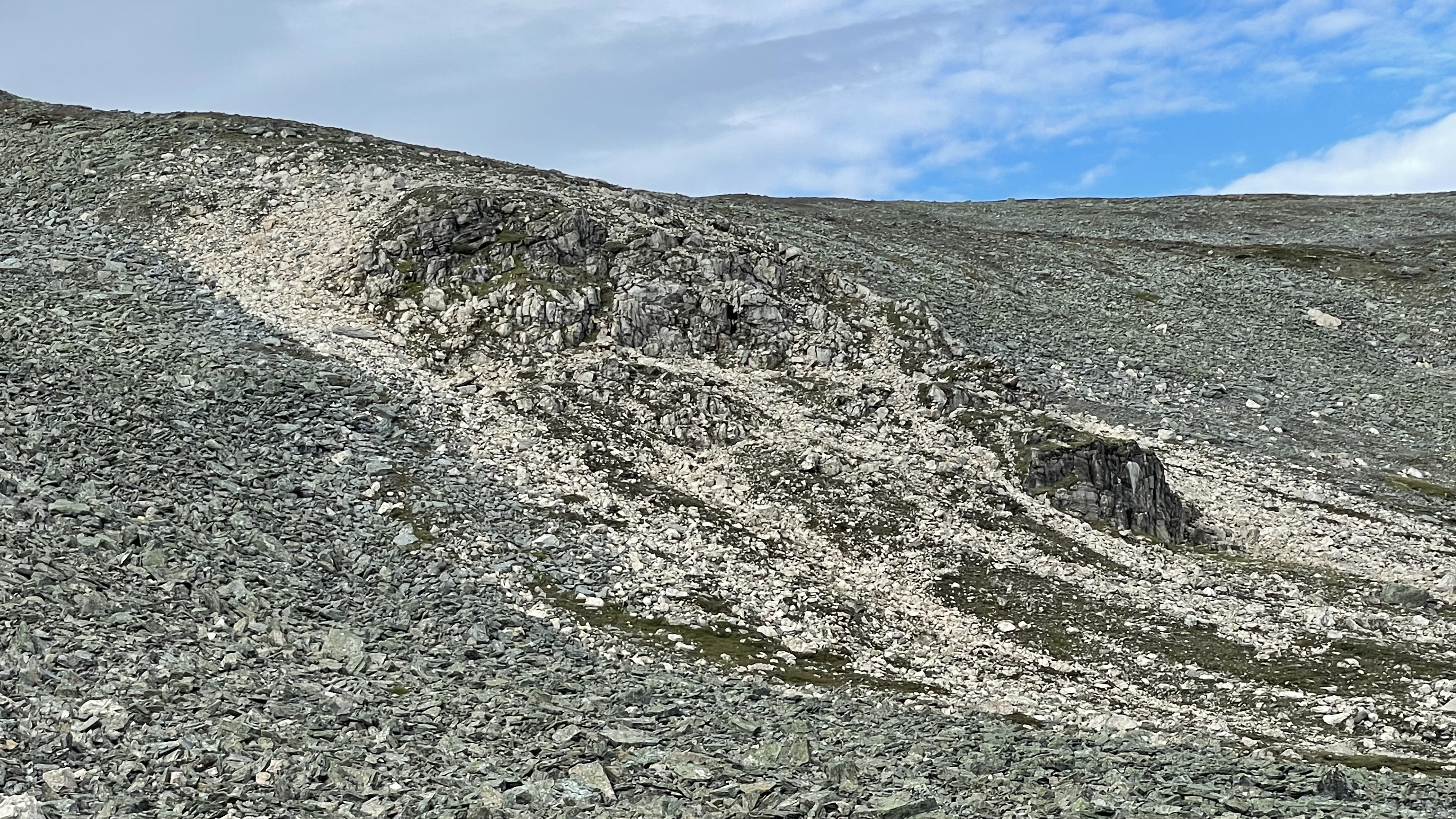 There are four rock outcrops in the hill rising from Njiellalanjávri northwest towards Láforvárrit and Láforjávri. They are roughly in line with each other, presumably part of the same rock layer.