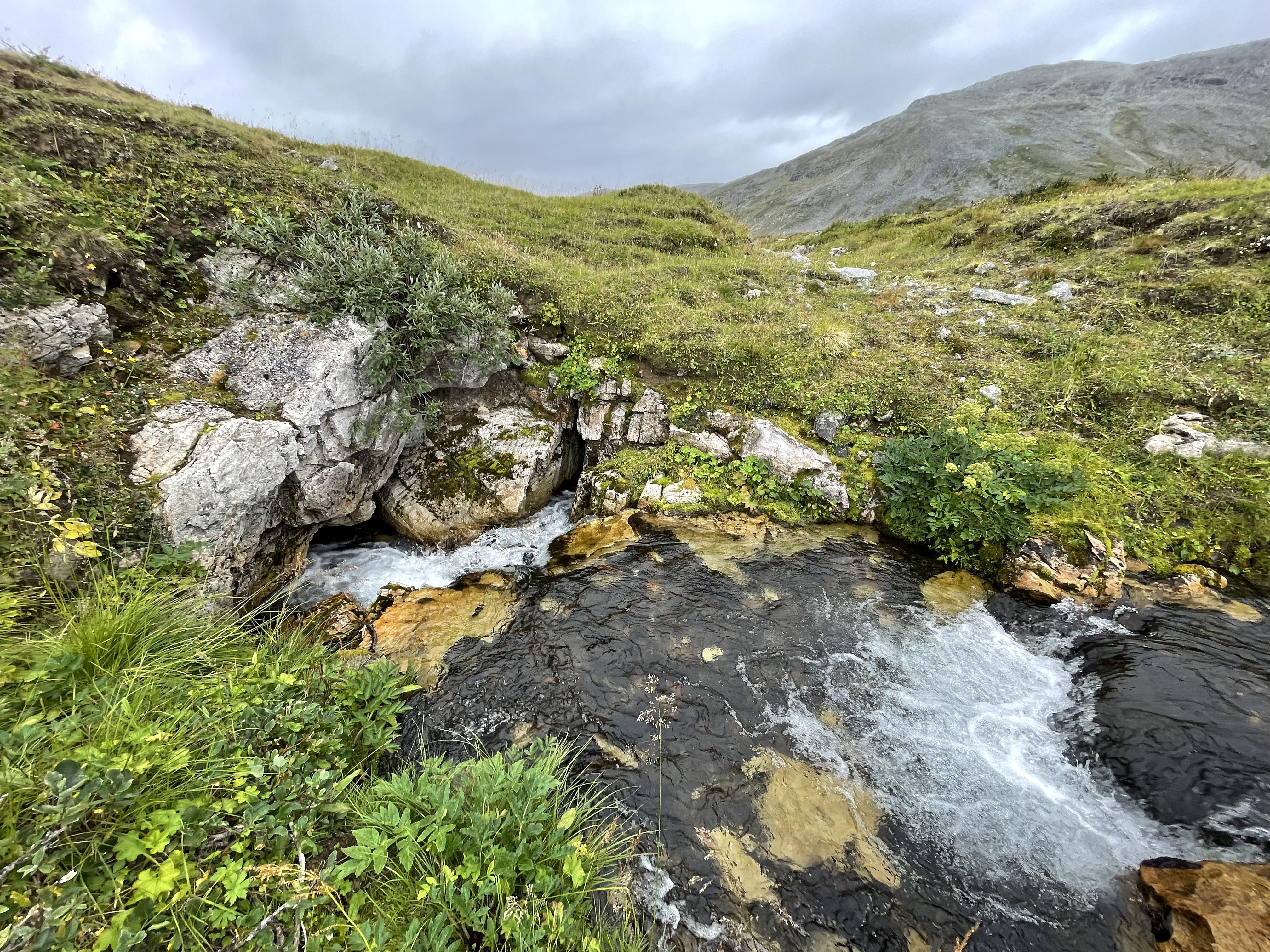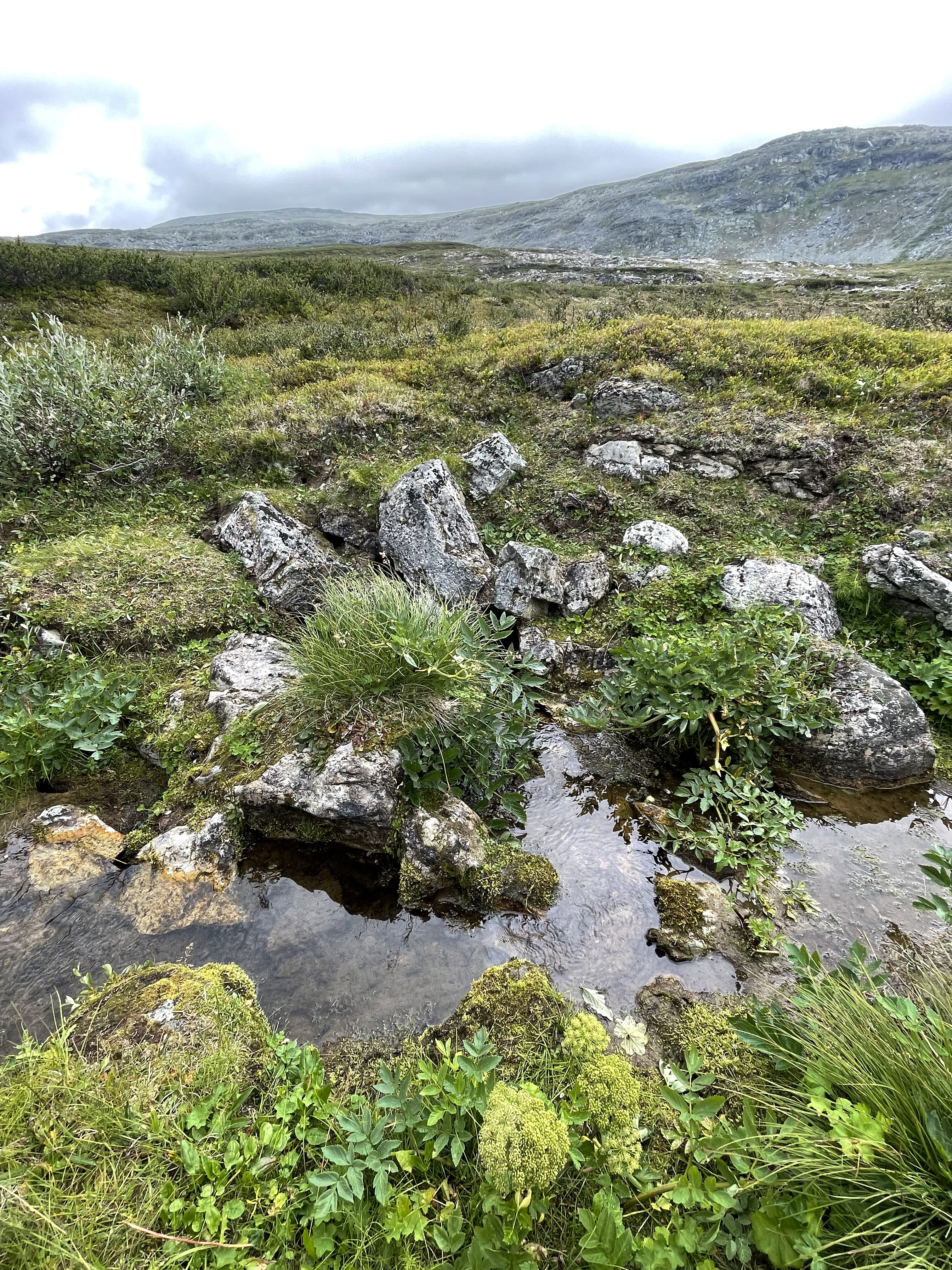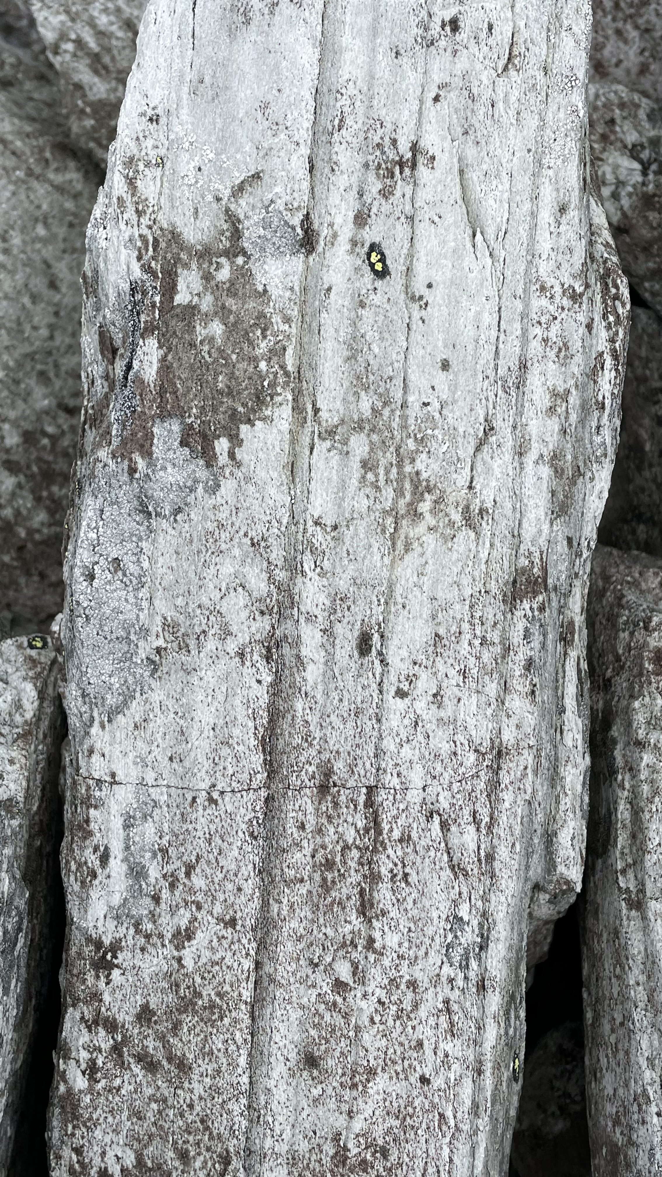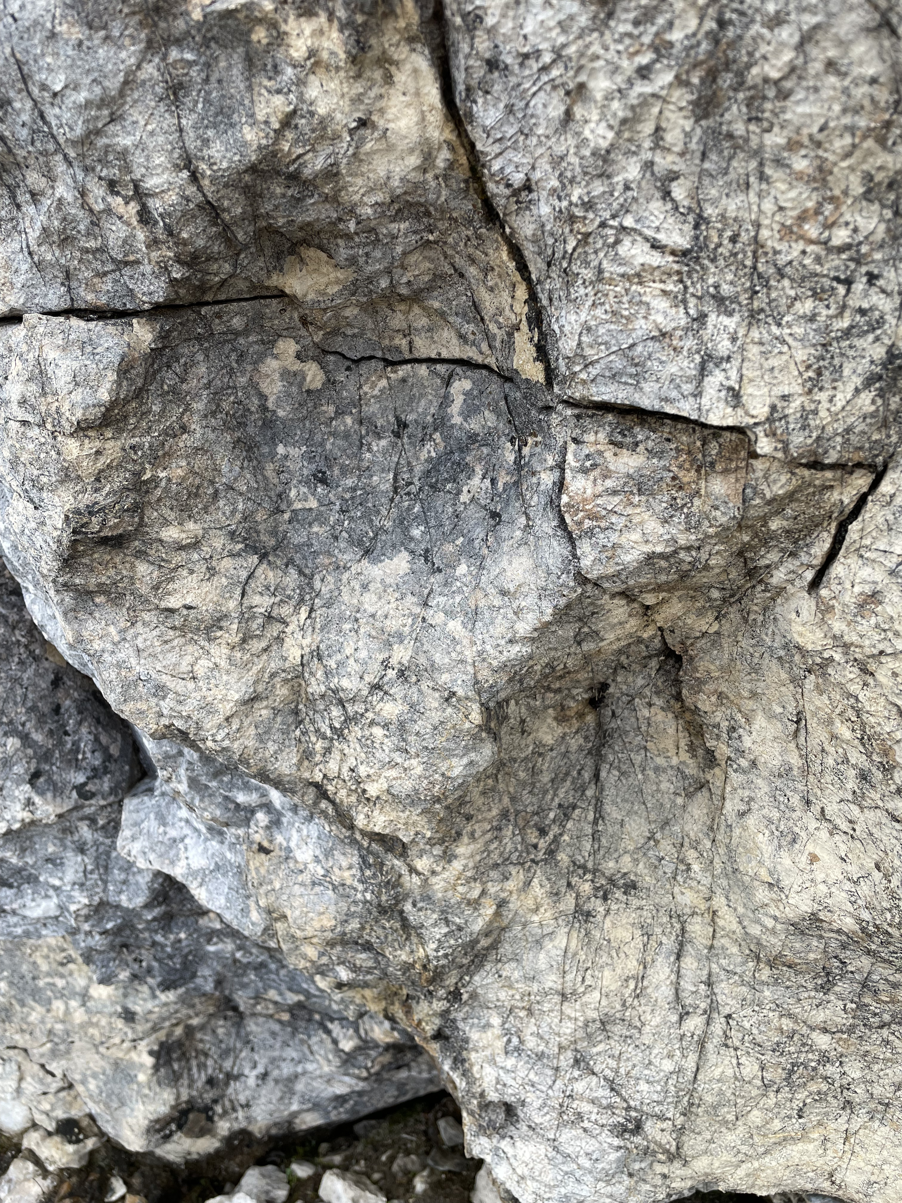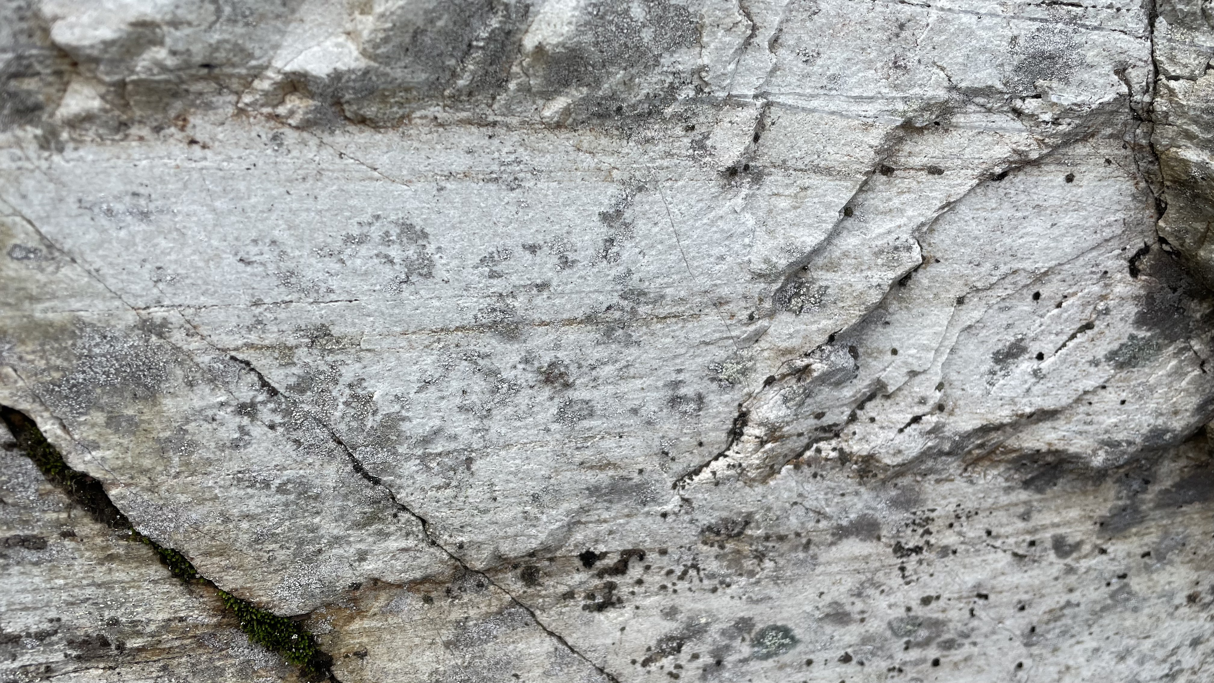There's another theory as well, however. We noticed that on Google maps satellite picture, the late snow patches seems to match roughly where the whiteish rock stripes are. Could snow be causing different moss growth or other reason that makes these rocks appear whiter? But the above rock does look like limestone...