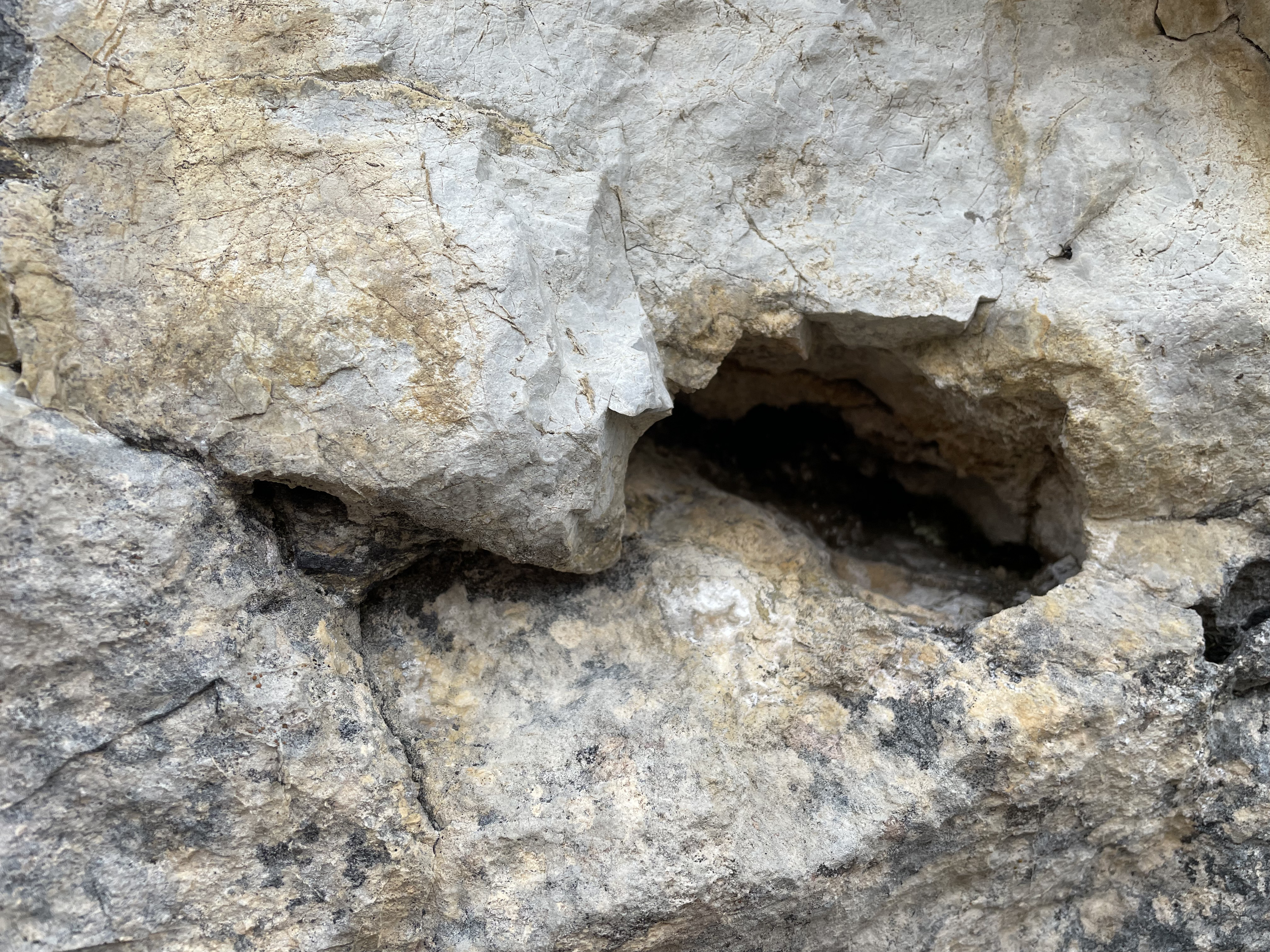 Flowing down from a small "caveat" there's a dried-up river in the ridge. Uncertain if the rock is limestone, but some of it is quite white: